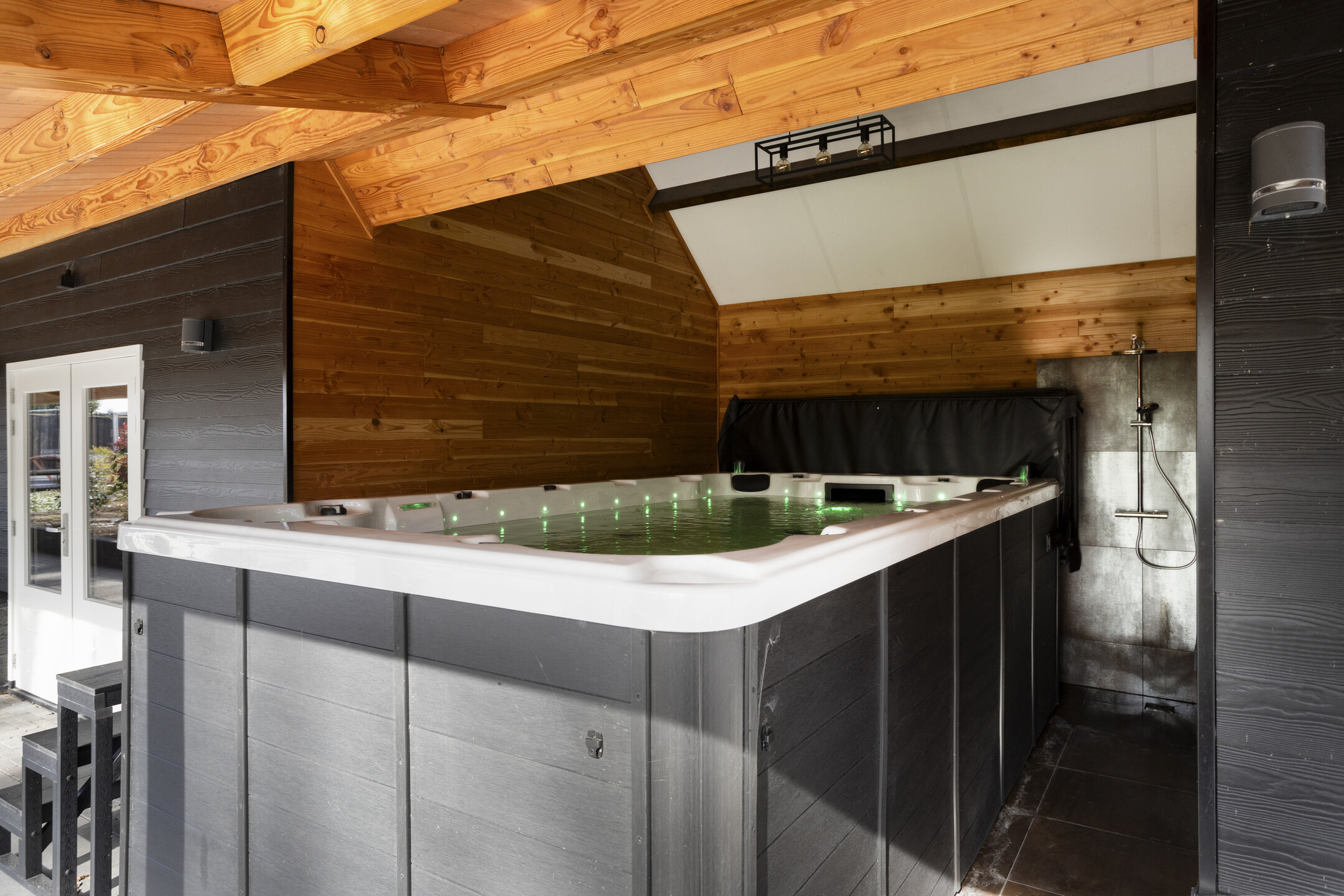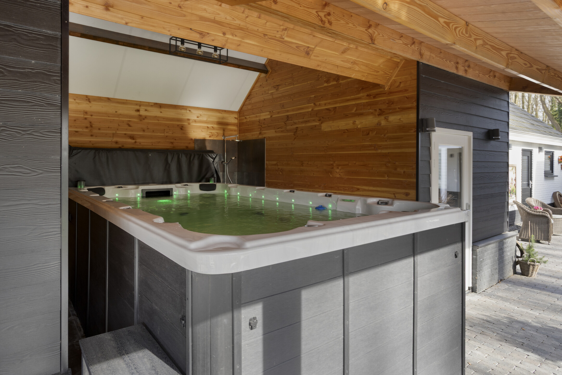An open area with a luxury swim spa (included), featuring a counter-current system for both training and relaxation