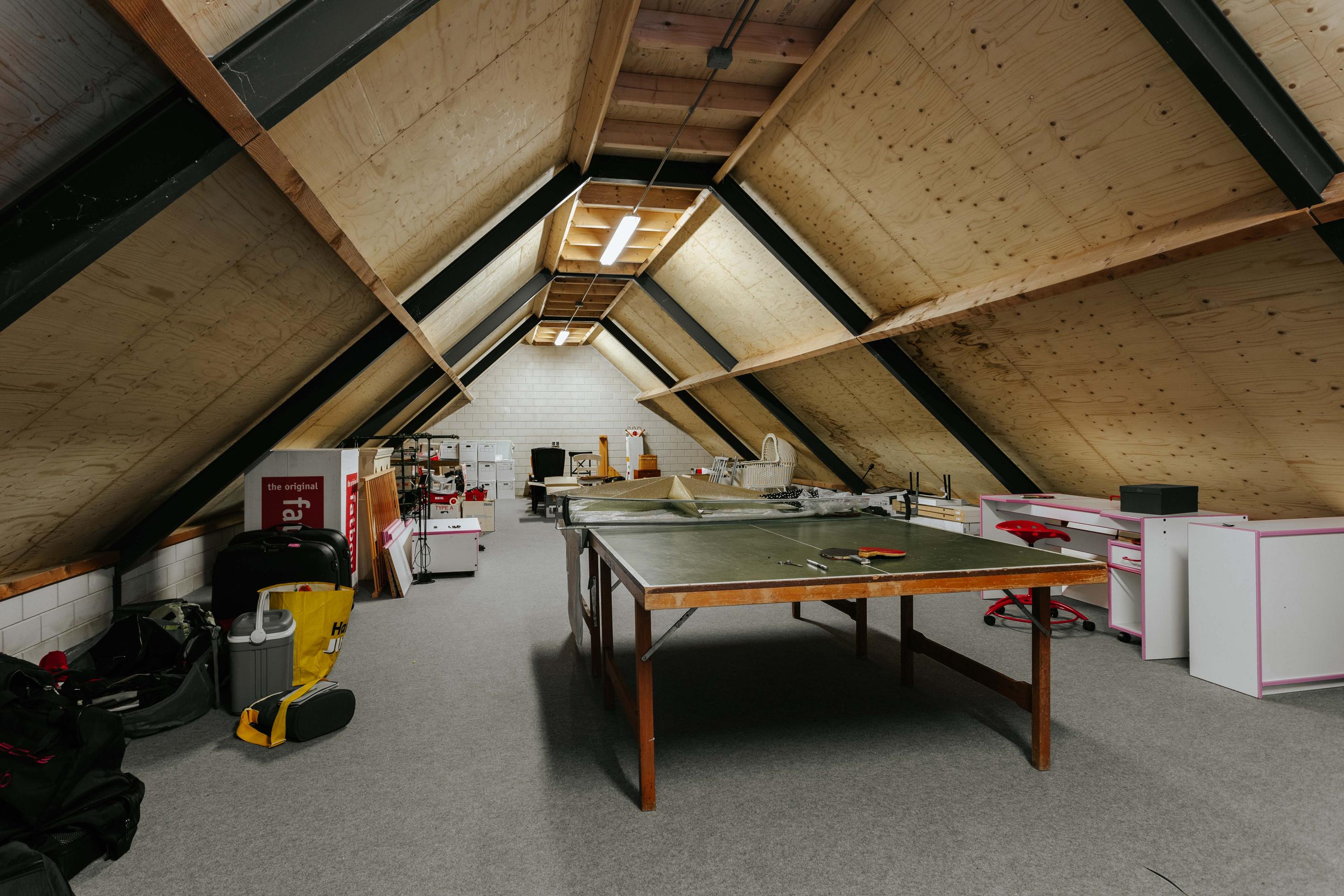 The attic is accessible via a loft ladder and houses the central heating boilers, the hot water boiler, and the motor for the professional extractor hood.