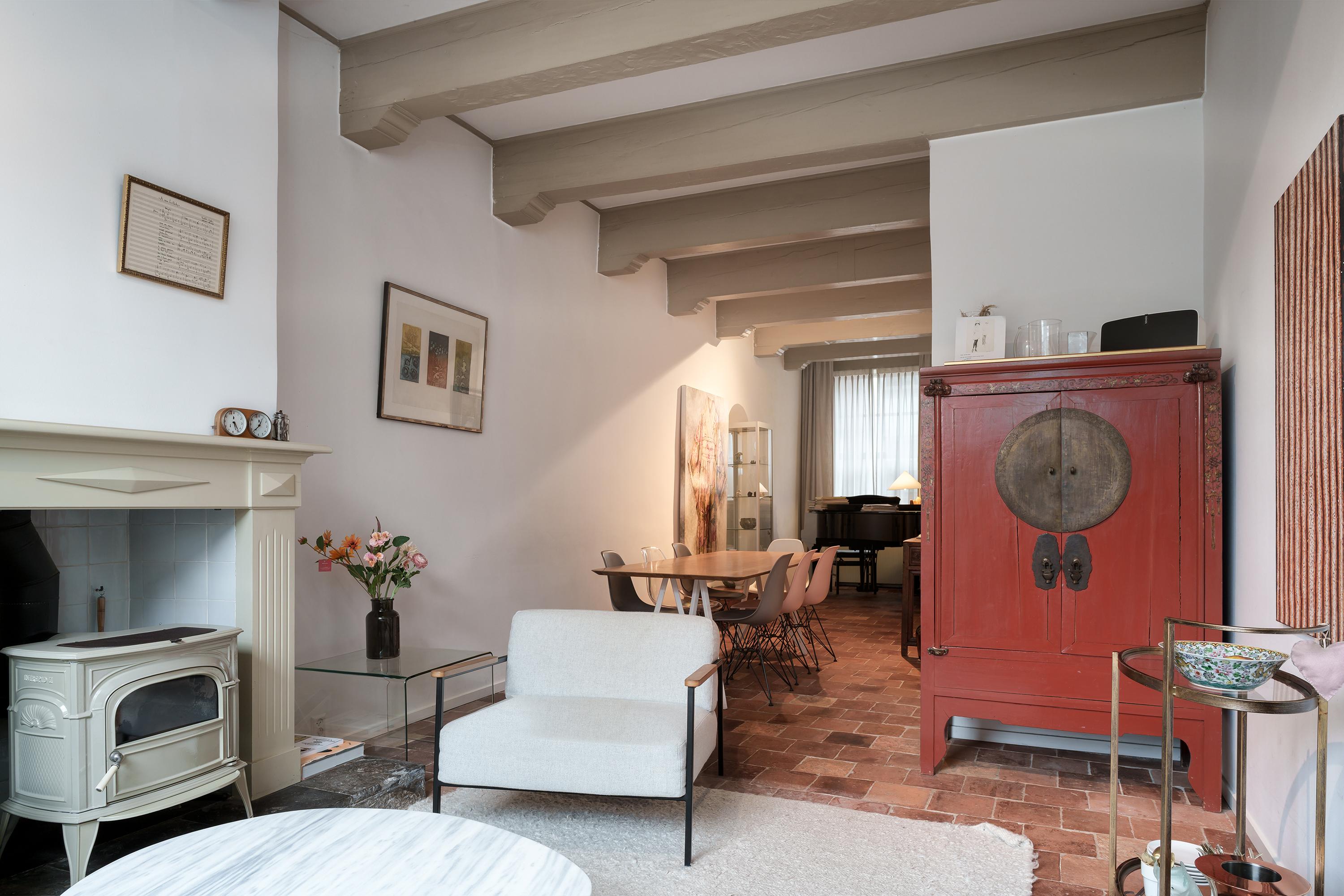 On the right-hand side, you enter the living room. This fairly deep space is therefore used in two parts. The front part (street side) is now a lovely space where the grand piano stands. The rear of this living room is a lovely, cosy sitting/living area. This living room is located at the rear (garden side) and has a large sliding window for wonderful light and a view of the courtyard garden. This living room also has a cosy wood-burning stove and, once again, a beautiful beamed ceiling. An antique French terracotta tiled floor that continues into the living-dining kitchen perfectly matches the monumental character of the house.