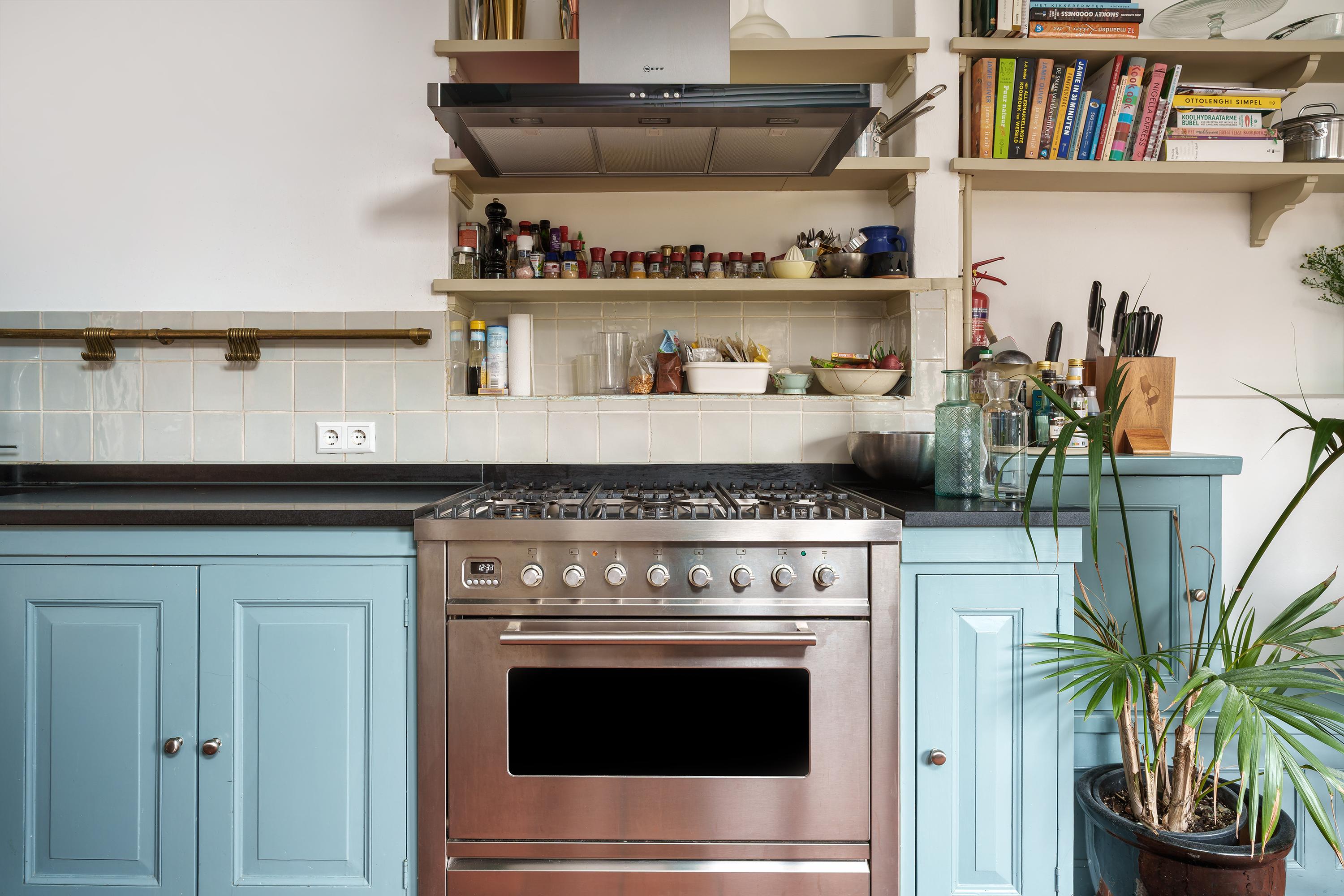 The country-style kitchen is equipped with a Quooker and a gas stove with oven and is directly connected to the living area and also to the central hall. This makes this space the real central living area of the house. A fixed dining bench has been installed here, creating a cosy dining area. The kitchen also has built-in cupboard space. From the kitchen, you have access to the outdoor area and the adjoining study. A nice detail: the beautiful façade in this kitchen, which features an old farmhouse door (two parts that open) with a skylight, beautiful old hinges and locks, and windows that provide plenty of light and, above all, atmosphere.