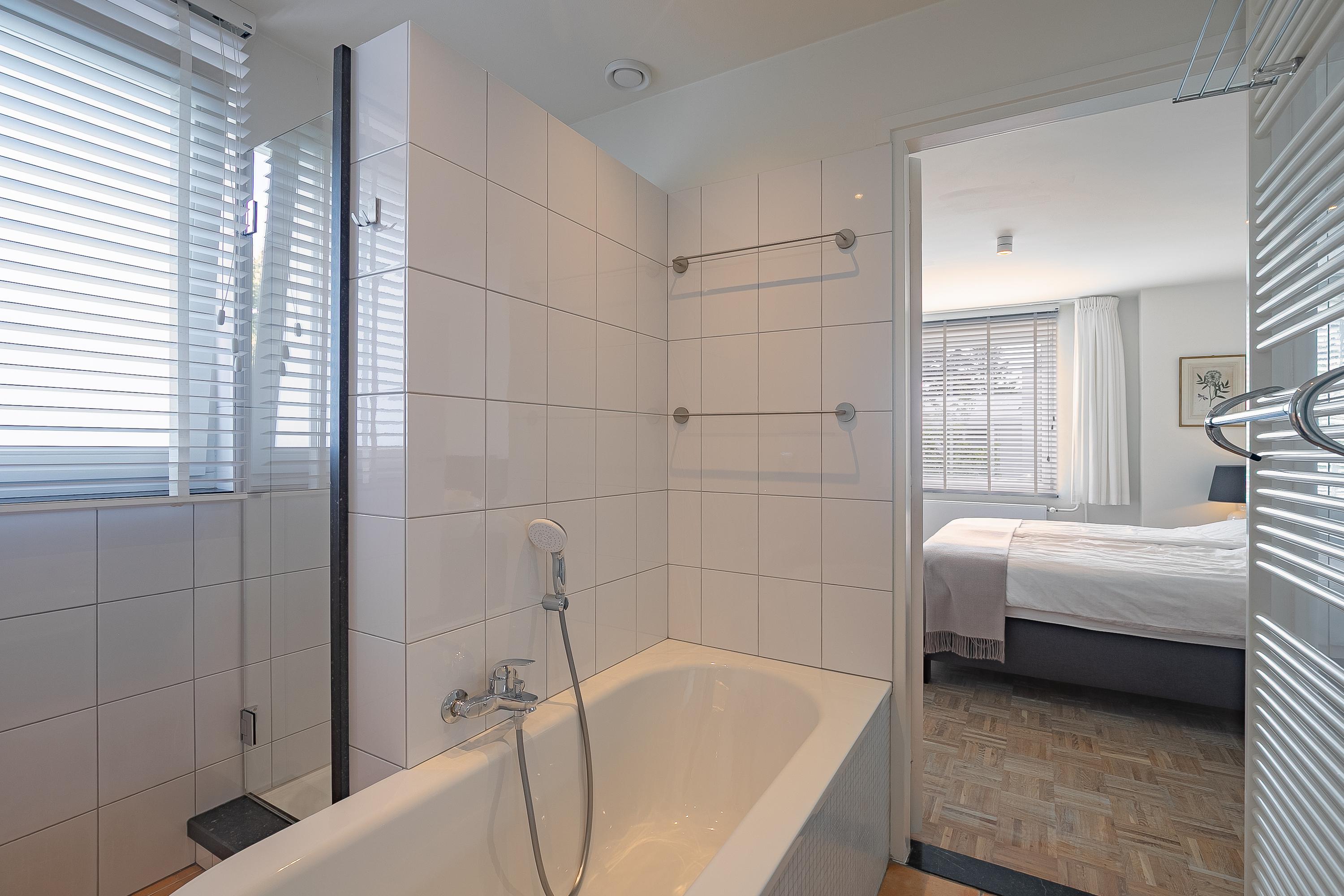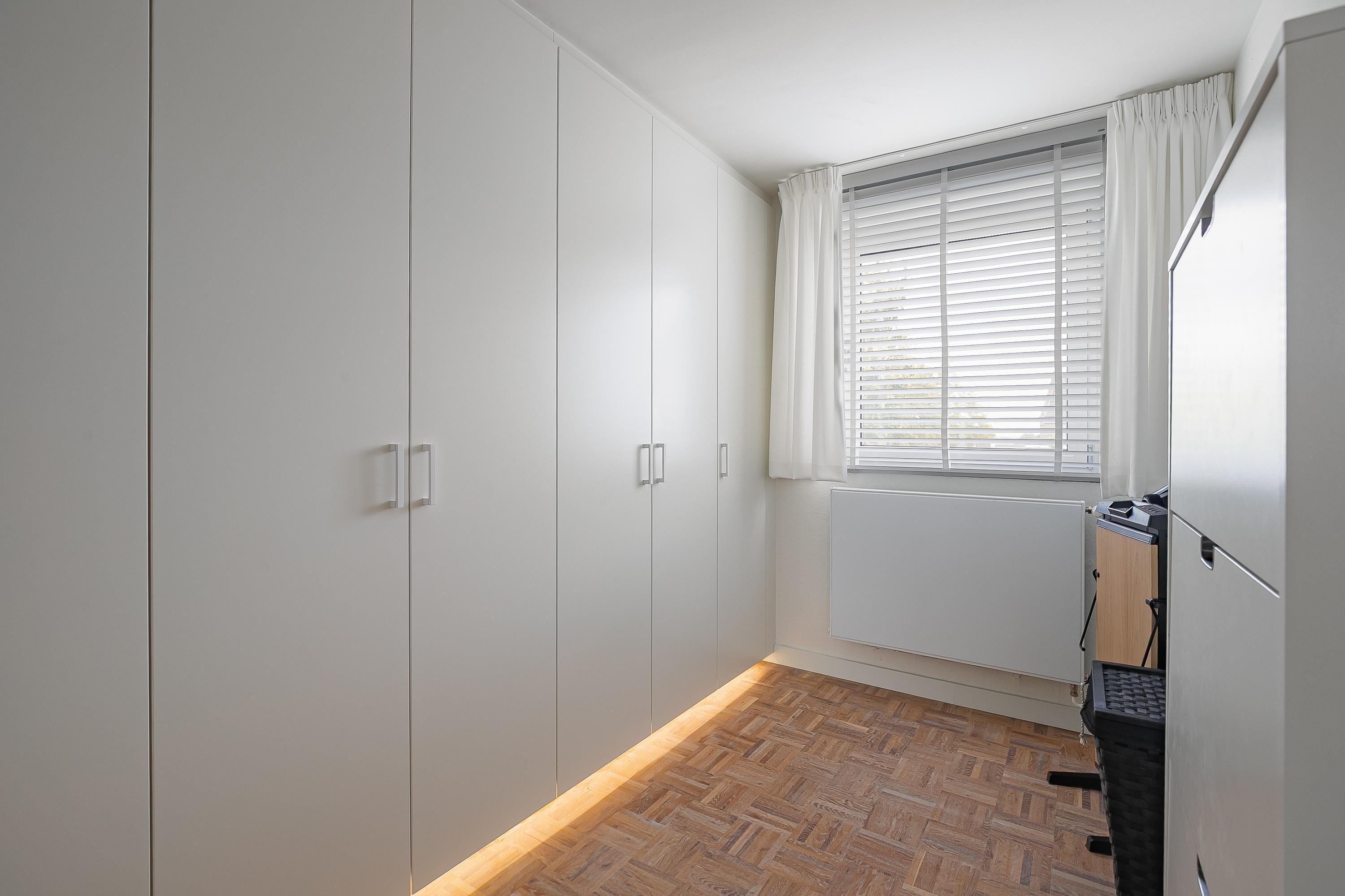 The spacious passage leads to four comfortable bedrooms (approx. 6.7, 8.5, 11.5 and 14.5 m²). The walk-in closet room and the office are equipped with custom-made, stylish built-in cupboards from Slangen Interieurbouw. The other rooms are also practically furnished. The bathroom features mechanical ventilation and is equipped with a bathtub, a walk-in shower, a double sink, and a wall-mounted toilet. All rooms have aluminium window frames with HR++ glazing and are stylishly fitted with mosaic parquet flooring.