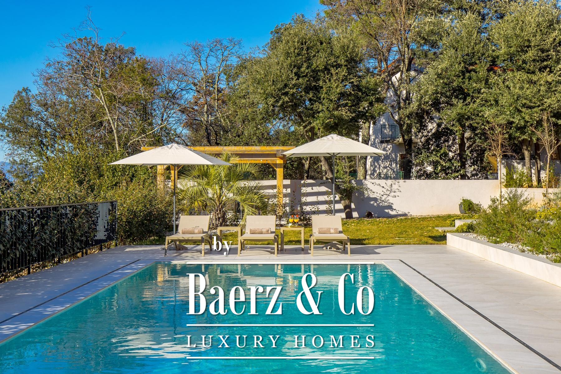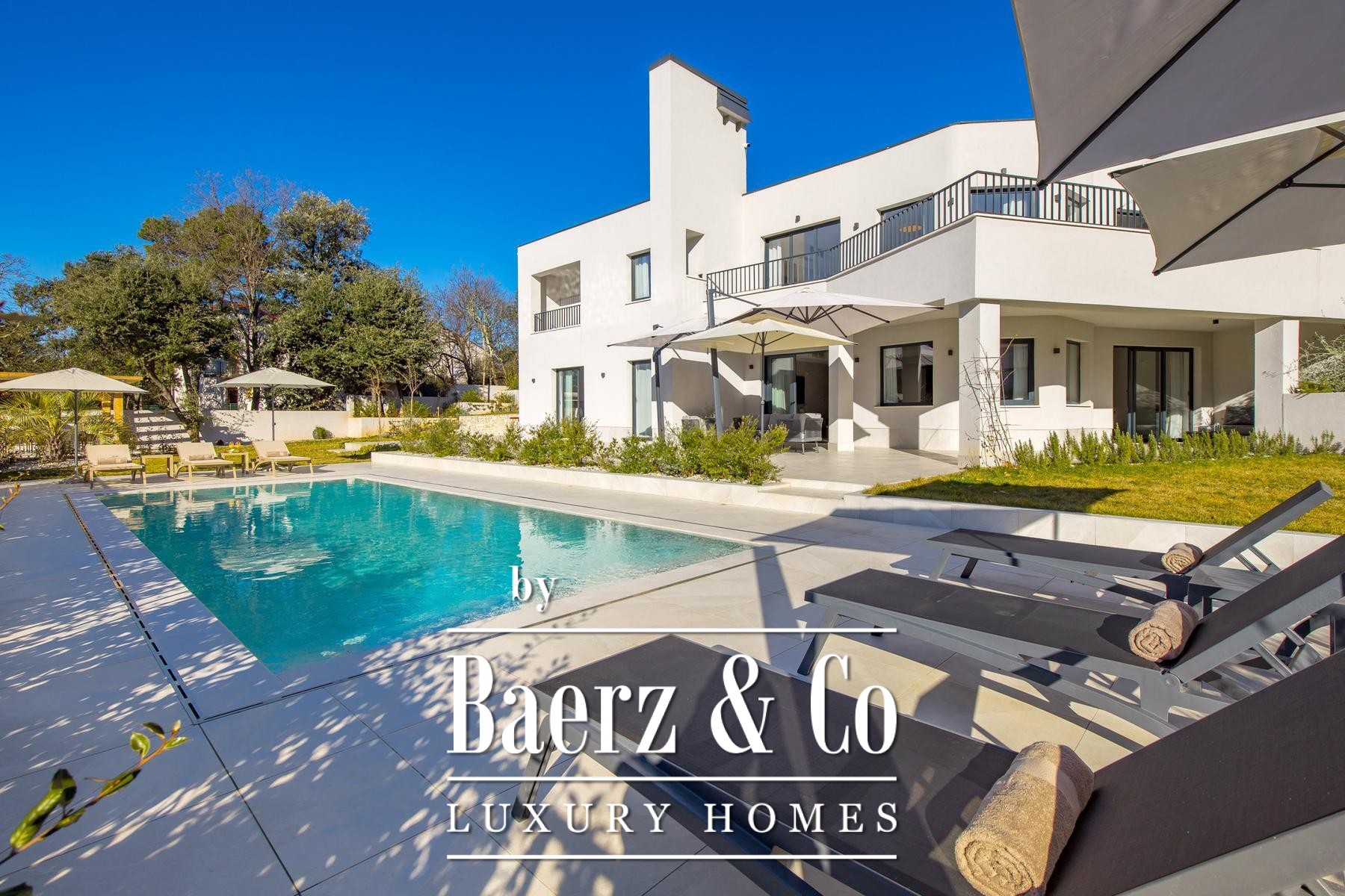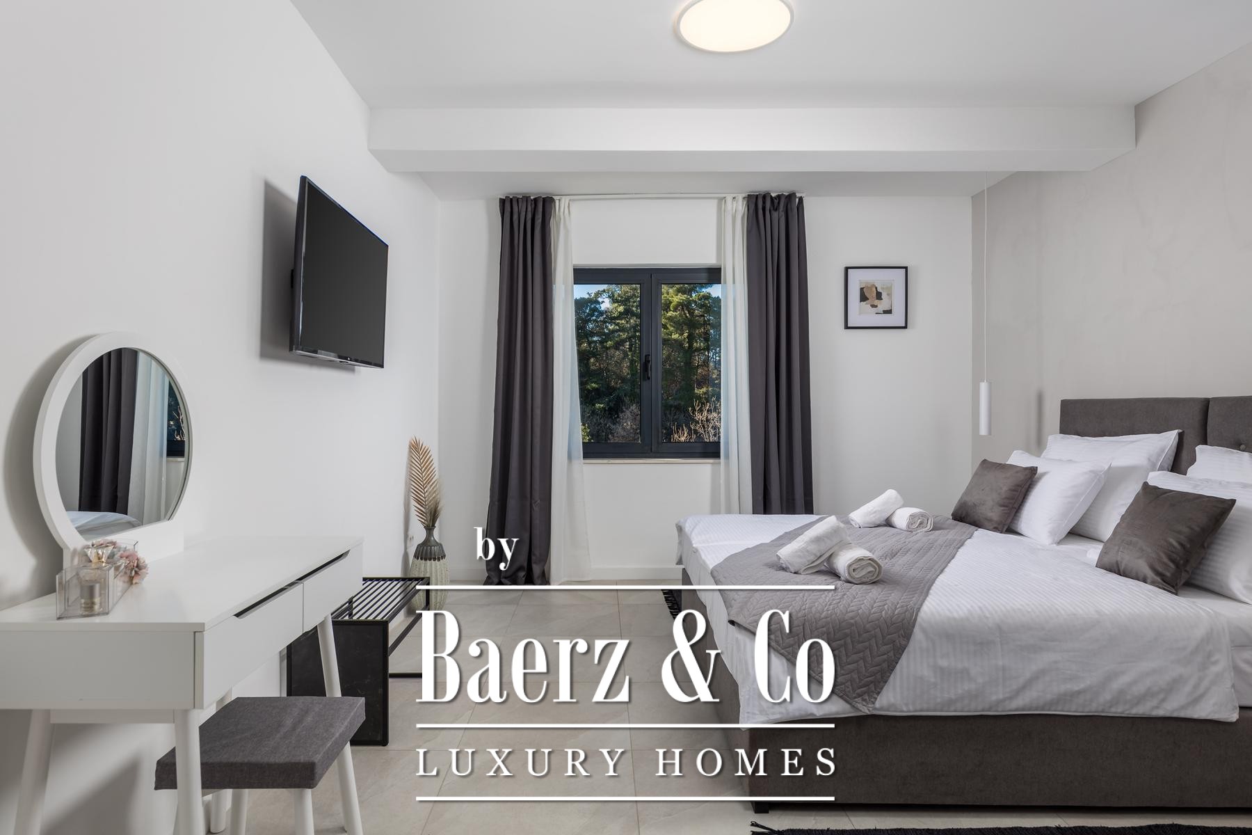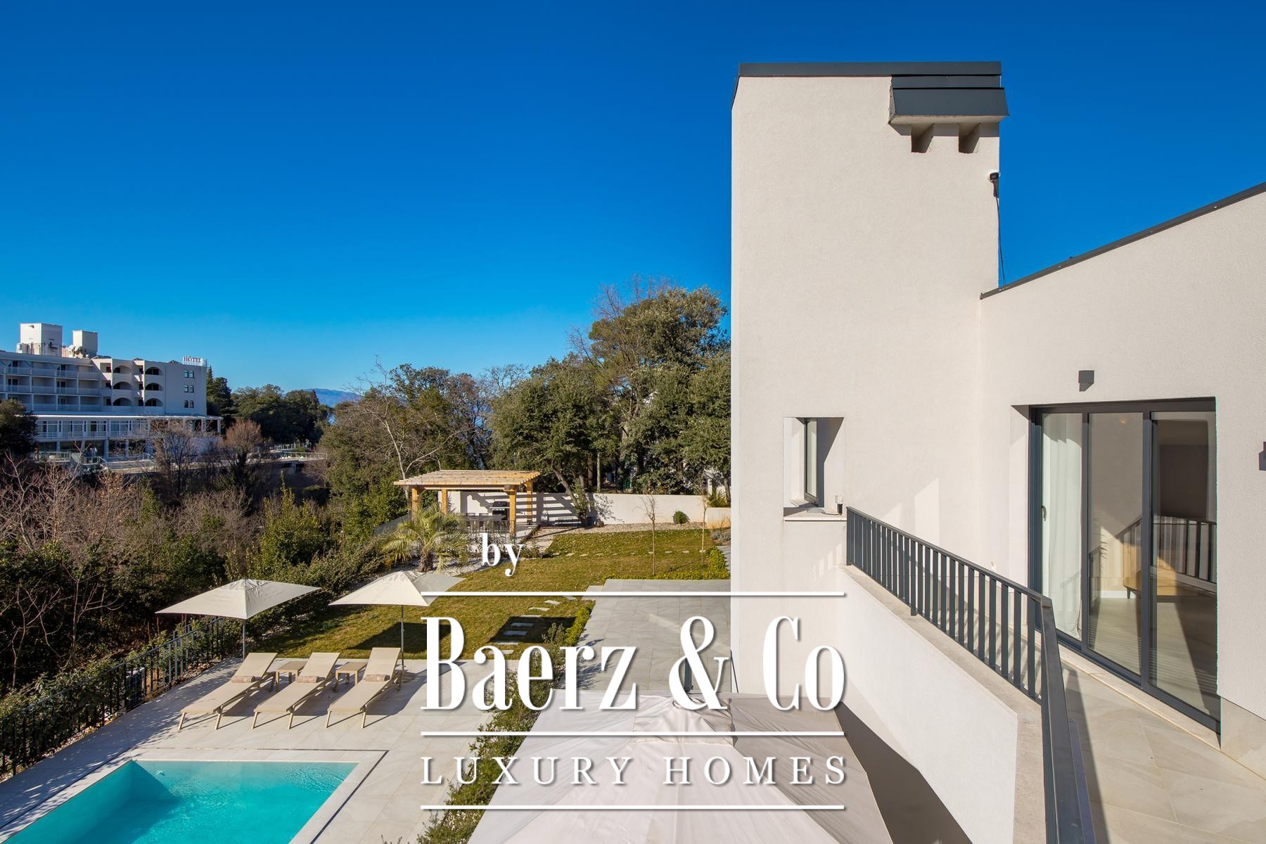 The island of Krk, Malinska imposing villa in an exclusive location in the first row to the sea, a perfect harmony between luxury and comfort. It is located in an exclusive location, only 50 meters from the seashore and 500 meters from the center of Malinska, and offers an ideal balance between privacy and proximity to all necessary amenities. This luxurious villa, with a total area of 320 m2, enchants with its refined design and impeccable quality. With a heated swimming pool and a beautifully landscaped garden of 1,920 m2, here is a real haven for a peaceful life or vacation. The spacious interiors of the villa are divided into the ground floor and the first floor, with two separate apartments that provide privacy and comfort. Each apartment consists of an elegant living room, fully equipped kitchen and dining
