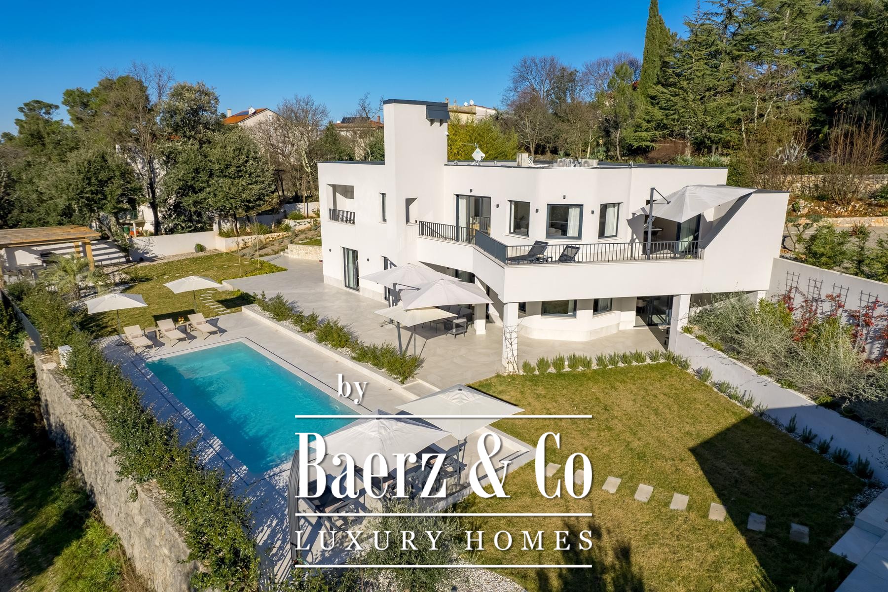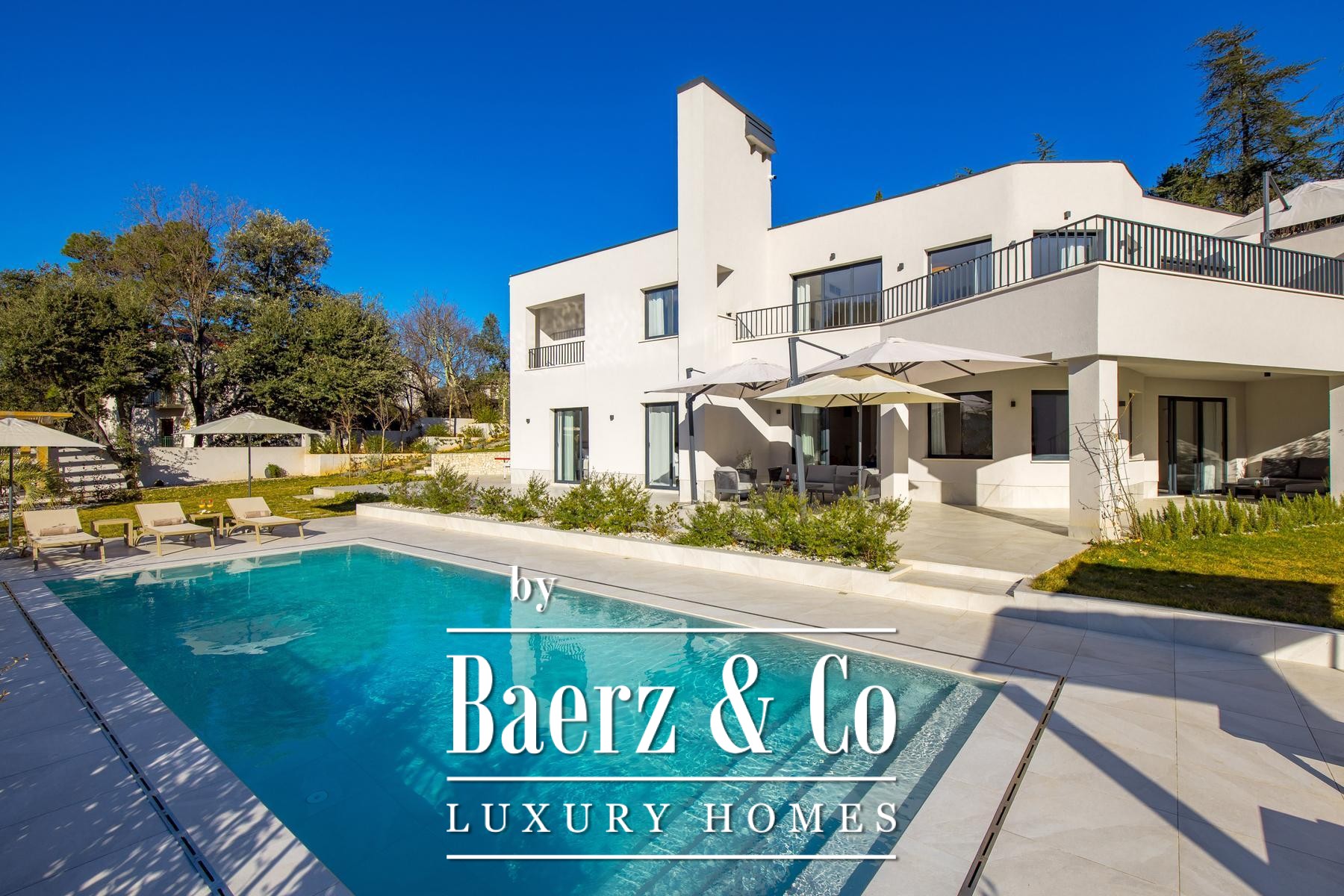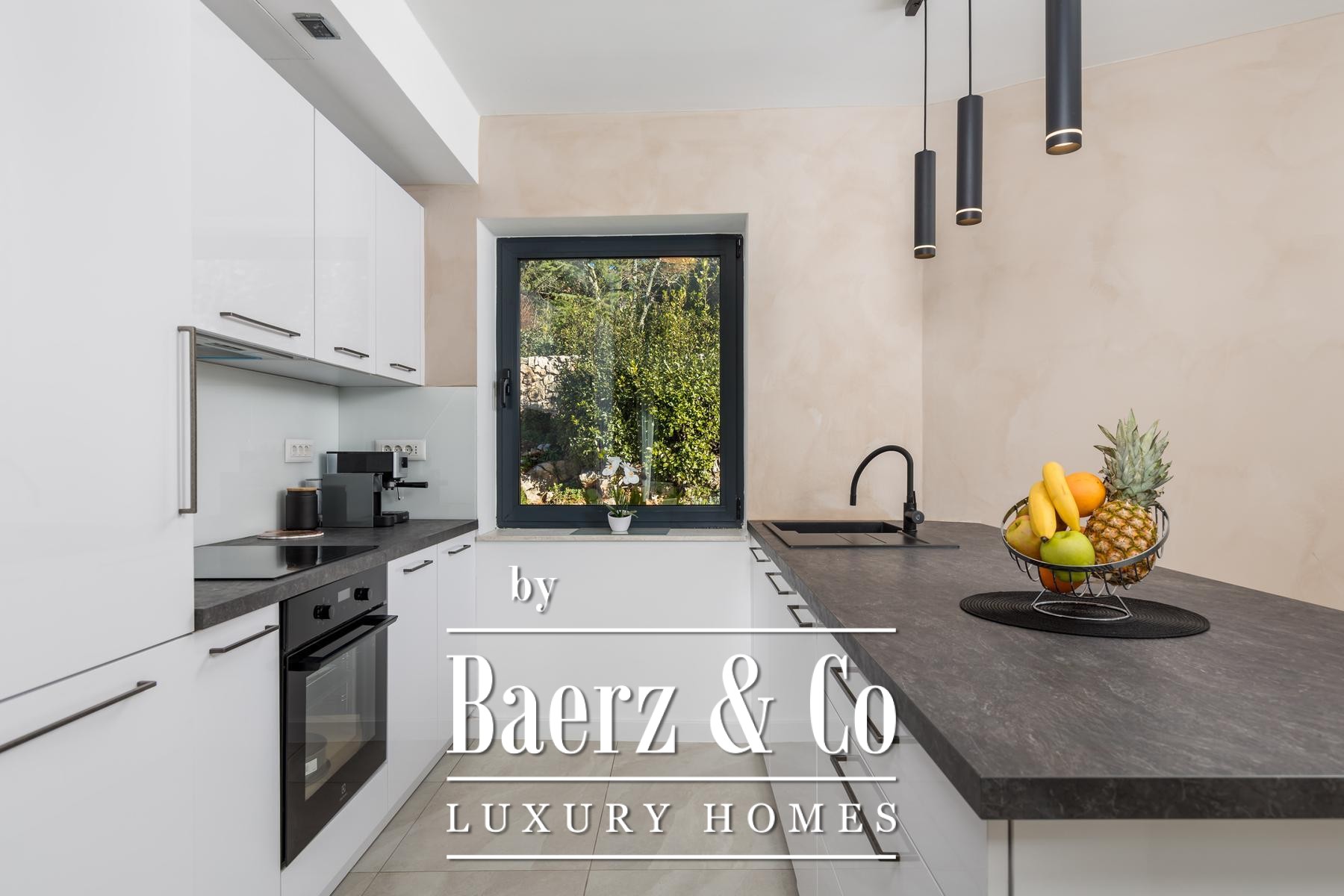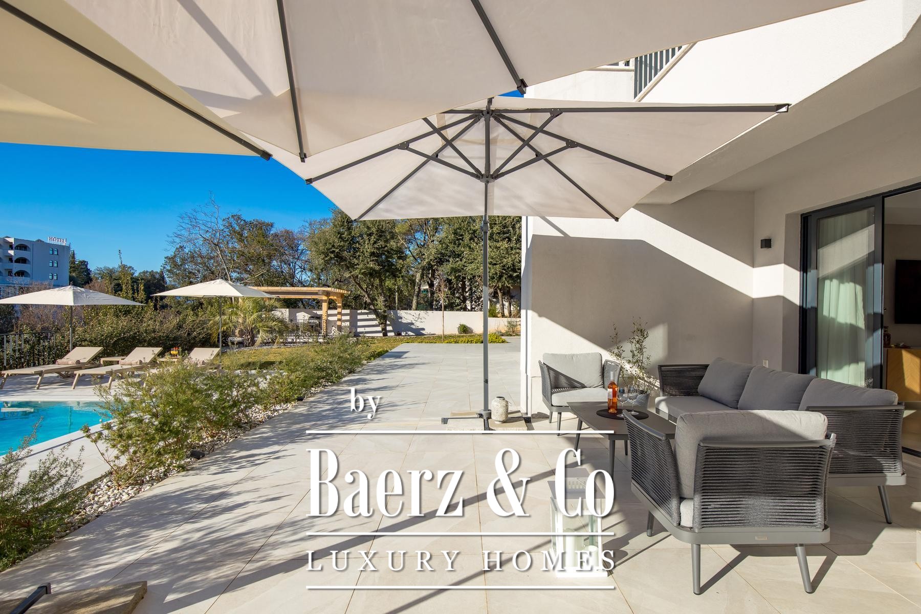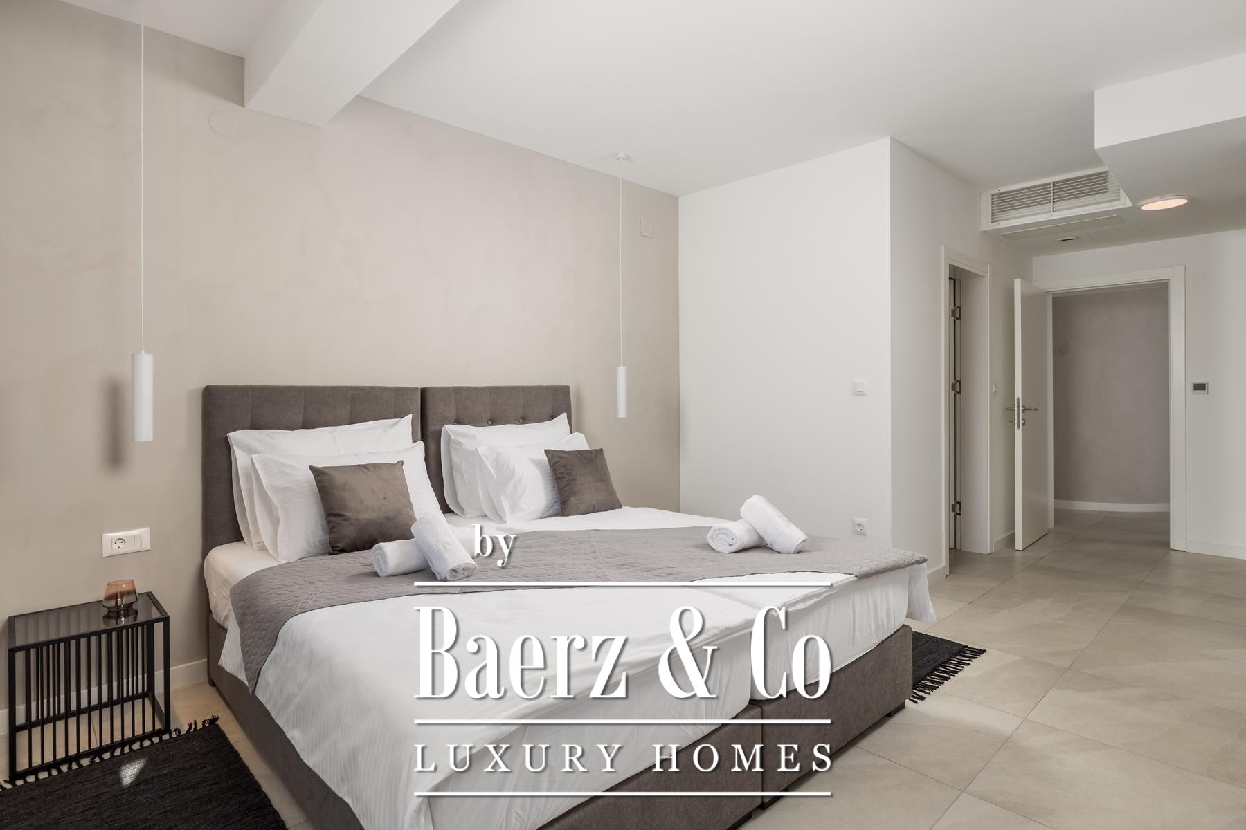 The island of Krk, Malinska imposing villa in an exclusive location in the first row to the sea, a perfect harmony between luxury and comfort. It is located in an exclusive location, only 50 meters from the seashore and 500 meters from the center of Malinska, and offers an ideal balance between privacy and proximity to all necessary amenities. This luxurious villa, with a total area of 320 m2, enchants with its refined design and impeccable quality. With a heated swimming pool and a beautifully landscaped garden of 1,920 m2, here is a real haven for a peaceful life or vacation. The spacious interiors of the villa are divided into the ground floor and the first floor, with two separate apartments that provide privacy and comfort. Each apartment consists of an elegant living room, fully equipped kitchen and dining