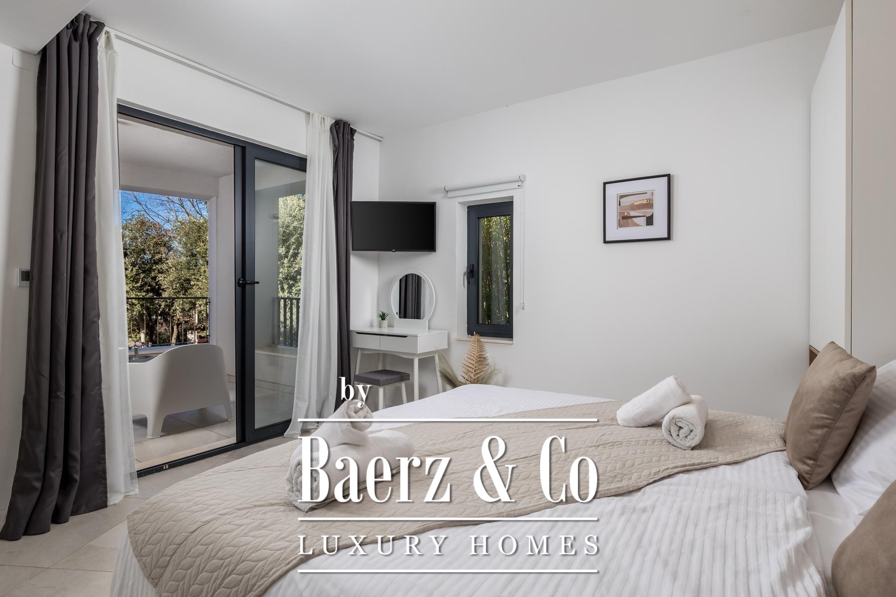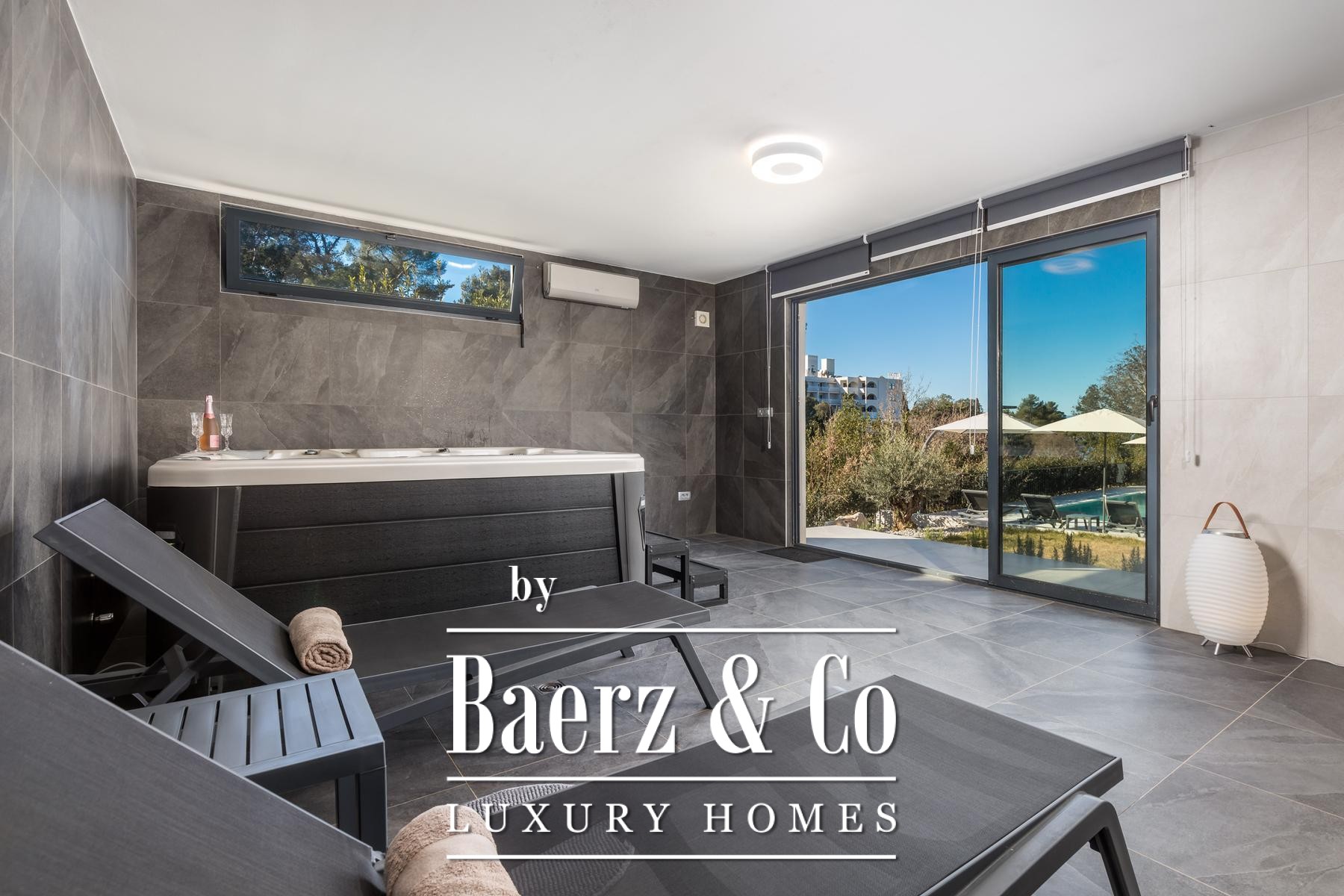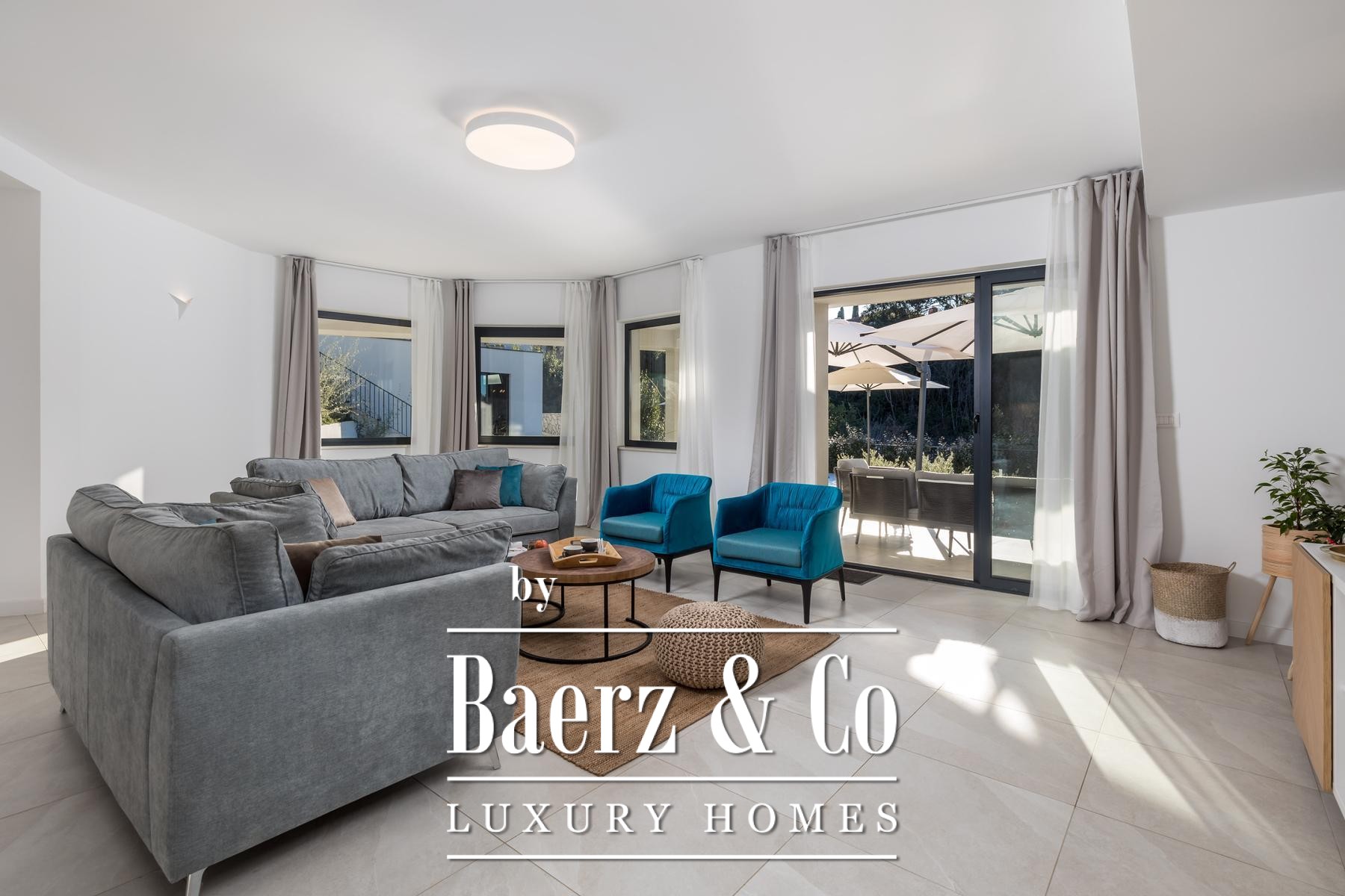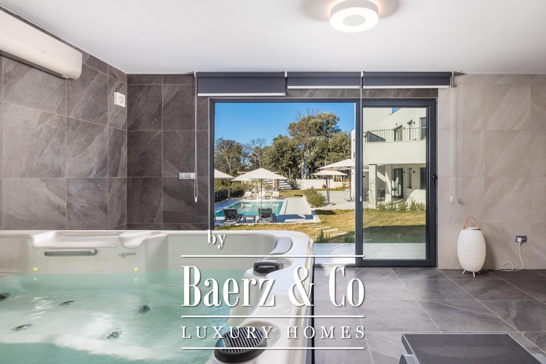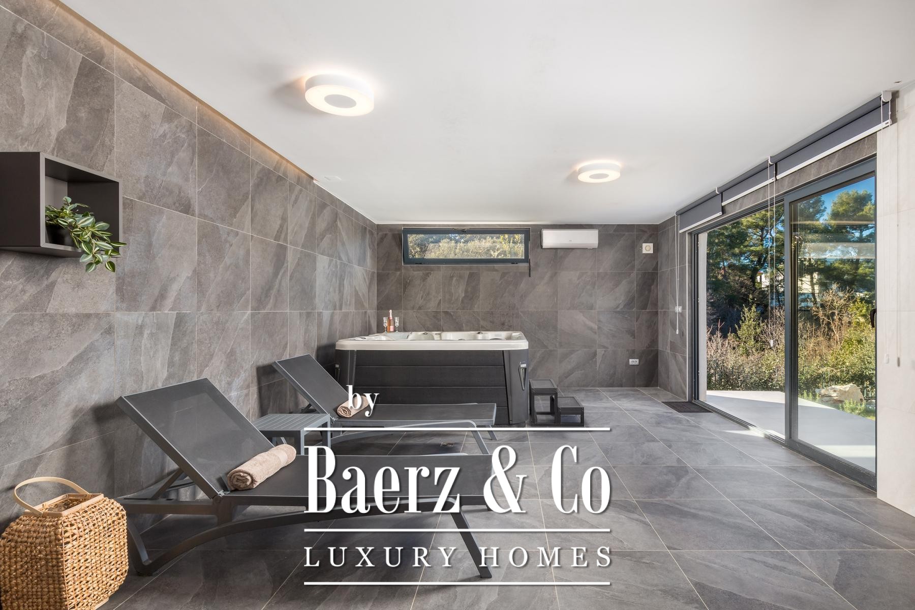 room, and three luxurious bedrooms, each with its own bathroom. In addition, there is a toilet, a corridor and spacious terraces that offer spectacular views of the surrounding landscape. The villa has a common wellness area of 50 m2, equipped with a sauna, mini gym and jacuzzi, ideal for relaxation and revitalization of body and spirit. In the courtyard of the villa there is a separate building of 20m2 for servants with a kitchen and a bathroom. The overall quality of construction and equipment of this home guarantees a top standard of living. Underfloor heating ensures a pleasant atmosphere during the colder months, while air conditioning adjusts the temperature according to your preferences. For convenience and safety, parking spaces are also provided. We are at your disposal for any additional information.