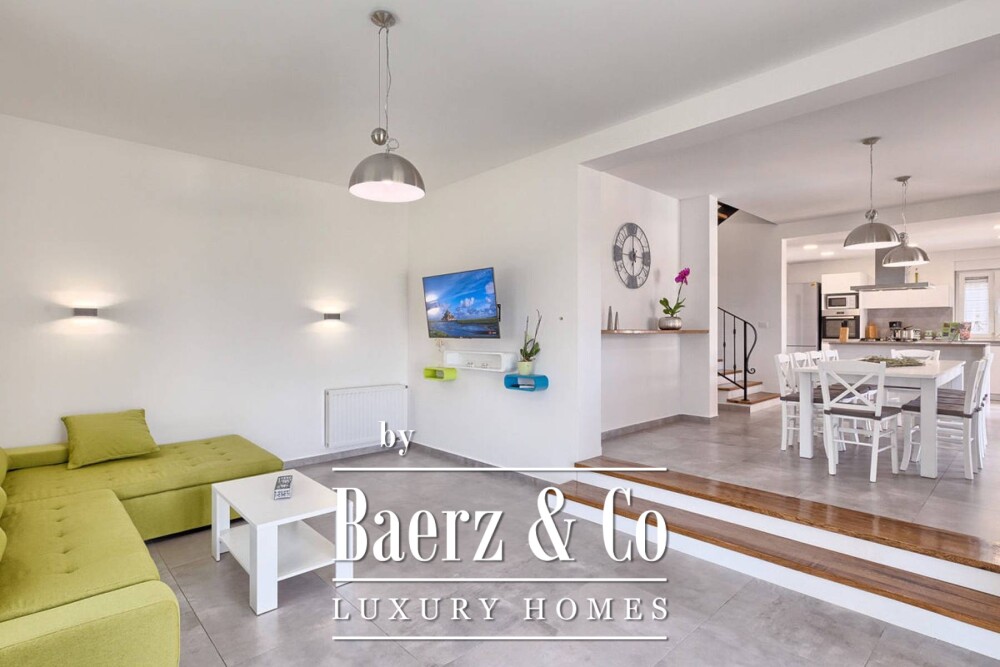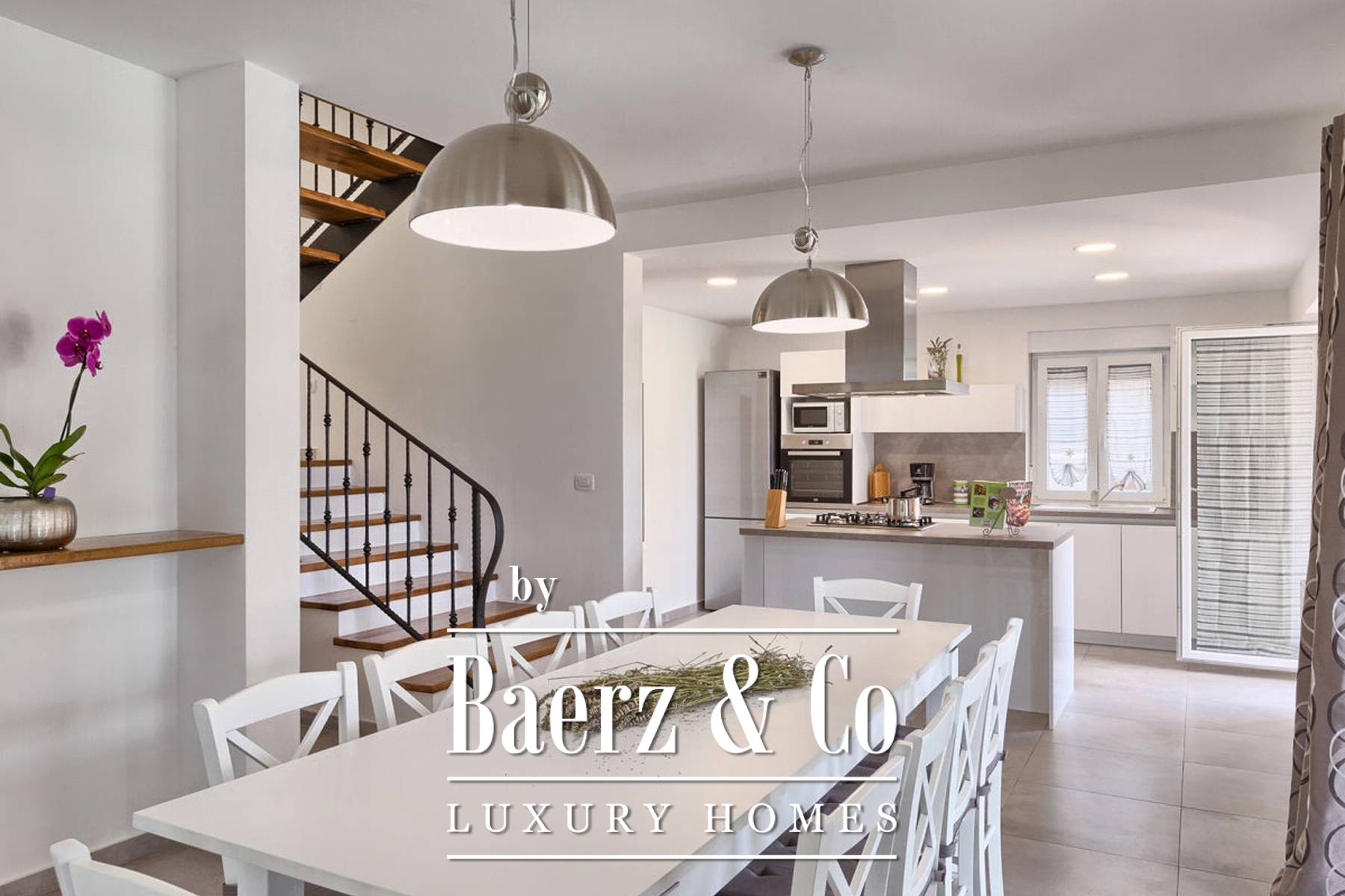 This villa Marčana for sale in Croatia offers 230 m² of living space, capturing the tranquility of its setting with an open view of the sea and the enveloping greenery. Designed across two thoughtfully arranged floors, the home opens on the ground level to a living room that connects seamlessly to a landscaped garden, a kitchen with dining area, pantry, and well-organized storage. Upstairs, three bedrooms each benefit from a private bathroom and terrace, creating independent retreats, while an additional room offers flexibility for a study or further storage. Every space is air-conditioned, reflecting a practical approach to comfort.