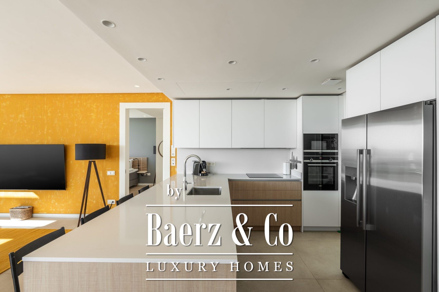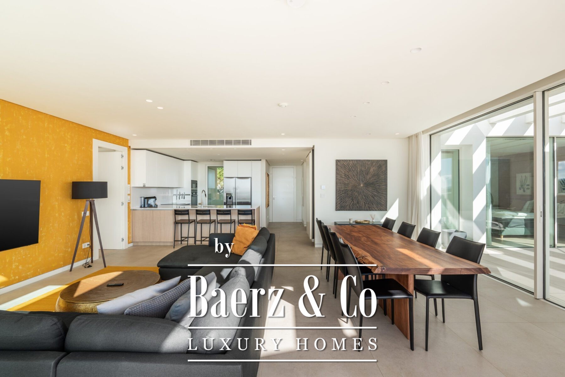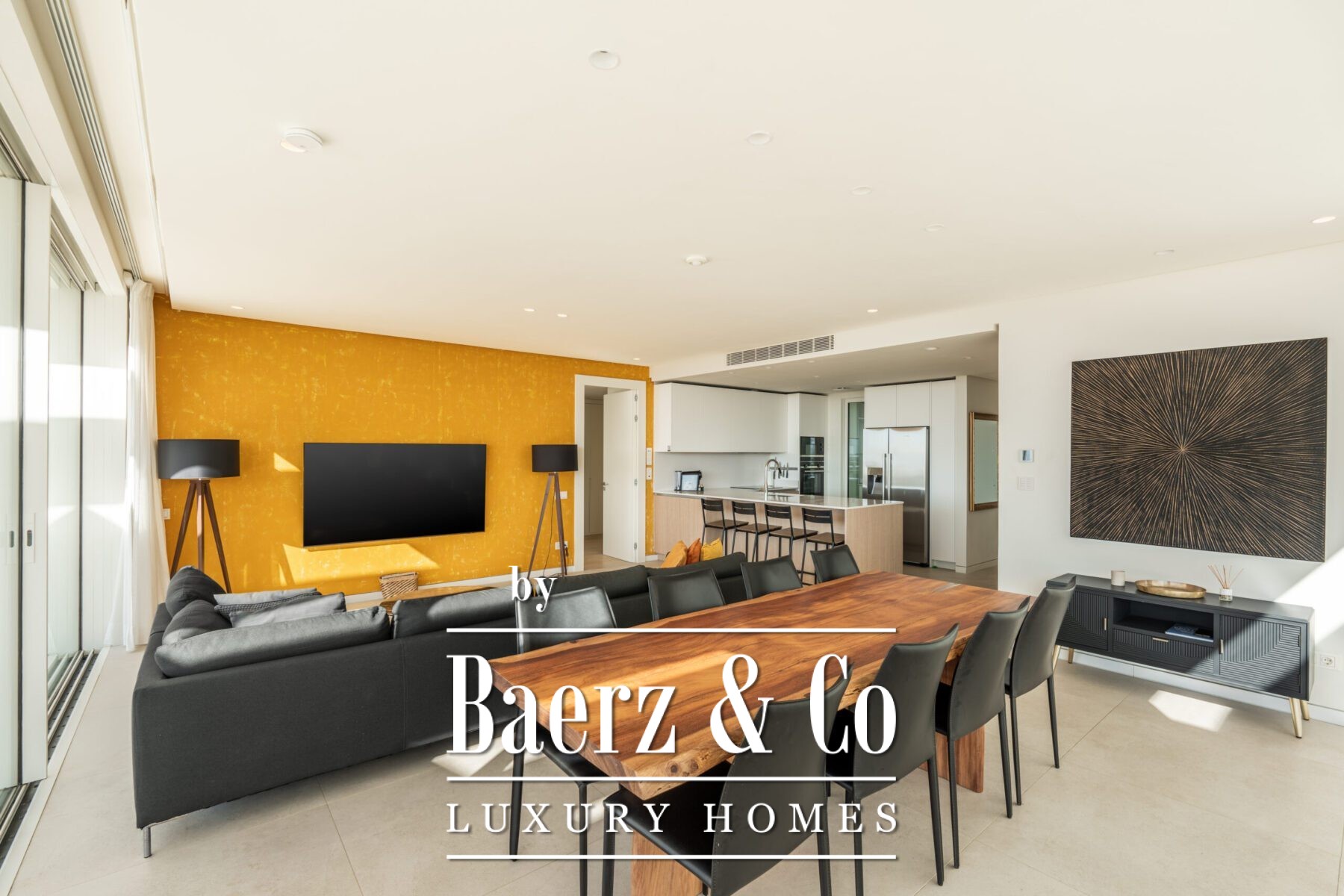 The open-plan interiors balance space and intimacy, anchored by a fully equipped kitchen and a living-dining area that opens directly to the expansive terrace. There are three bedrooms, each with its own en-suite bathroom, including a principal suite with walk-in wardrobe and terrace access. A guest toilet and a dedicated laundry with extra storage further elevate daily comfort. The penthouse is sold fully furnished, features air conditioning and underfloor heating, and includes a two-car garage and storage room.