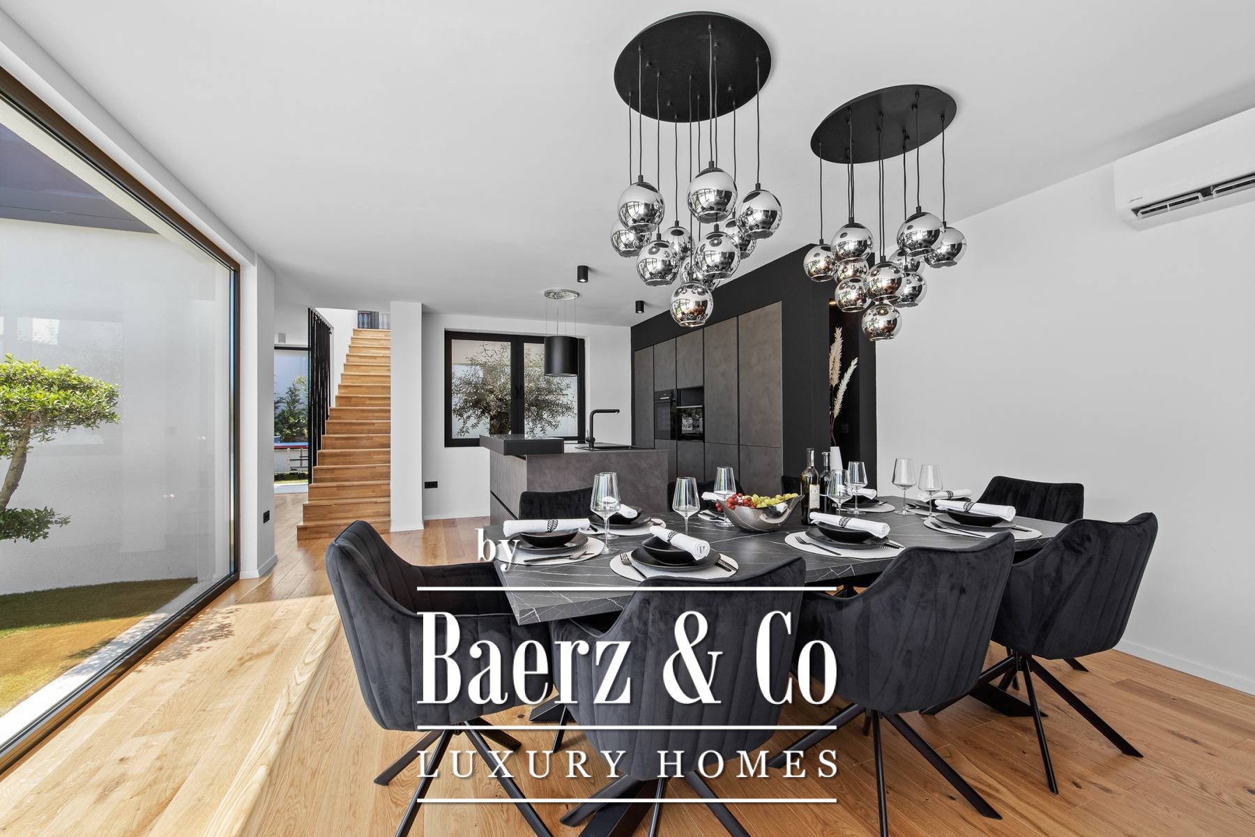 Villa Medulin stands as an example of contemporary design on Croatia’s Adriatic coast. This property, with 220 m² of living space, is set in a tranquil pocket of Medulin, occupying a 500 m² plot where garden and architecture create a measured retreat. The villa’s thoughtful layout spans two levels, with the ground floor featuring a luminous living area anchored by an electric fireplace and an expansive aluminum sliding wall opening directly onto the 40 m² pool. This pool, designed for use throughout the seasons, becomes the heart of indoor-outdoor living.