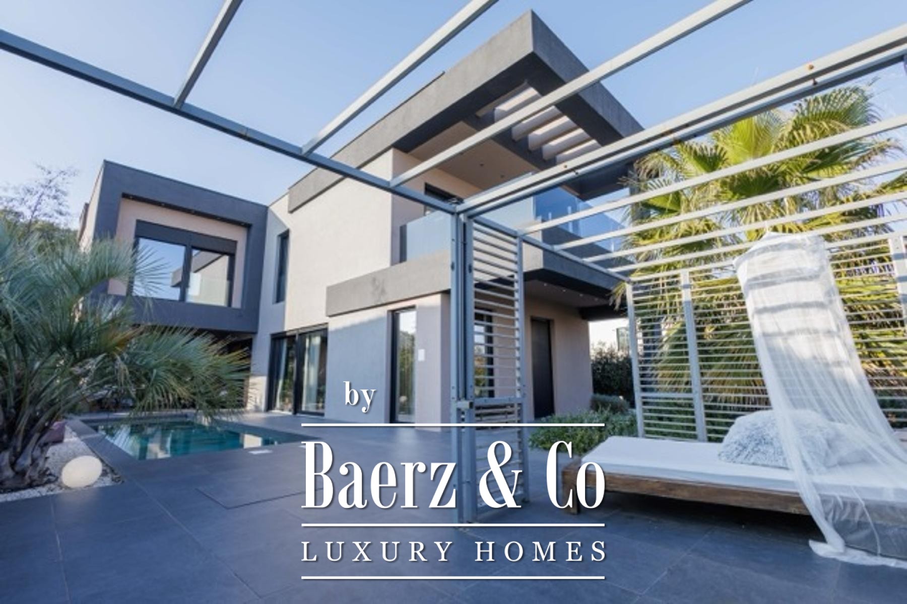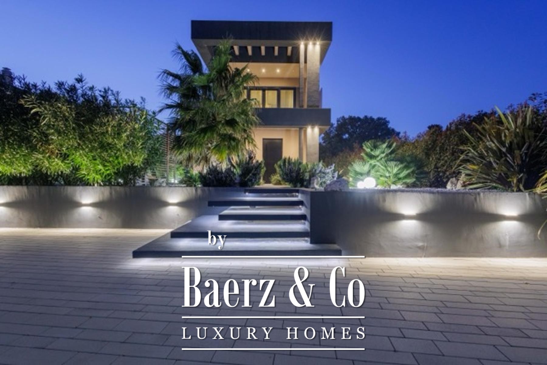 On the ground floor, an expansive living room anchors the home, featuring bespoke furnishings sourced from Germany, Italy, and the Czech Republic. The interplay of soft color palettes, a statement fireplace, and generous glazing blurs indoor and outdoor life, opening to the private pool and surrounding terrace. Adjoining rooms include a thoughtfully equipped kitchen, a guest bedroom, a toilet, additional service spaces, and direct garden access.