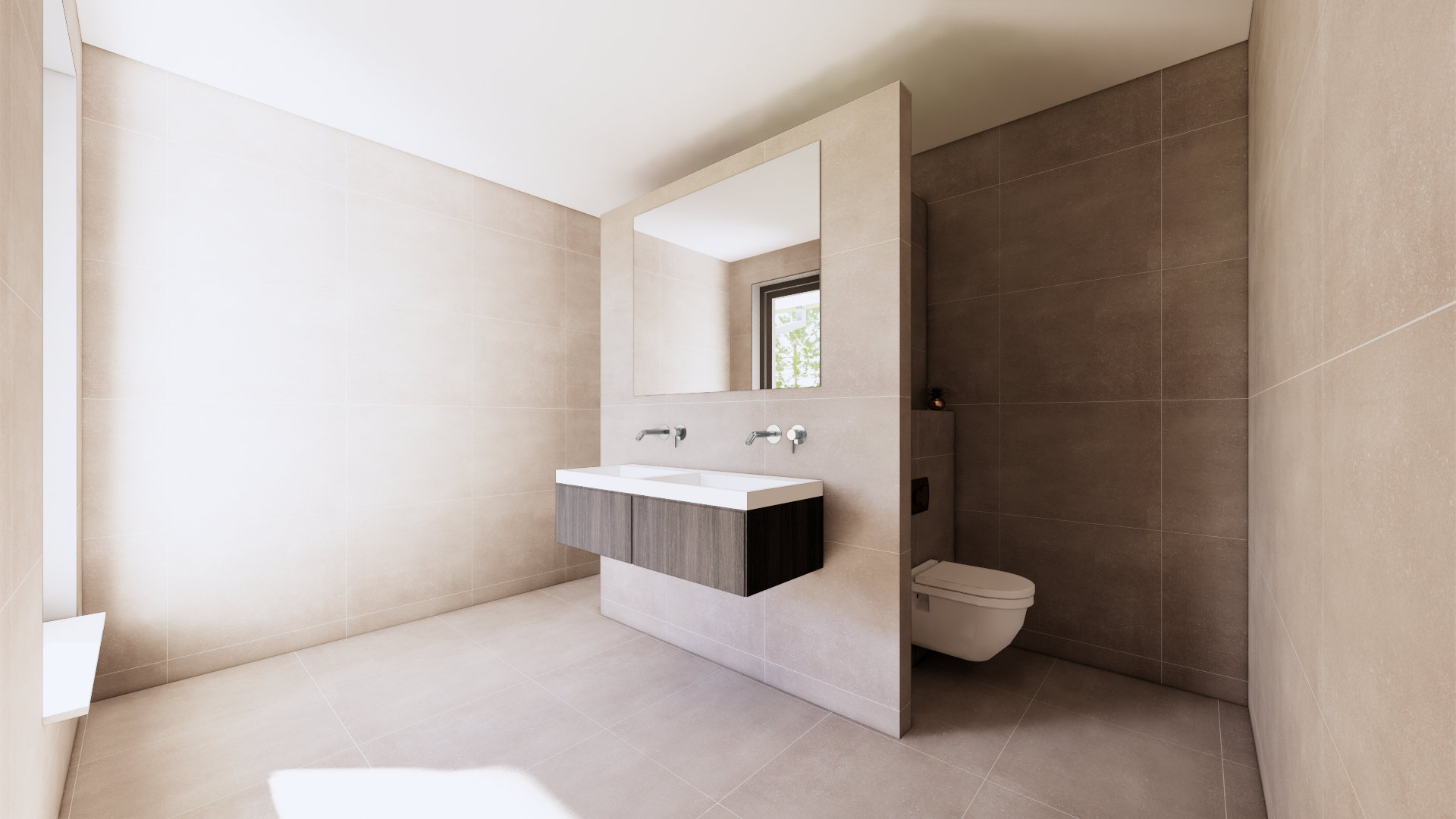 On the second floor you will find three bedrooms. The master bedroom has its own luxurious bathroom with double sink, walk-in shower and toilet, and provides access to a spacious walk-in closet. The second bathroom is equipped with a bathtub, shower corner and double sink, ideal for families. A separate toilet room completes it all.
