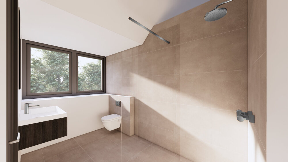The second floor is designed with three spacious bedrooms and a bathroom with sink, shower corner and toilet.