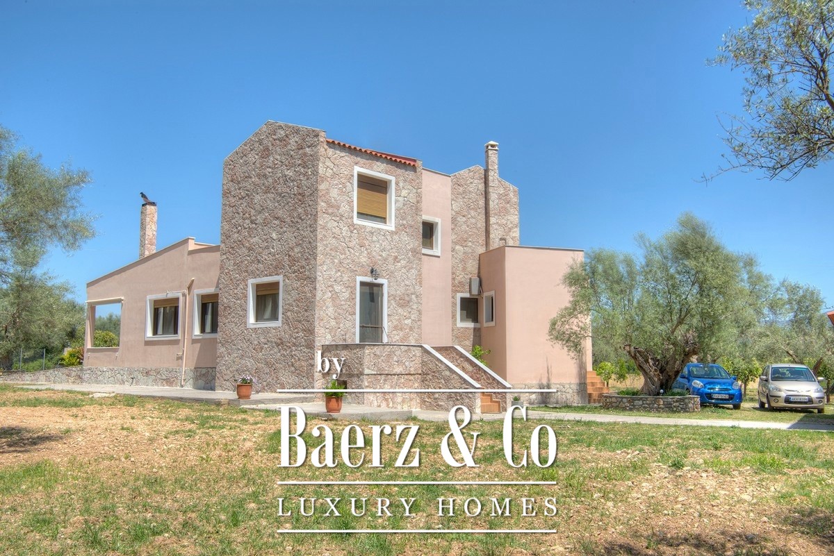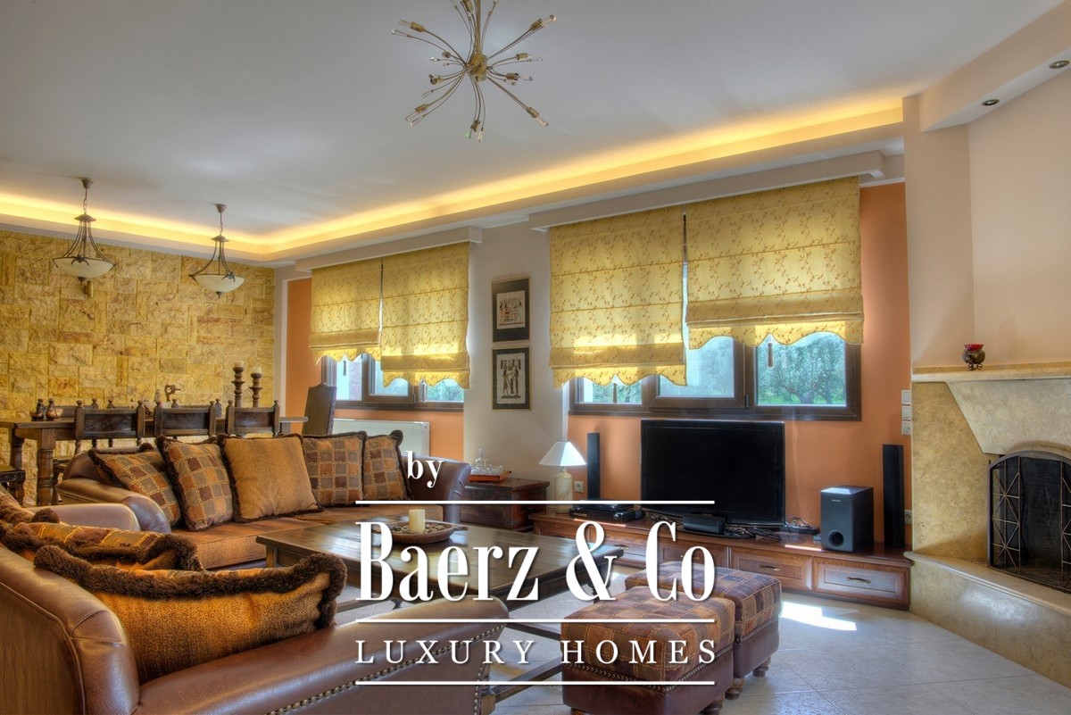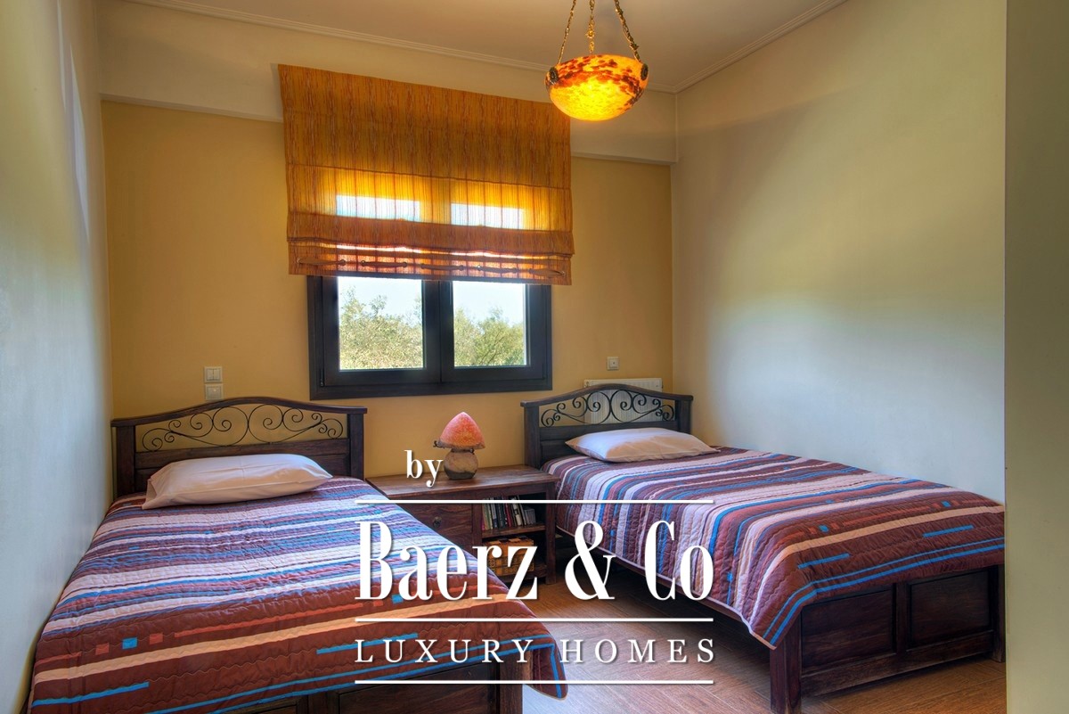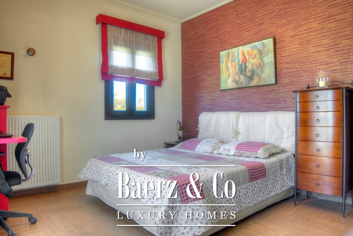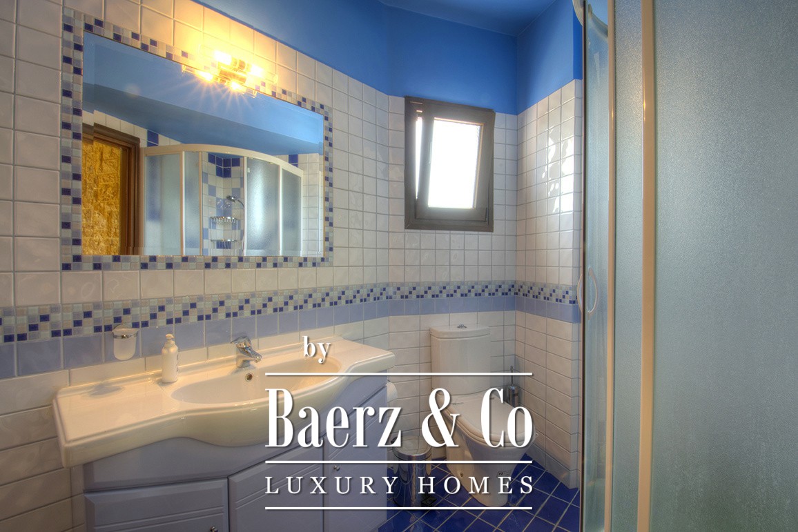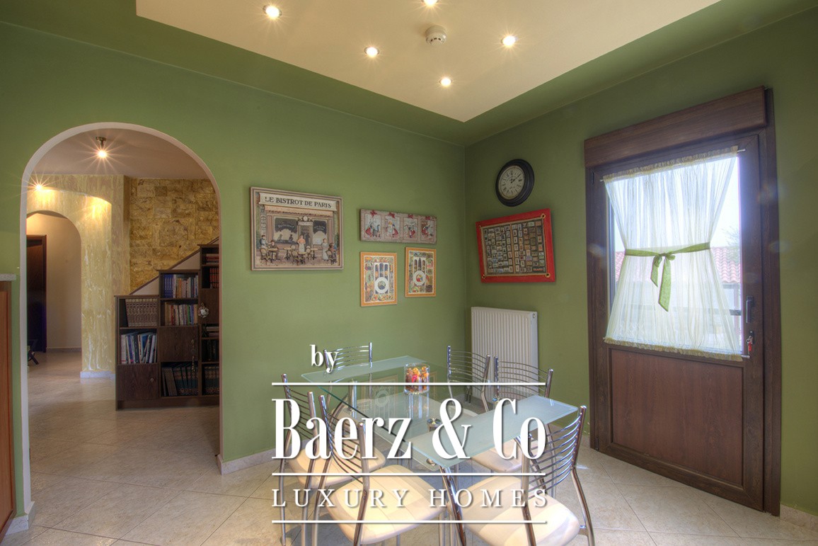 Safety is absolute, with a fenced perimeter, security door, alarm system, and camera surveillance. The 40 m² covered barbecue, a 30 m² basement storage, and a separate 40 m² auxiliary building offer versatile possibilities. Year-round comfort is maintained by oil heating, four air conditioning units, and double-glazed insulation. This luxury detached house for sale in Mistras also offers scope to expand by approximately 1,100 m², ideal for long-term living or a considered tourism venture.