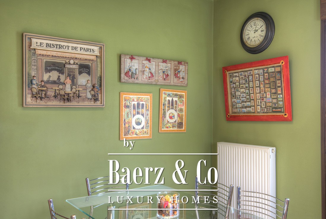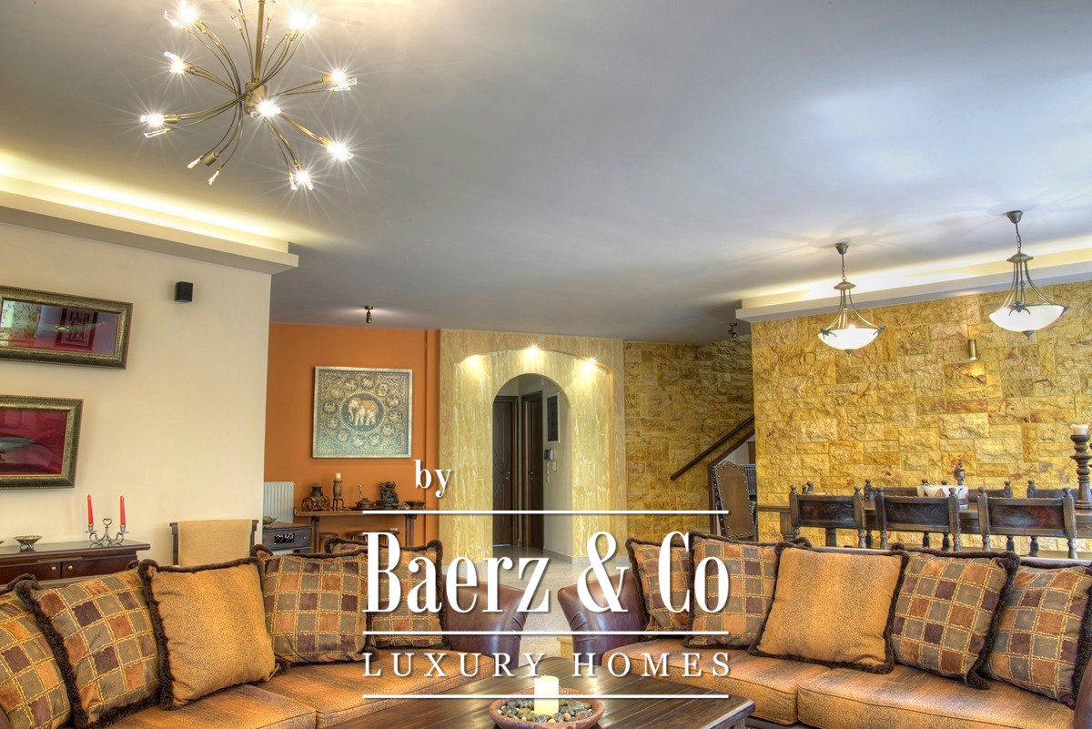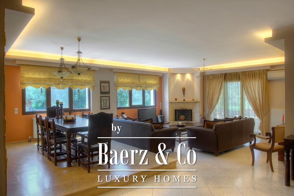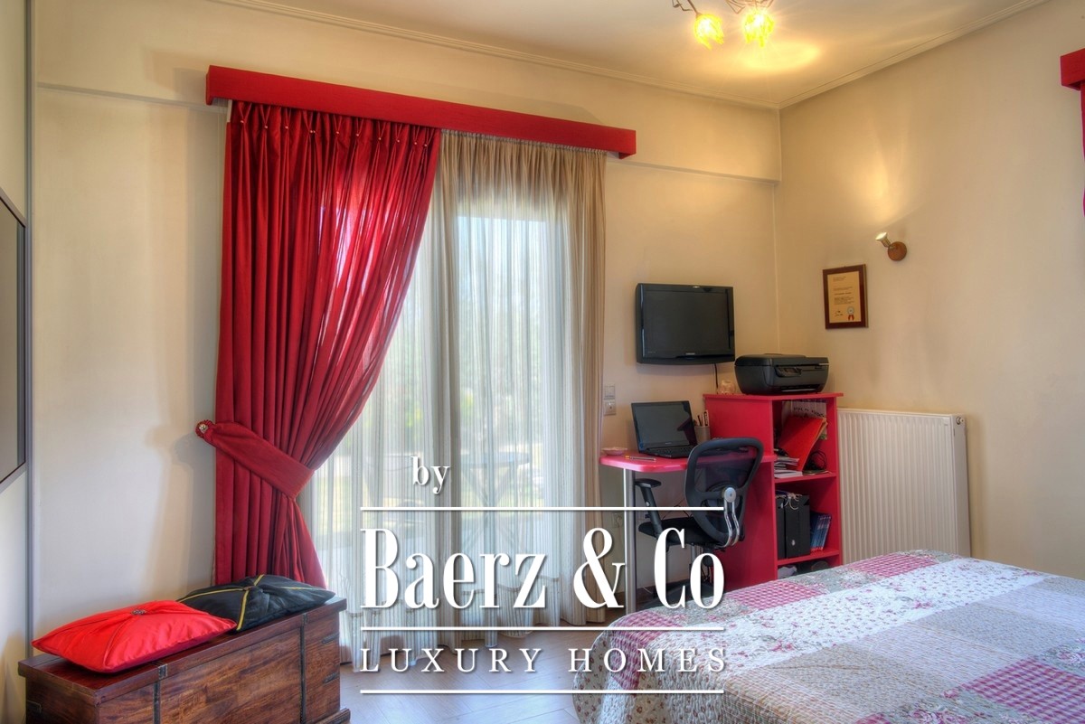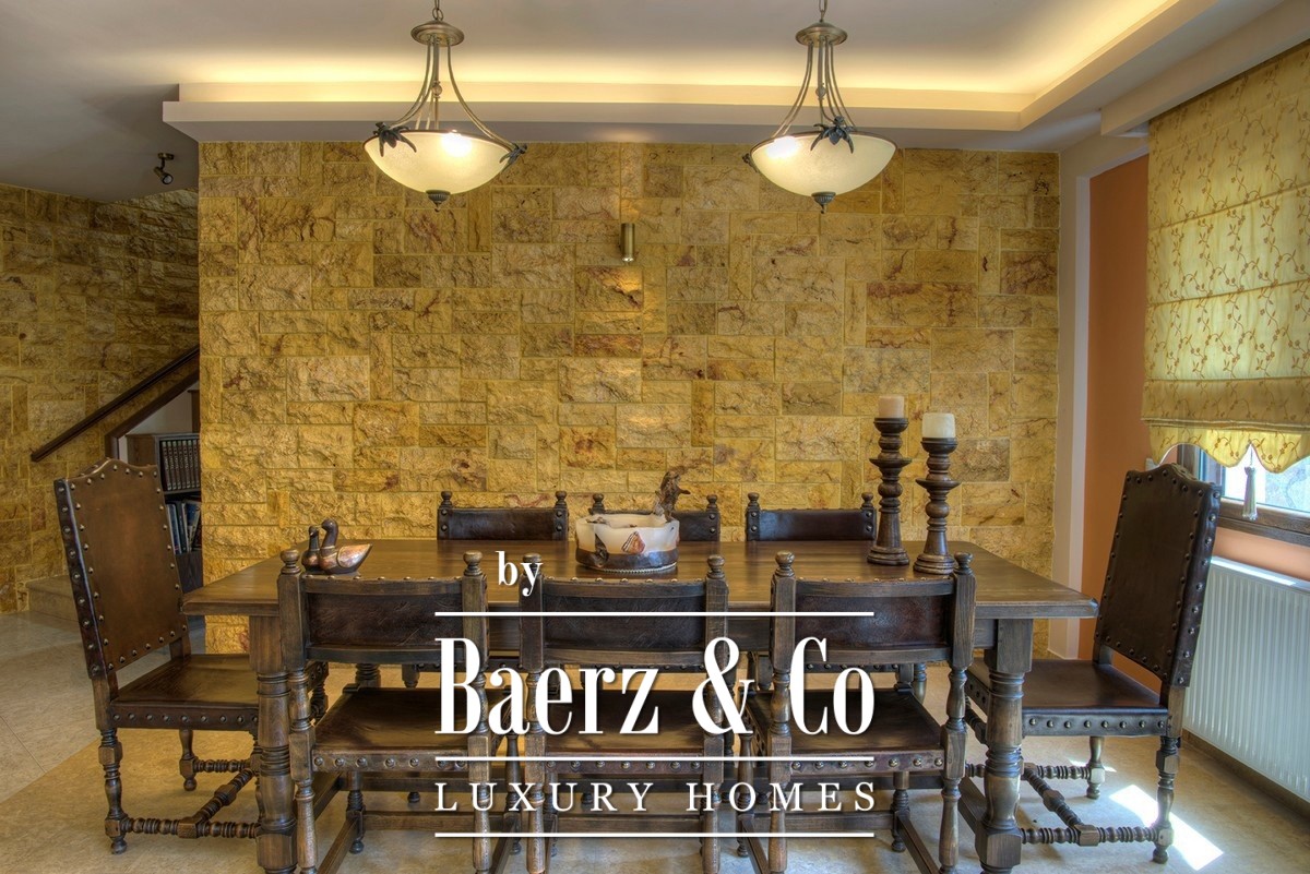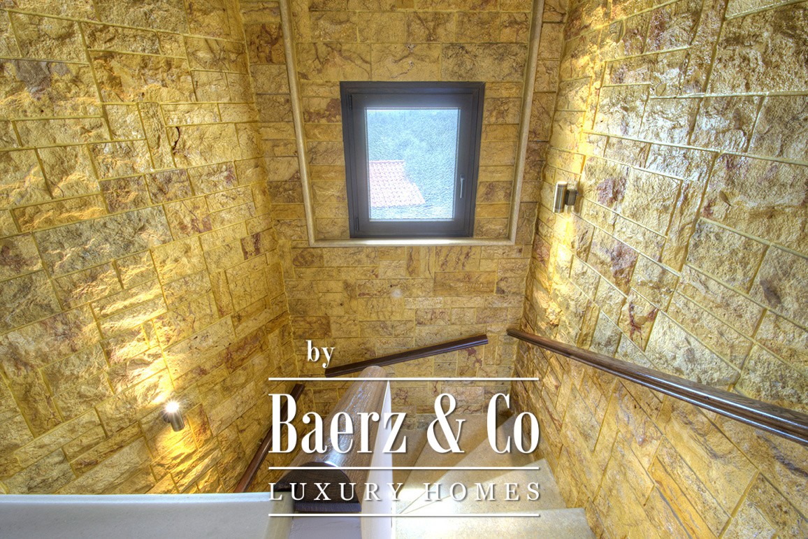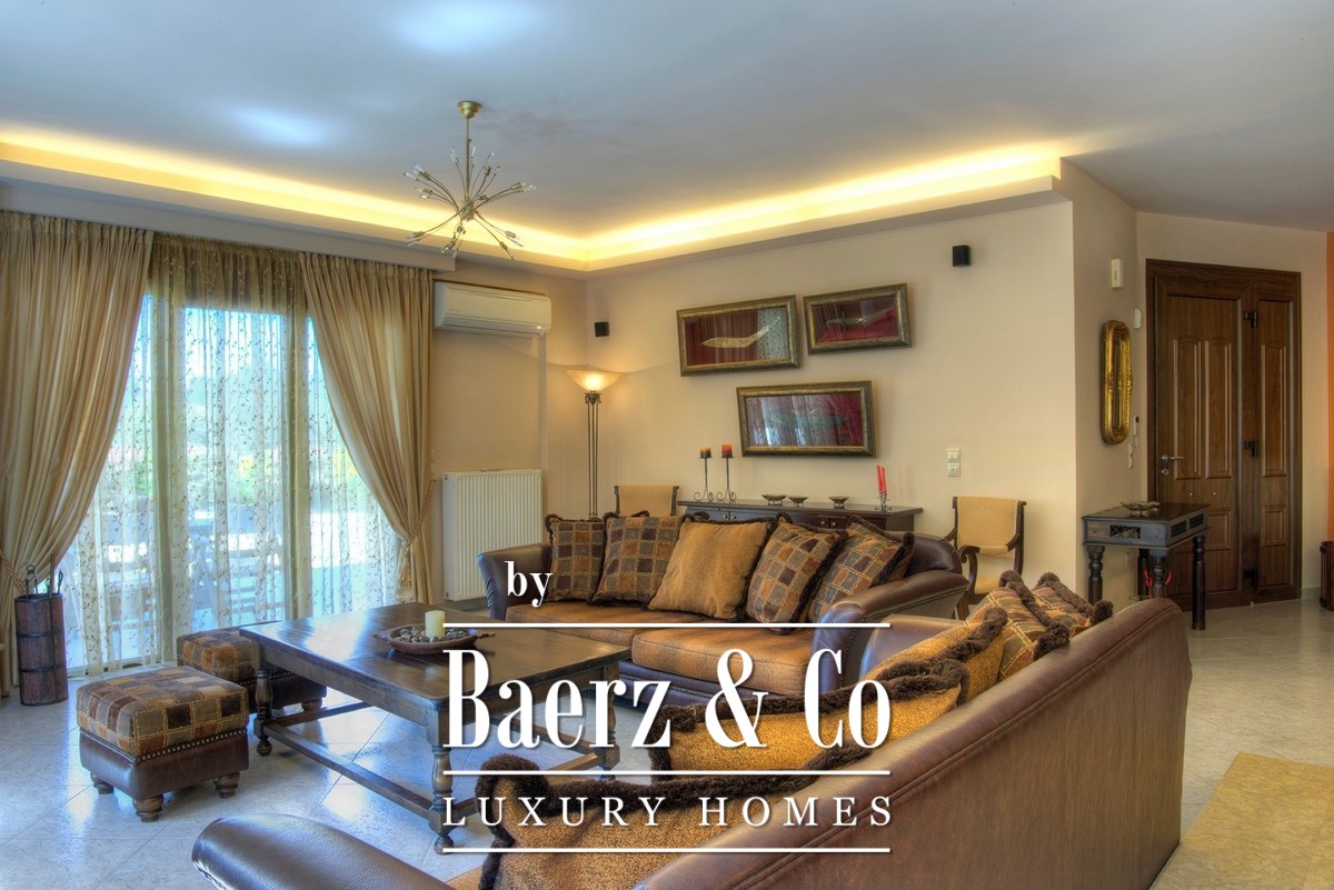 Safety is absolute, with a fenced perimeter, security door, alarm system, and camera surveillance. The 40 m² covered barbecue, a 30 m² basement storage, and a separate 40 m² auxiliary building offer versatile possibilities. Year-round comfort is maintained by oil heating, four air conditioning units, and double-glazed insulation. This luxury detached house for sale in Mistras also offers scope to expand by approximately 1,100 m², ideal for long-term living or a considered tourism venture.