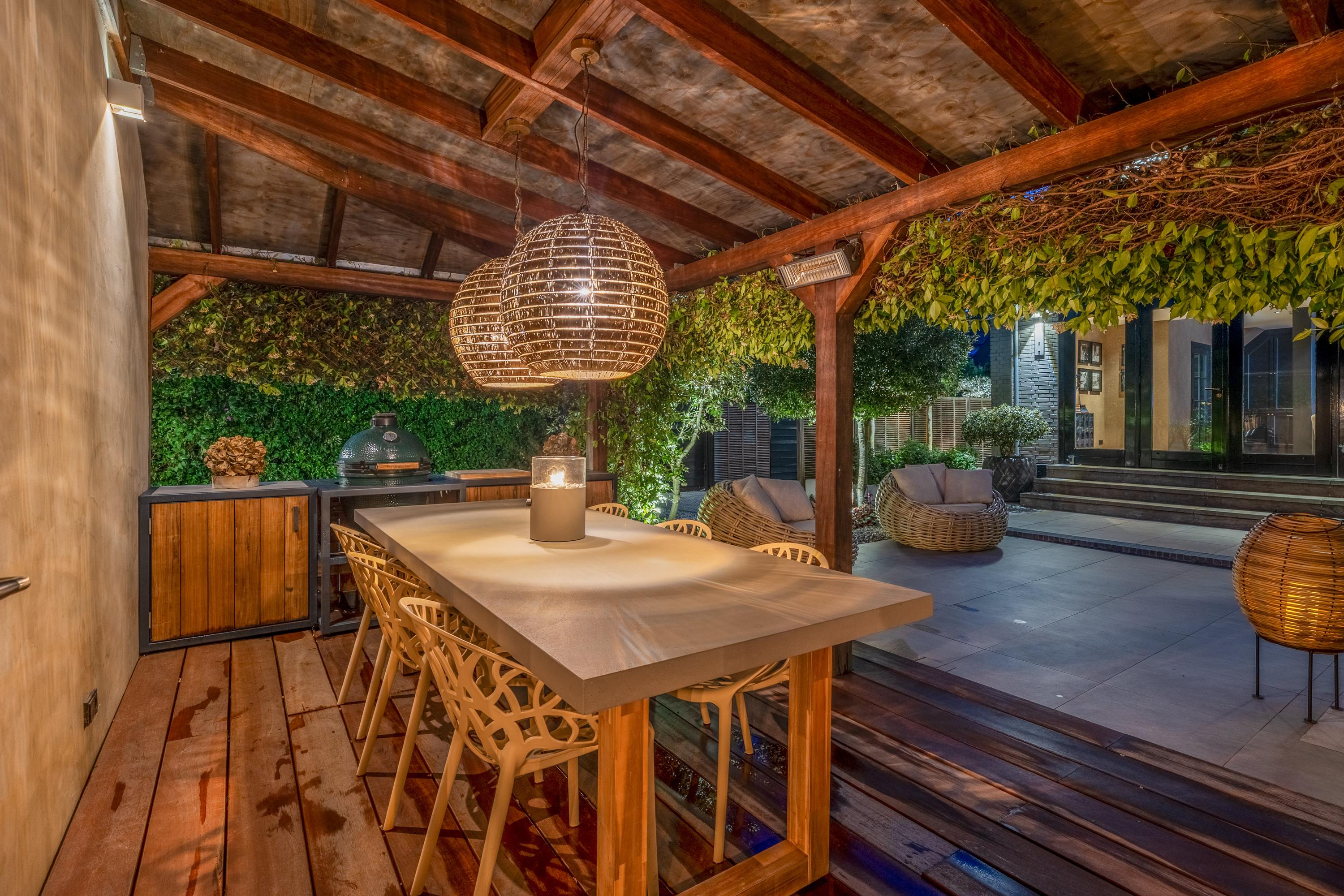 Achterin de tuin bevindt zich een stijlvolle overkapping met buitenkeuken en open haard – perfect voor ontspannen zomeravonden.