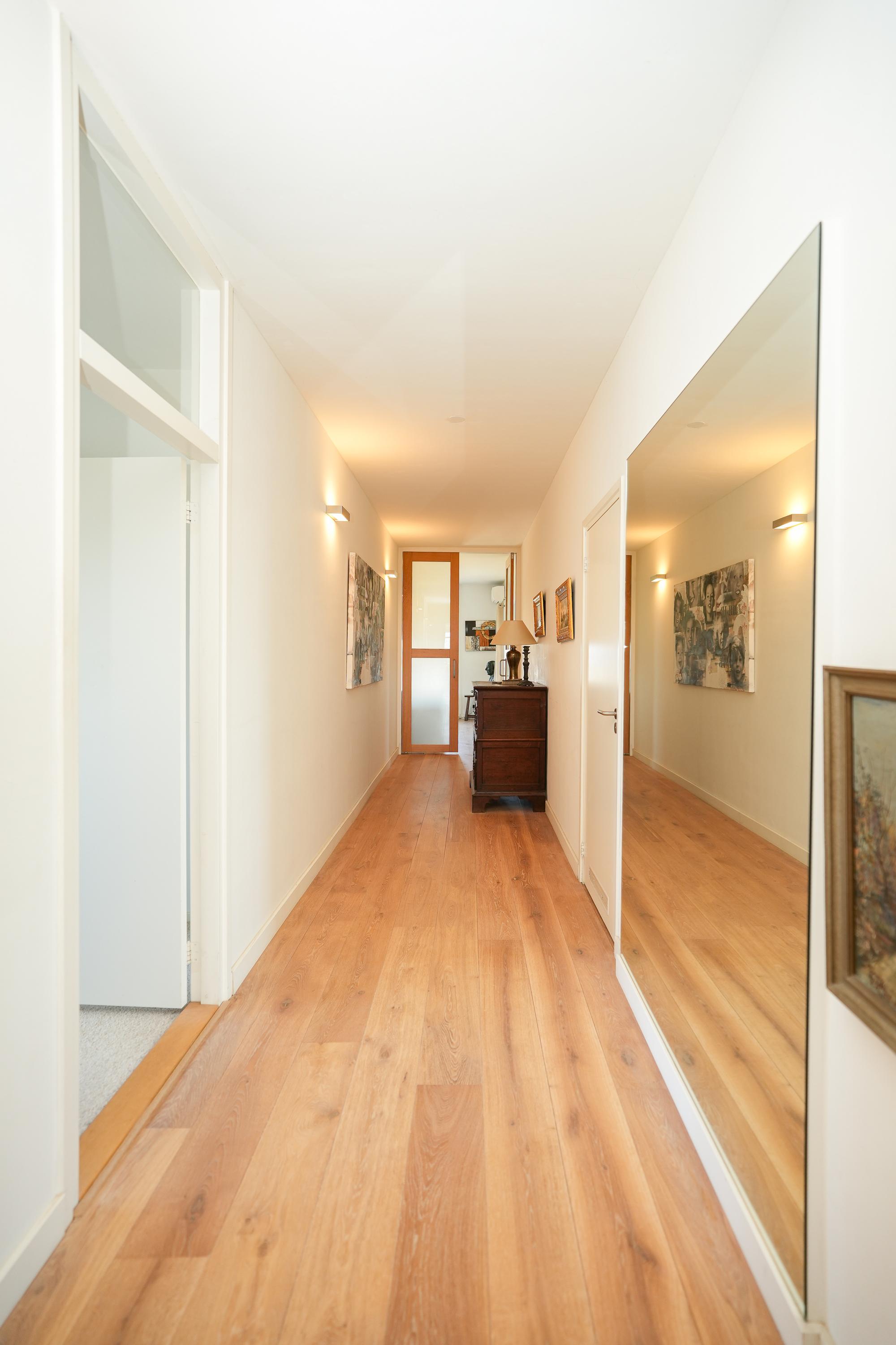Entrance to the apartment via a secure front door. Thanks to windows on all sides, the apartment is exceptionally bright. It features a long, wide hallway that serves as the central connection to all rooms. Upon entering, you will find the cloakroom, guest toilet, laundry room and the open-plan kitchen. Both the kitchen and the living room are directly accessible from the hallway, creating a loft-like atmosphere and a logical, flowing layout.