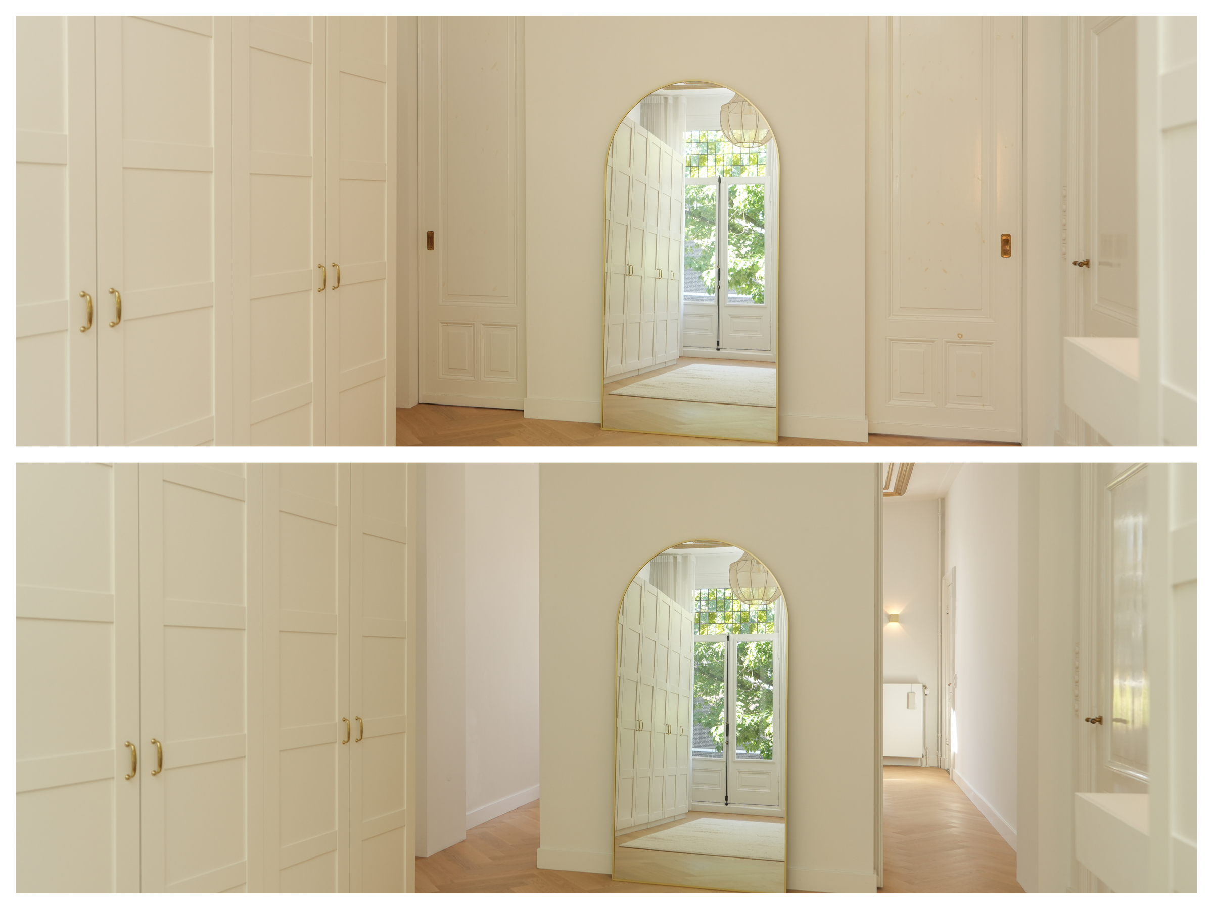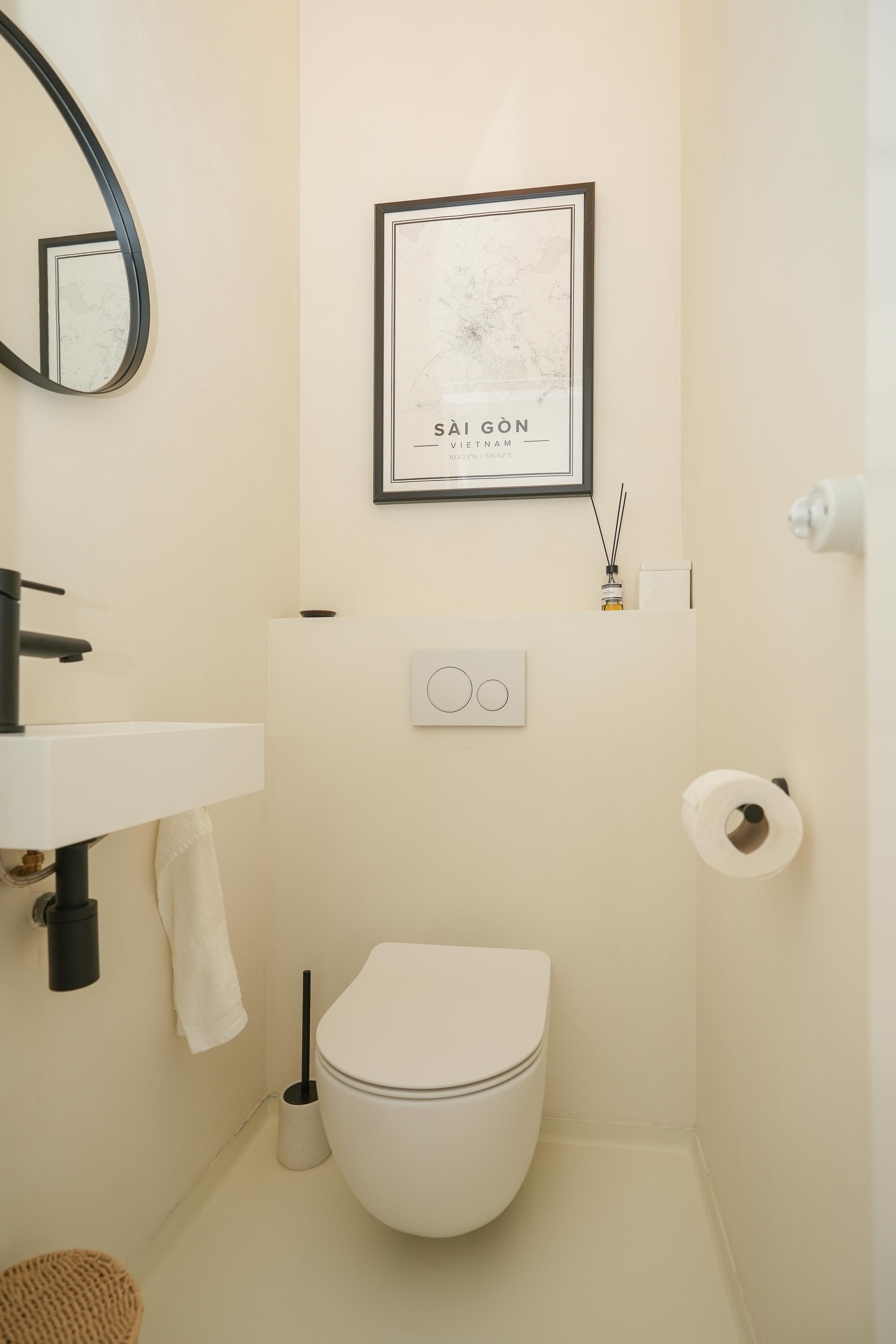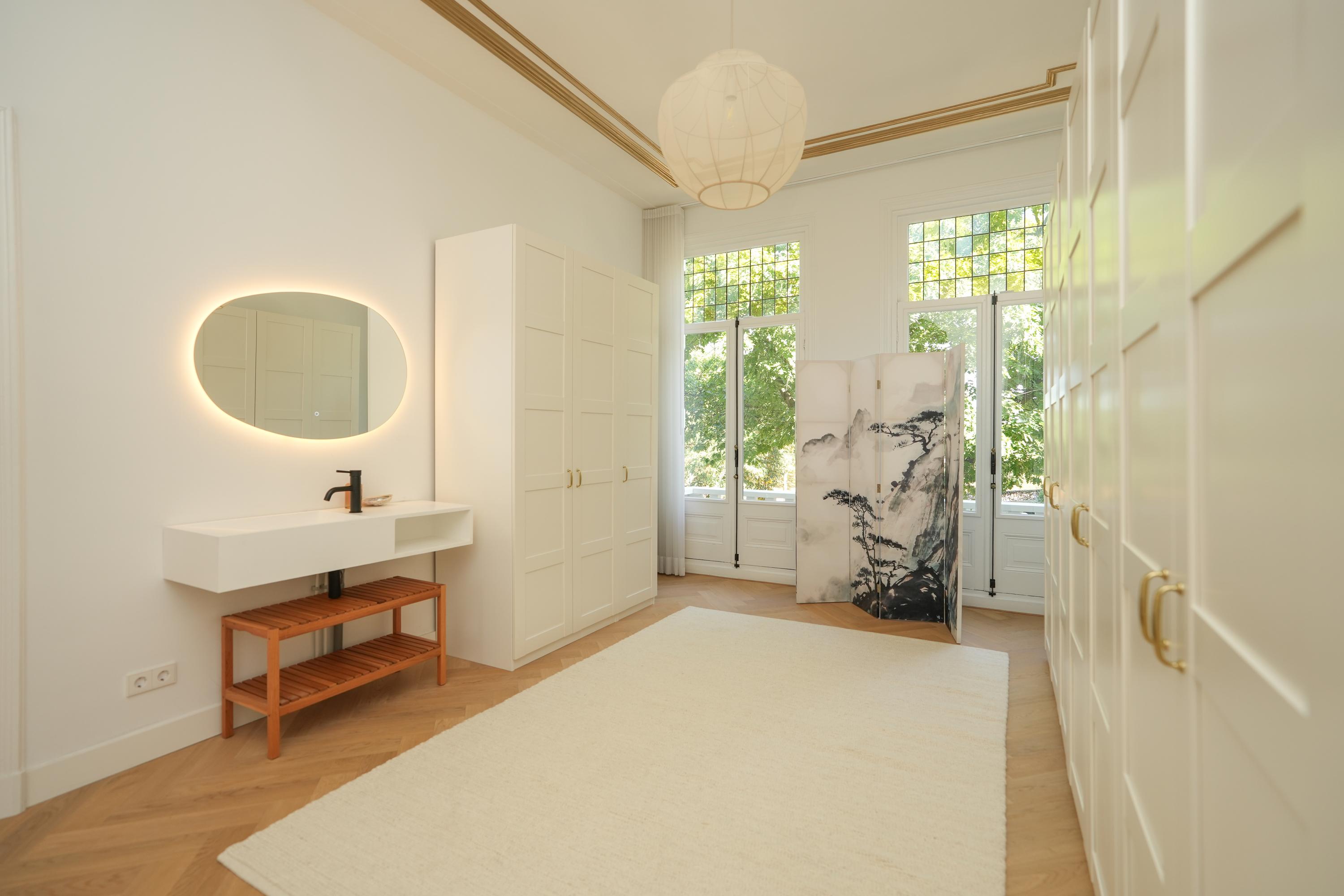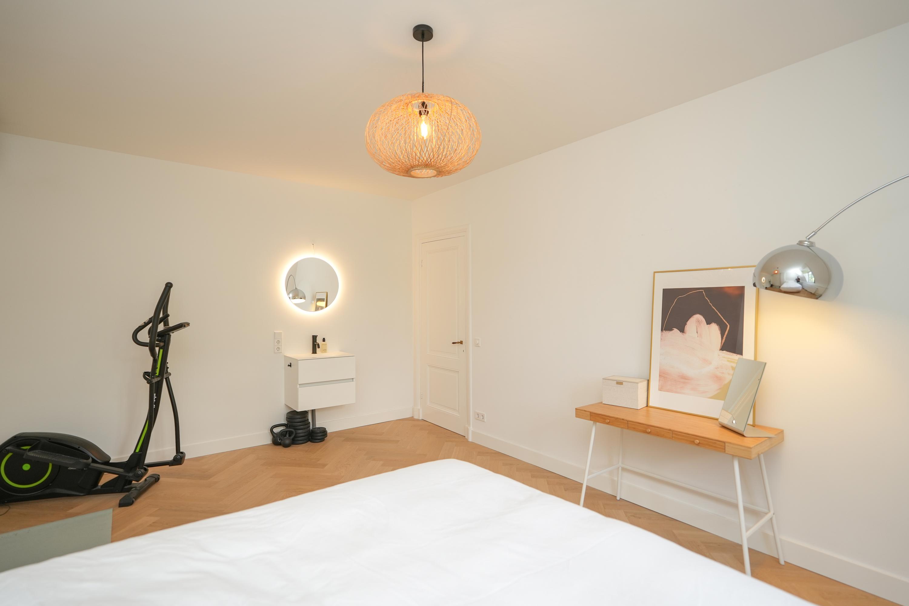 Bright landing with staircase to the top floor. The first floor has two bedrooms, a modern bathroom and a separate toilet with washbasin. The master bedroom has air conditioning and a spacious walk-in closet, accessible via two sliding doors next to the bed. At the front is a wide balcony next to the walk-in closet and at the rear is a spacious, sunny roof terrace next to the master bedroom. Originally, the master bedroom and walk-in closet were two separate bedrooms, and this layout can easily be restored. The second bedroom also has air conditioning. The luxurious, modern bathroom is accessible from both the master bedroom and the landing and features a freestanding bathtub, double walk-in shower, double sink in a vanity unit and underfloor heating. The toilet and bathroom are equipped with automatic mechanical ventilation.