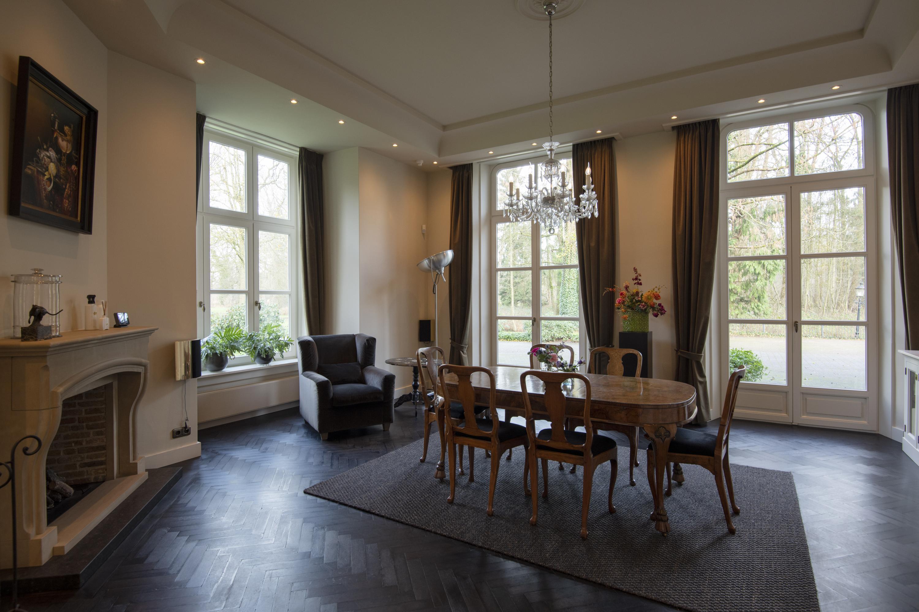 The tranquil yet strategic location of this estate, with its castle-like allure, makes it an ideal residence. Within 30 minutes, Eindhoven Airport, the High Tech Campus and Tilburg are all within easy reach, while ’s-Hertogenbosch is just a 20-minute drive away. The immediate surroundings offer extensive walking trails, perfect for hours of wandering through the beautiful Brabant woodlands. Surrounding the manor house is an English landscape garden with a pond, several lawns and many mature trees, including a magnificent monumental Caucasian wingnut and a Canadian poplar.