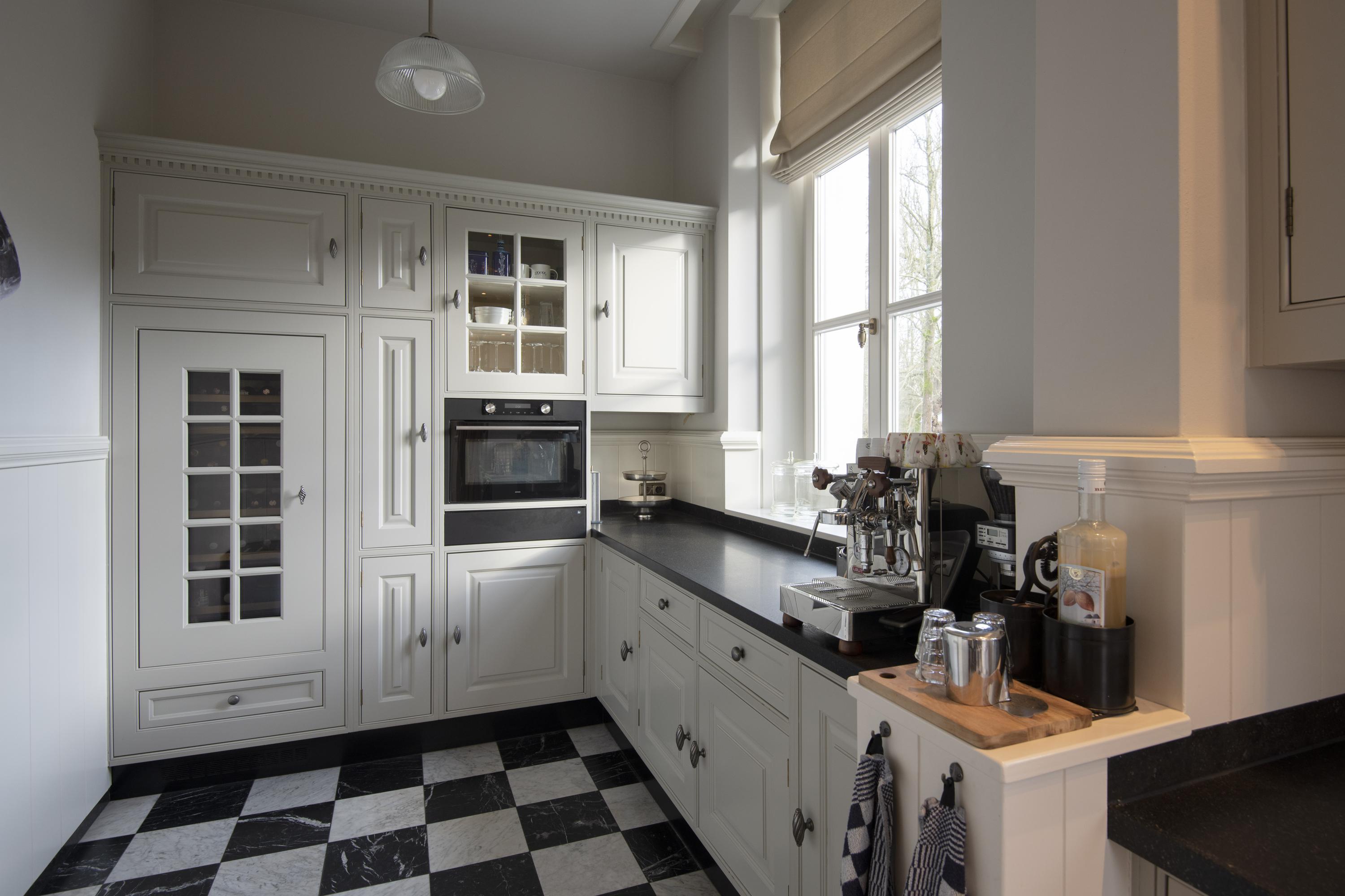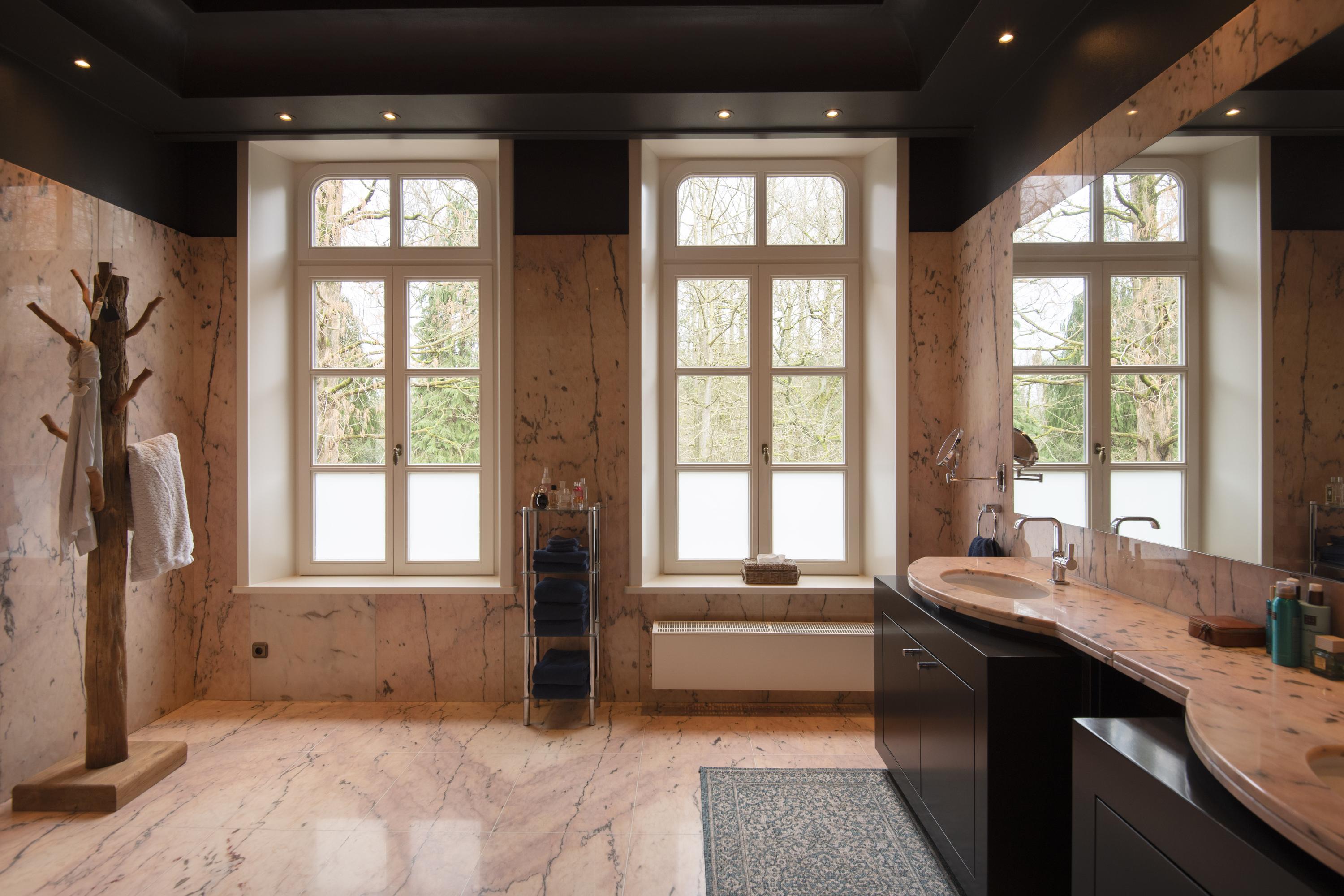 The completely nature-oriented living room consists of a sitting room and a dining room. There are two fireplaces and four pairs of French doors to the garden. The 3.60m high stucco ceilings combined with the amount of light through the high windows create a magnificent spatial experience. Double doors lead into the cozy eat-in kitchen. This fully equipped kitchen is furnished with a classic Tinello kitchen unit with a natural stone worktop, sink island and high-quality appliances. In the tower adjacent to the kitchen diner is a pantry. In the living kitchen are two pairs of double doors to the garden. The entire first floor has underfloor heating.