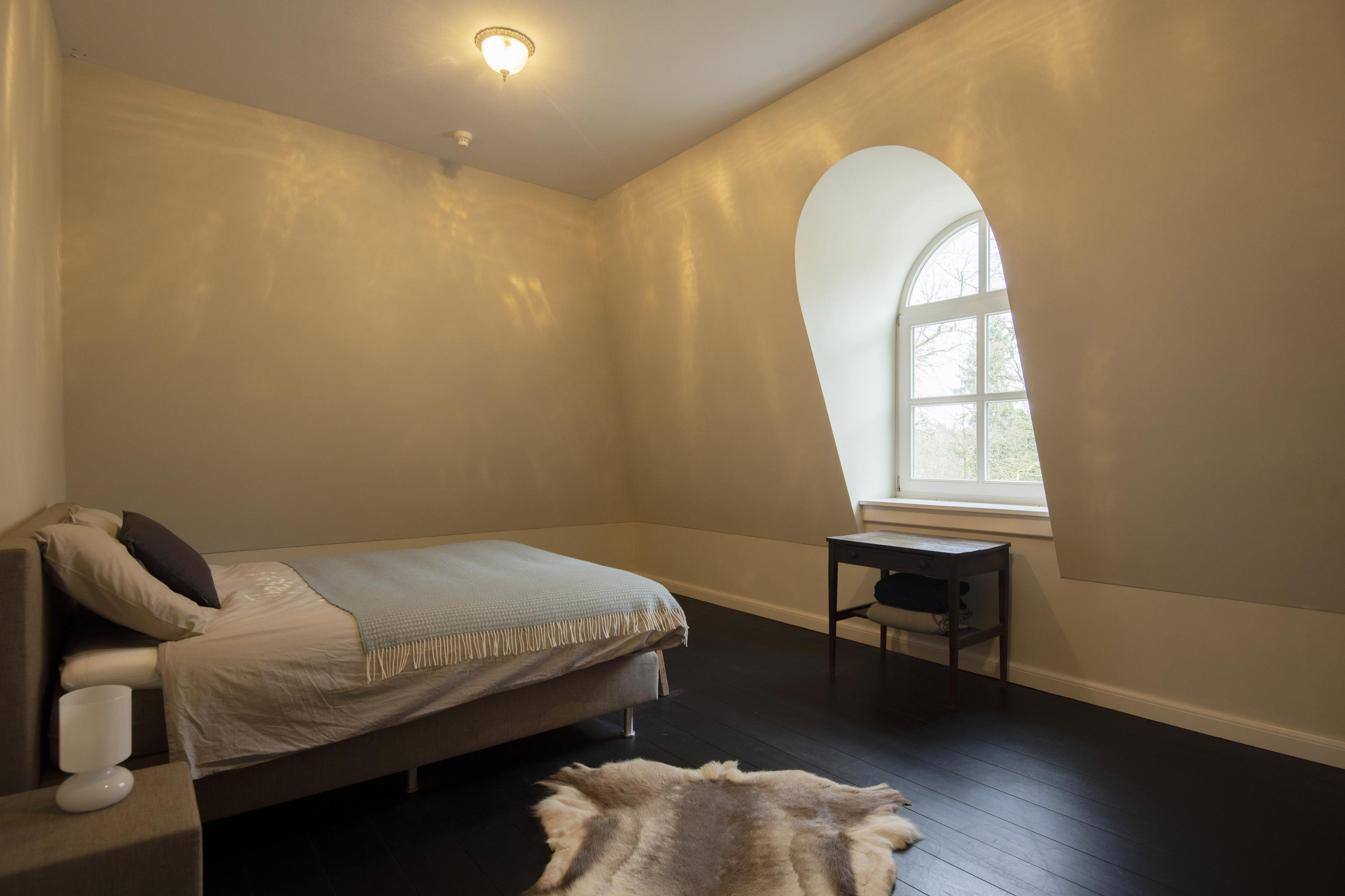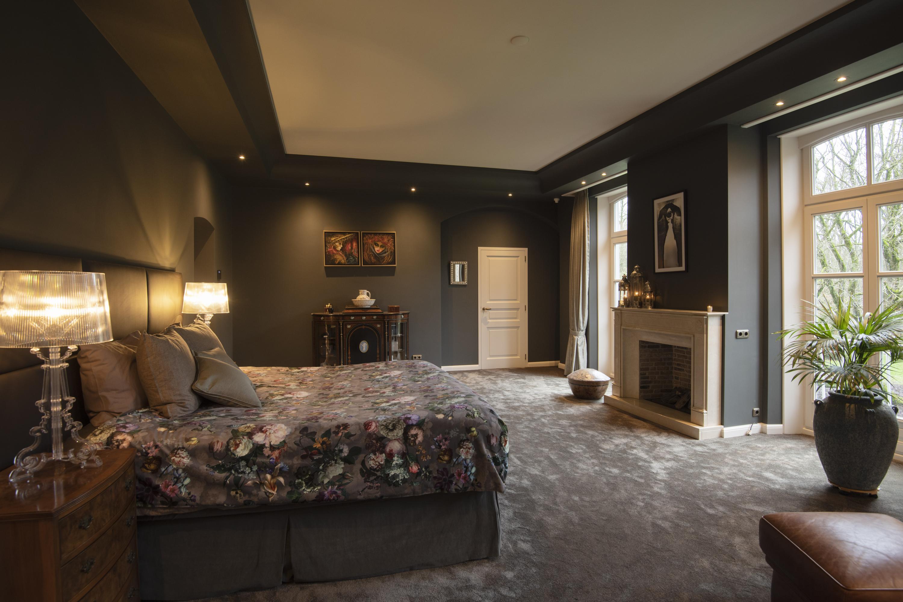 The imposing staircase leads to the second floor. The eye-catcher on this floor is the suite; a nature-oriented bedroom of 45 m2 with high stucco ceiling, three pairs of double doors to the French balconies, an adjoining dressing room and private bathroom. From this suite is also access to the tower where there is space for a shoe collection if desired. On this floor are two more bedrooms, also with French balconies. Between these bedrooms is the 2nd bathroom with double sink vanity, walk-in shower and toilet. On the landing is another separate 2nd toilet. The floor in the suite is covered with luxury carpet and the floors of the other two bedrooms are covered with parquet. This floor is also fully equipped with underfloor heating.