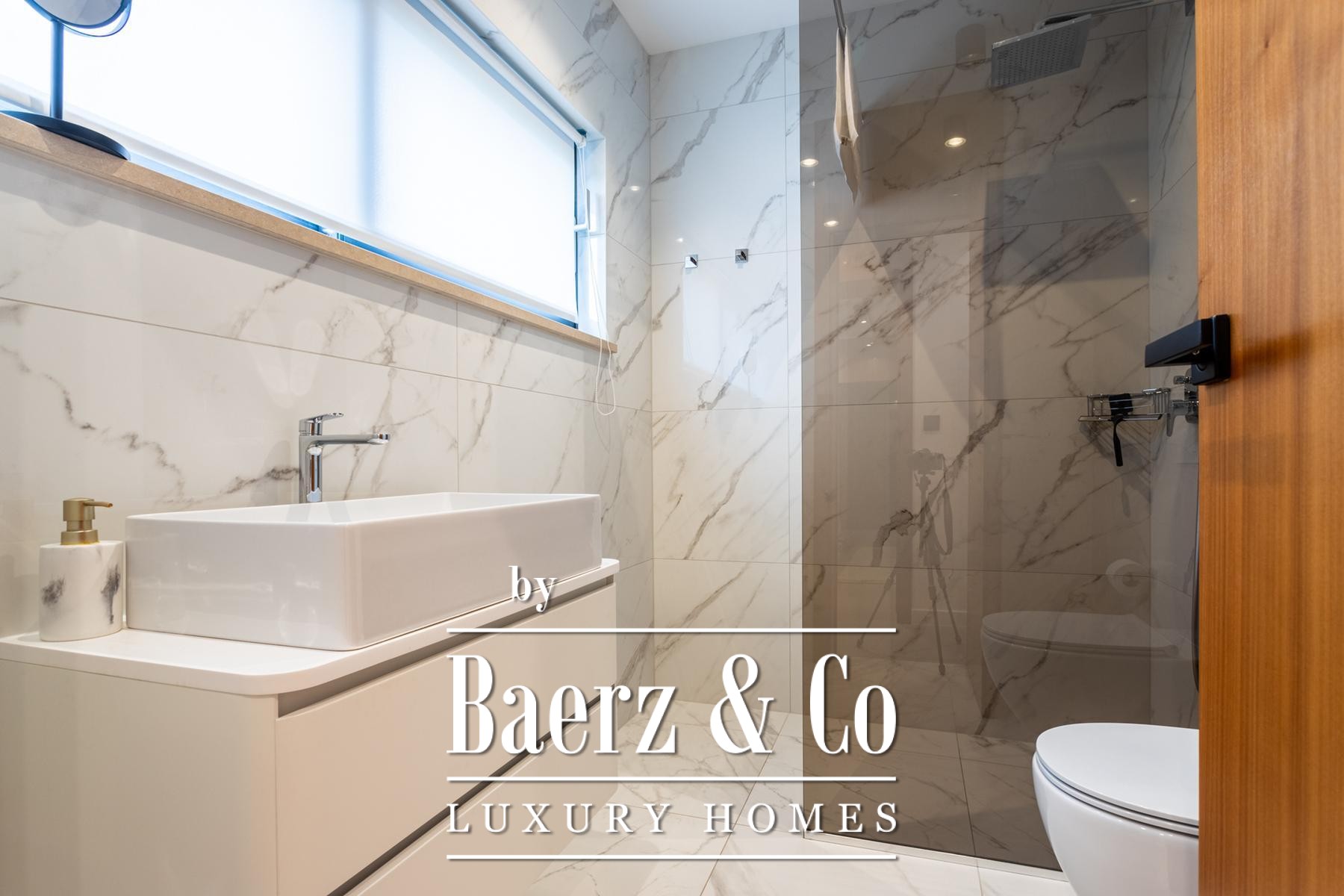 Inside, four floors accommodate four bedrooms and four bathrooms, each level revealing thoughtful design, custom furnishings, and finely tuned amenities. The basement is dedicated to wellness and leisure, with a wine cellar, sauna, games room, gym, and laundry, adding a quiet sense of luxury to daily life. The ground level flows onto a terrace with a private pool and sunbathing area, while upper floors present a contemporary kitchen, dining area, and a spacious living room with seamless balcony access.