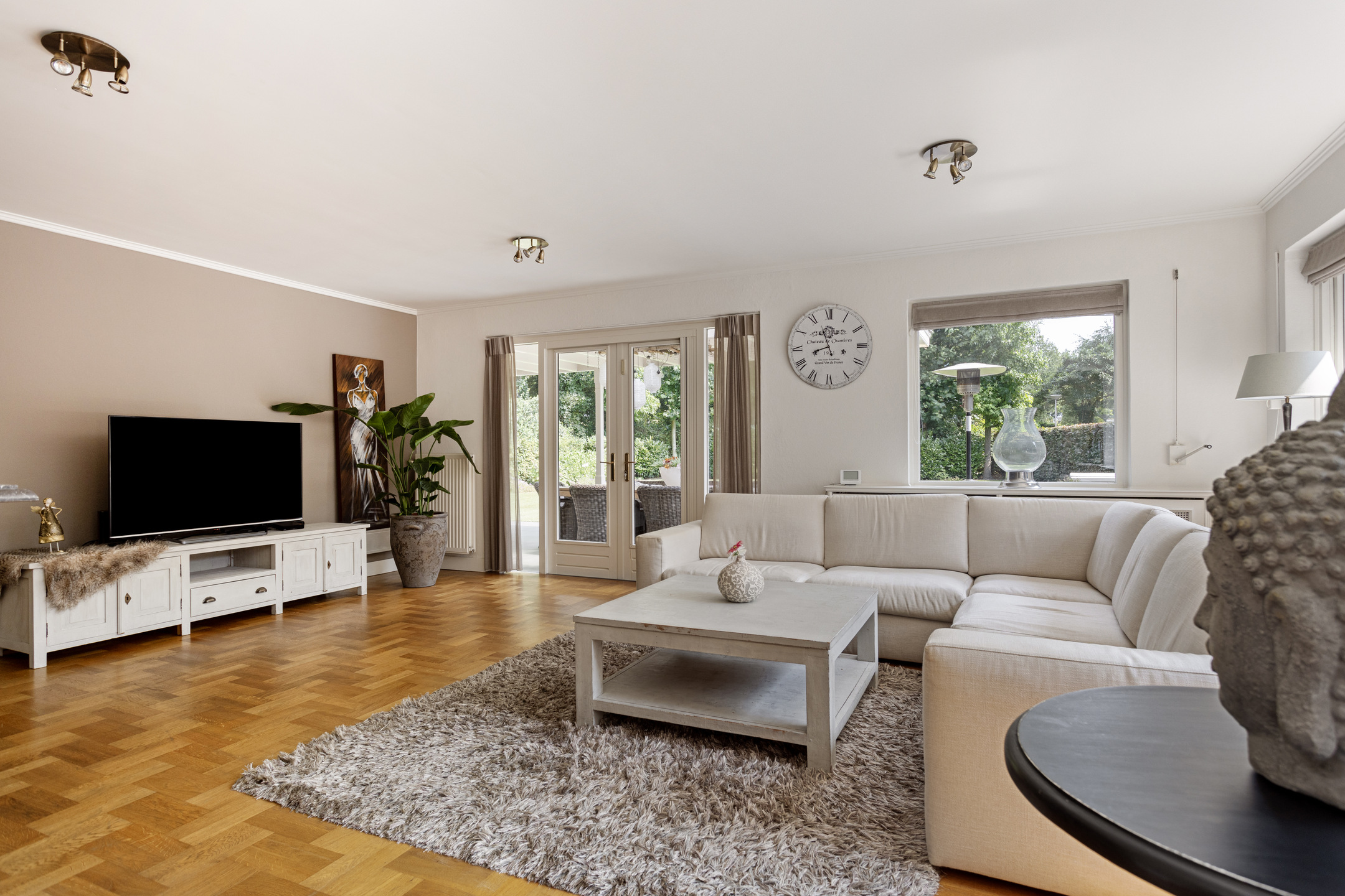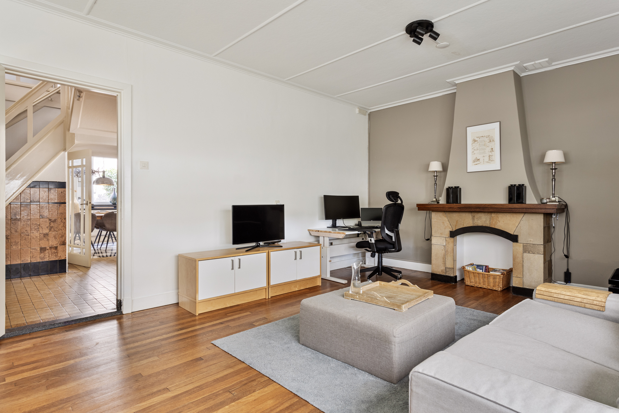 Toward the rear of the house is the garden-facing living room with double doors opening onto the terrace—ideal for enjoying the view of the lush garden. This space features a cozy open fireplace and leads to a separate room currently used as a TV lounge, though it's equally suited as a playroom, studio, or home office. A side entrance opens to a utility room with washer/dryer connections and leads into a brick-built storage room. Above this area is an additional room, currently used as an office, which could also serve well as a fifth bedroom thanks to the dormer window and roof lights.