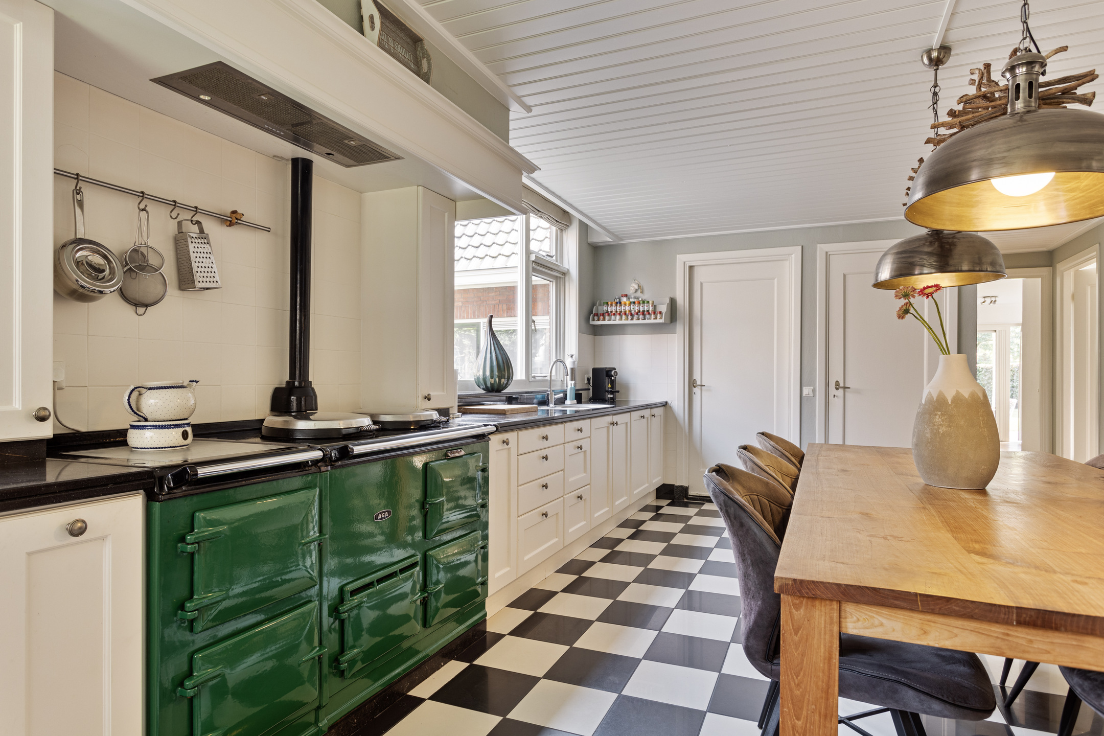 Entrance into a spacious hallway with an elegant staircase and guest WC with a washbasin. From this central space, you can access a bright sitting room or hobby space, as well as the generous open-plan kitchen. The kitchen is well-appointed with built-in appliances including a refrigerator, dishwasher, a striking AGA stove with built-in ovens, extractor hood, and ample cabinet storage. The kitchen also leads to a practical pantry cellar of approx. 10.3 m².