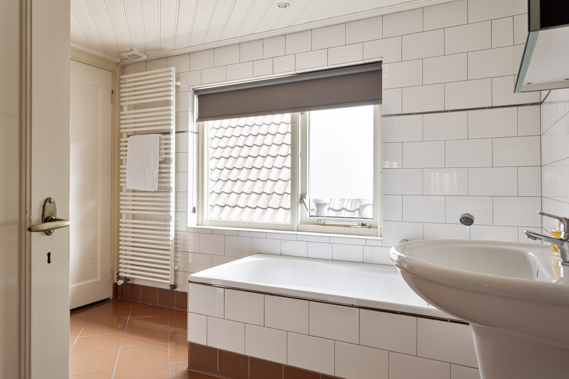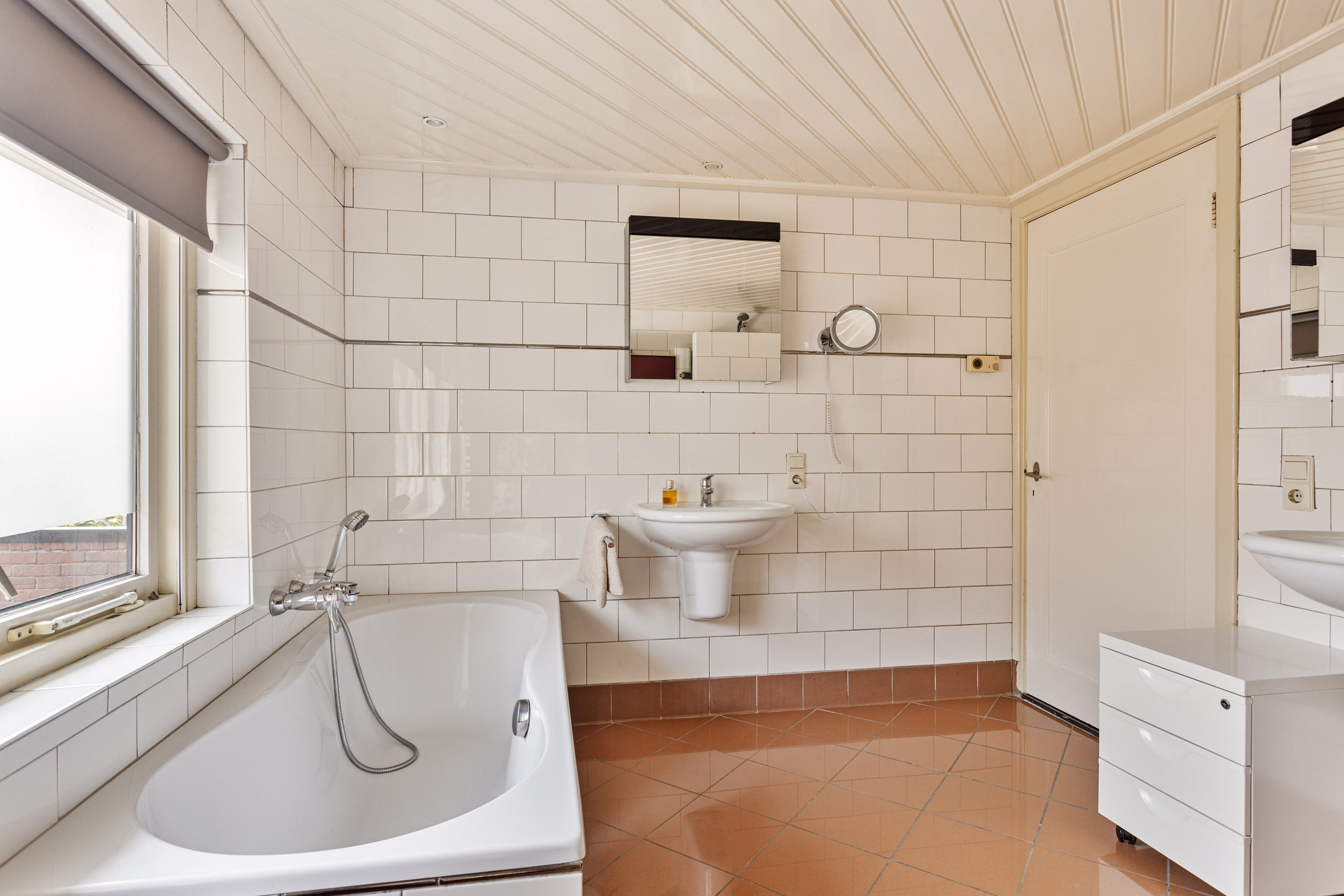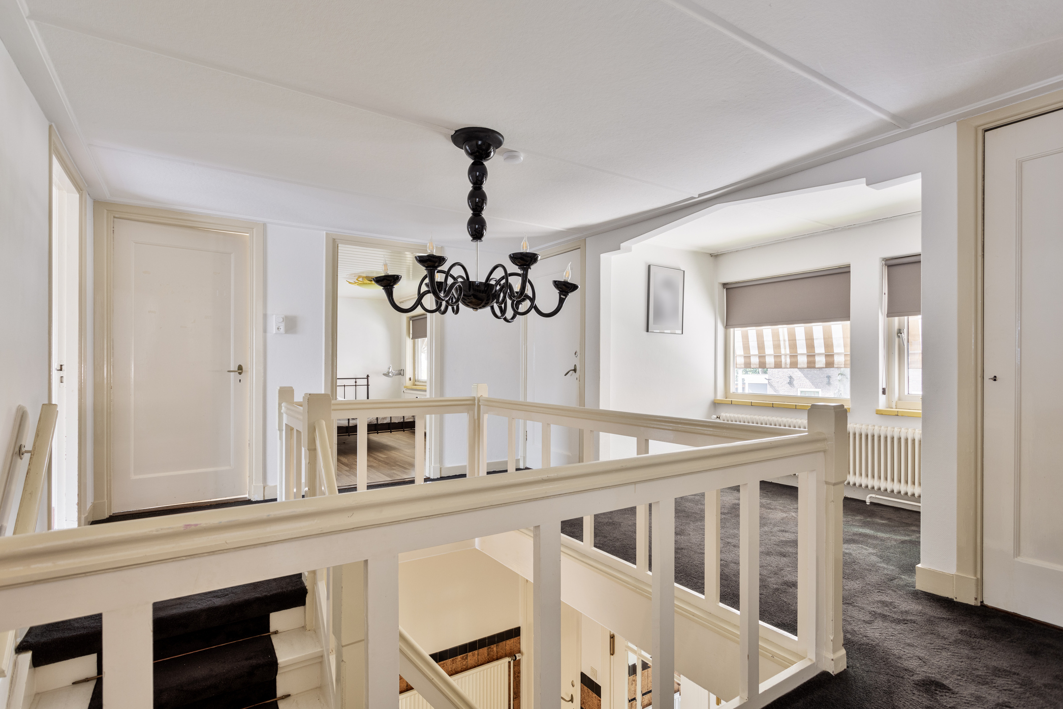 A large landing with a mezzanine grants access to four bedrooms, two of which include built-in wardrobes. The fully tiled bathroom features a shower, double sink, bathtub, and a built-in cabinet housing the central heating system. There is also a separate toilet with washbasin off the landing.