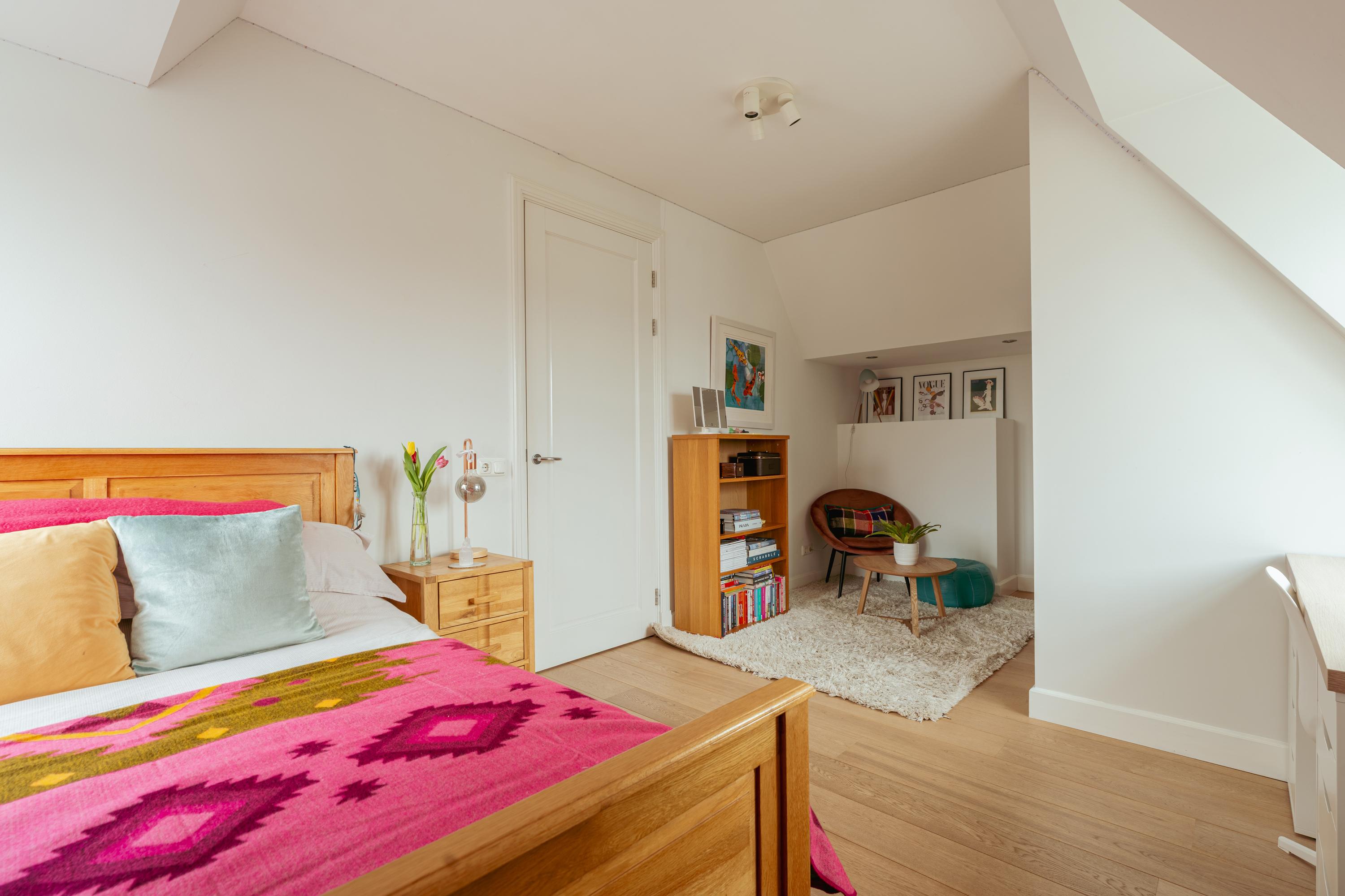 The second floor comprises two spacious bedrooms and a second bathroom, fitted with a toilet, washbasin and shower. Both bedrooms feature dormer windows on two sides, built-in wardrobes with sliding doors and air conditioning.