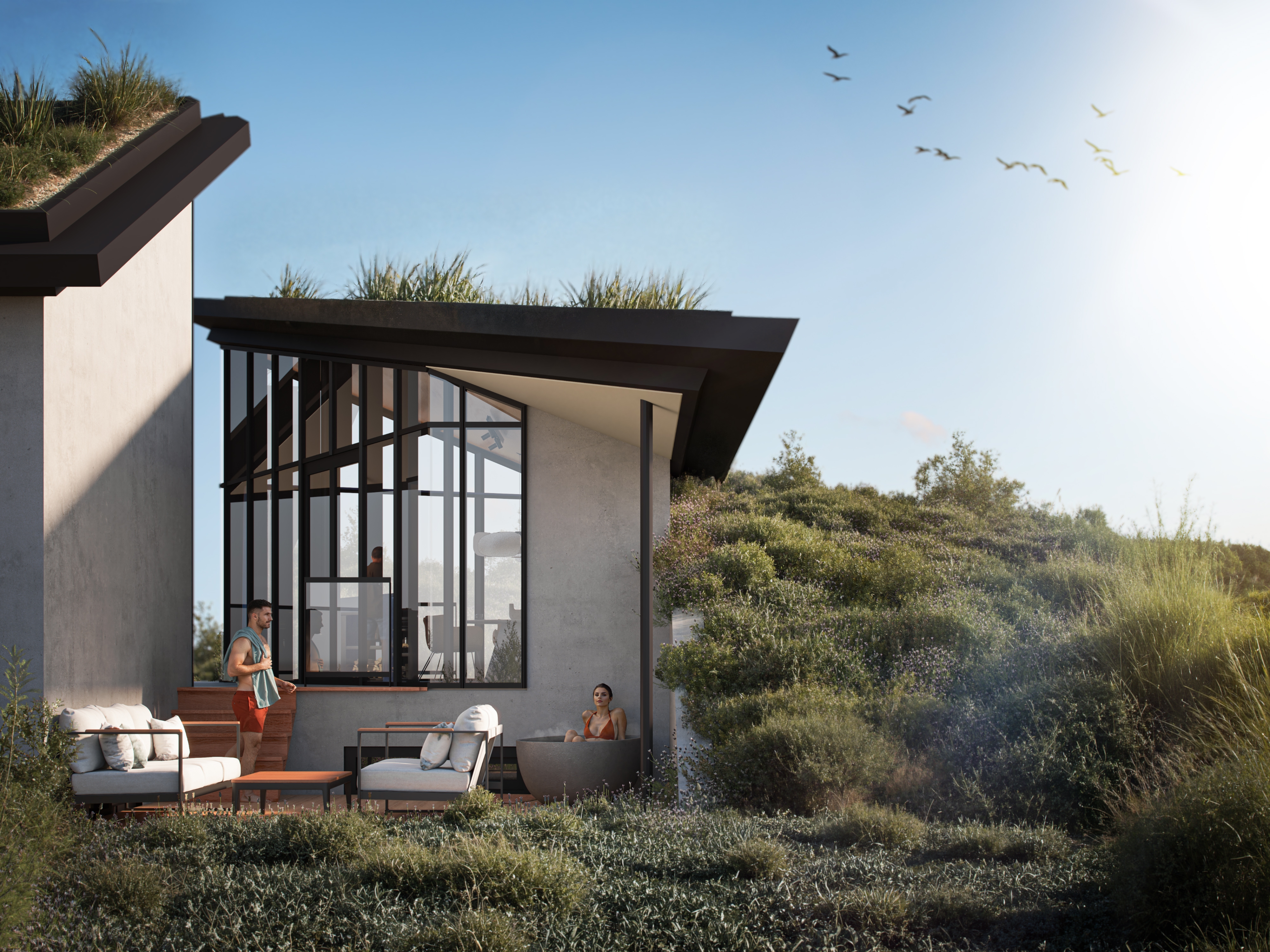 The featured home provides 118 m² of living space, arranged across three bedrooms and two bathrooms. Every detail has been carefully considered, from the quality finishes to the orientation of spacious terraces that capture uninterrupted dune views. The overall atmosphere is one of serenity, privacy, and understated comfort—a subtle harmony between indoor refinement and the wild beauty outside.