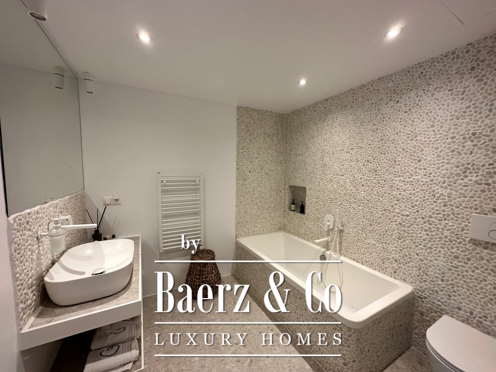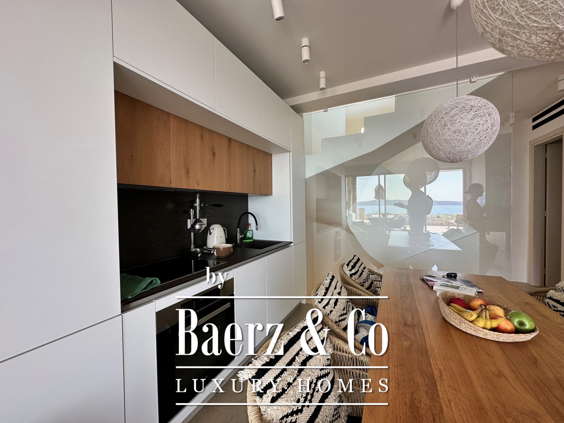 Terraces define the rhythm of daily life, one with a heated swimming pool and hot tub, the other hosting a covered dining table for meals that flow from sunlit breakfast to midnight cocktails, all overlooking the sea. The basement master suite is marked by distinctive natural light filtered through the pool, while amenities such as air conditioning, heat pump, and autonomous heating provide year-round comfort. The property also offers a sauna and double-glazed insulation.