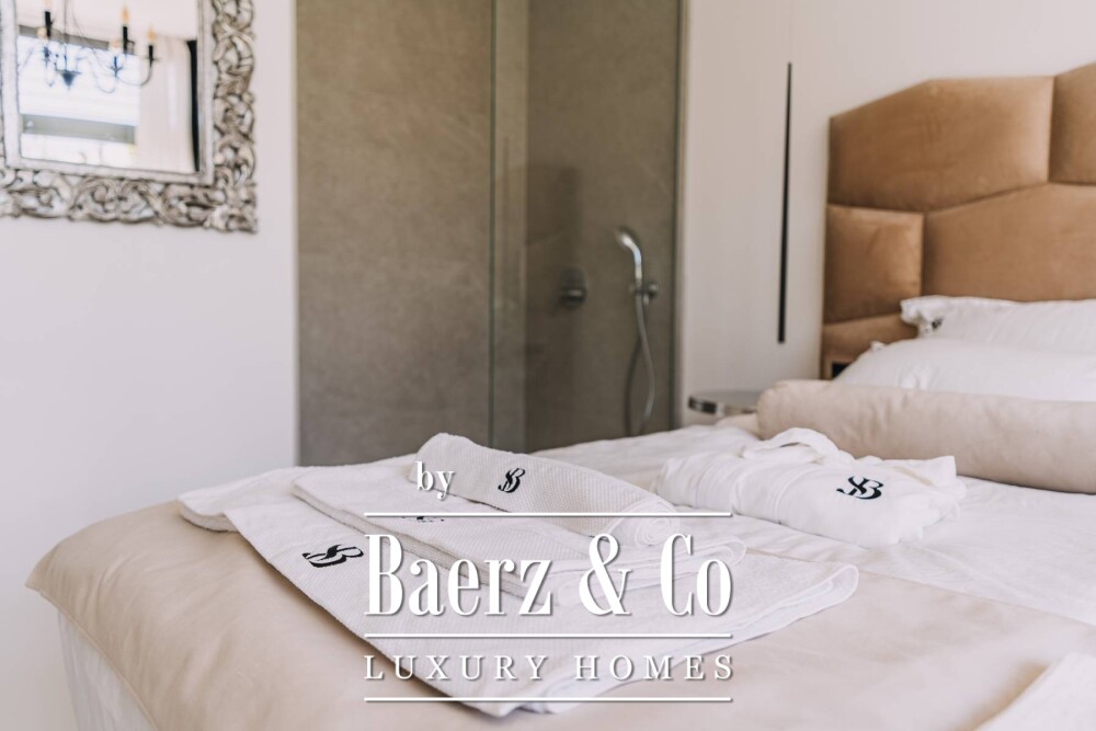 Built in 2023, the villa employs high quality materials and is equipped with solar panels, advanced appliances, and tasteful furnishings. Wellness touches include a 60 m² heated swimming pool with hydromassage, a spacious jacuzzi on the sun terrace, and an in-house sauna. The upper balcony opens to tranquil views, while outdoor spaces invite private relaxation, whether on the sundeck or the covered lounge area. Every element has been curated for a measured pace of life, anchored by privacy and natural light.