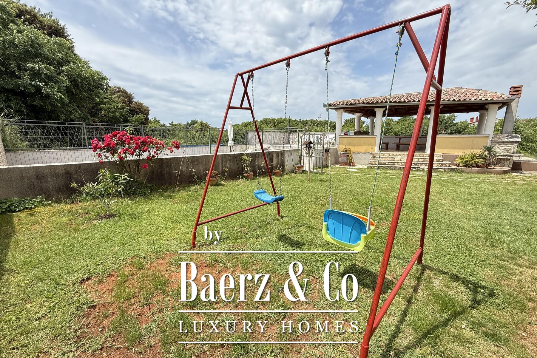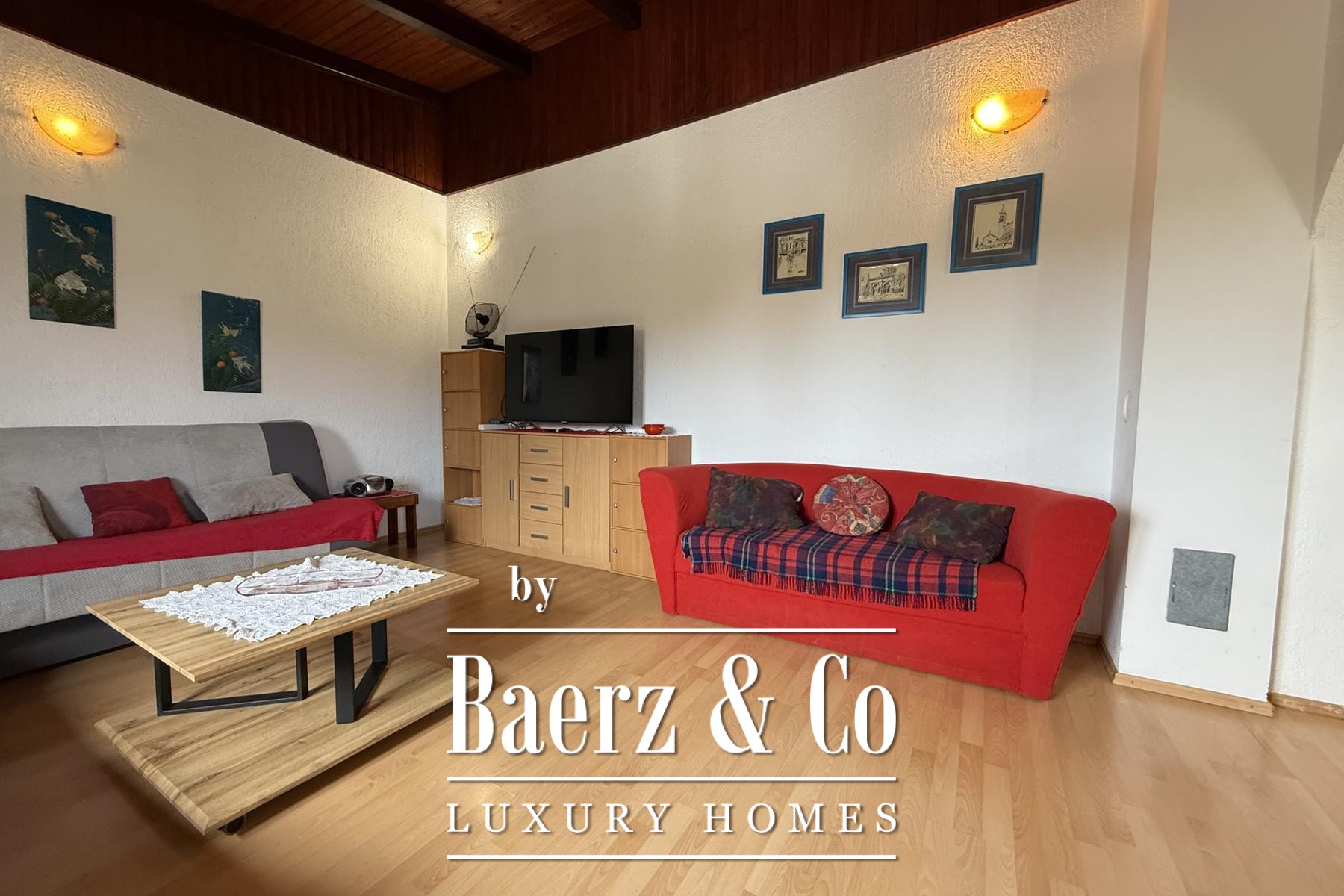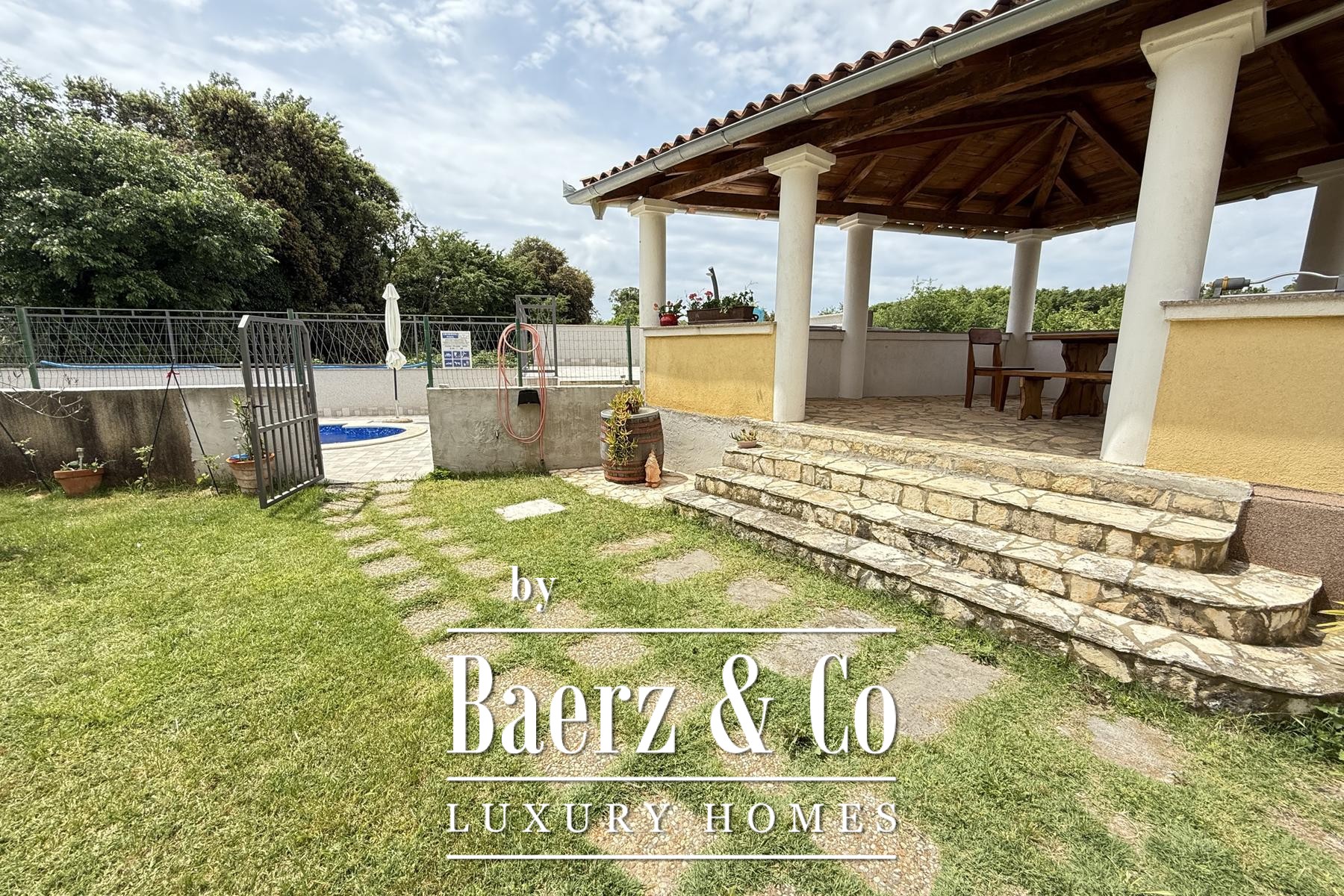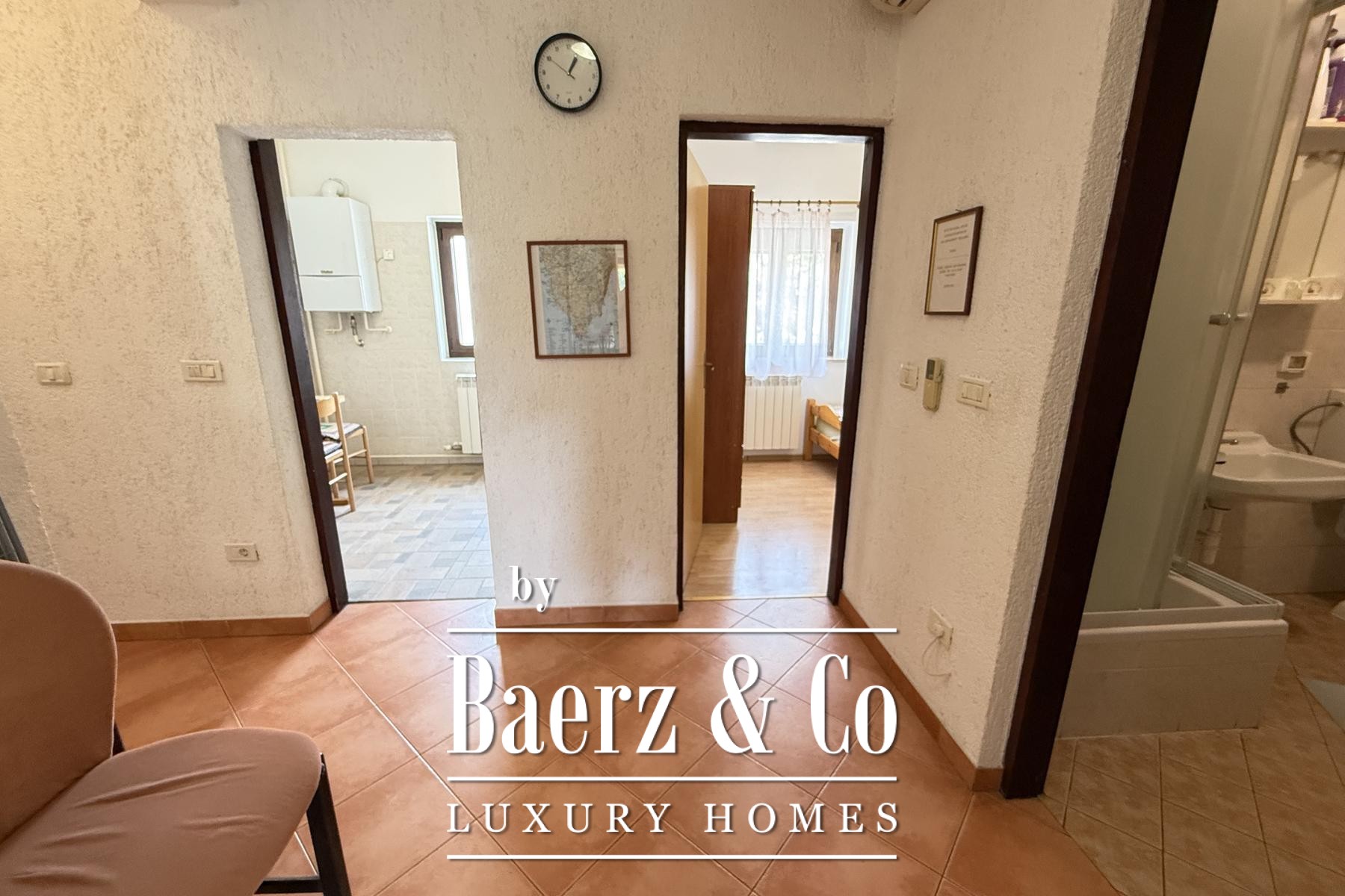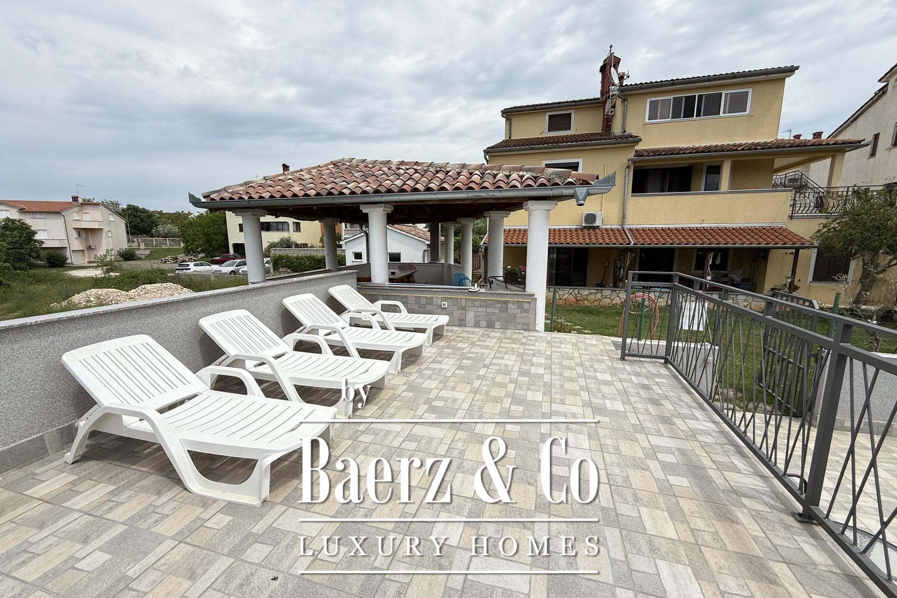 m2) which is partially covered.The apartment on the second floor has an area of 76.47 m2 and consists of an entrance hall, a hall, a spacious living room, a kitchen, two bedrooms, a bathroom.In the courtyard of the building there is a fenced 22 m2 swimming pool with a sunbathing area and a covered area for socializing. Enough parking spaces. Garage. Additional smaller studio apartment with a bathroom.The house was built in 1996. The heating is gas-fired. Separate electricity meters. There are a total of seven air conditioners distributed throughout the apartments. PVC windows. Mosquito nets.The house is intended for tourist rental, but if the future owner wishes, it can also be turned into a long-term rental. Excellent location, near the shop, while the sea is only a few minutes drive away.Ownership is in order.For more additional information and to arrange a viewing date, we are at your disposal.