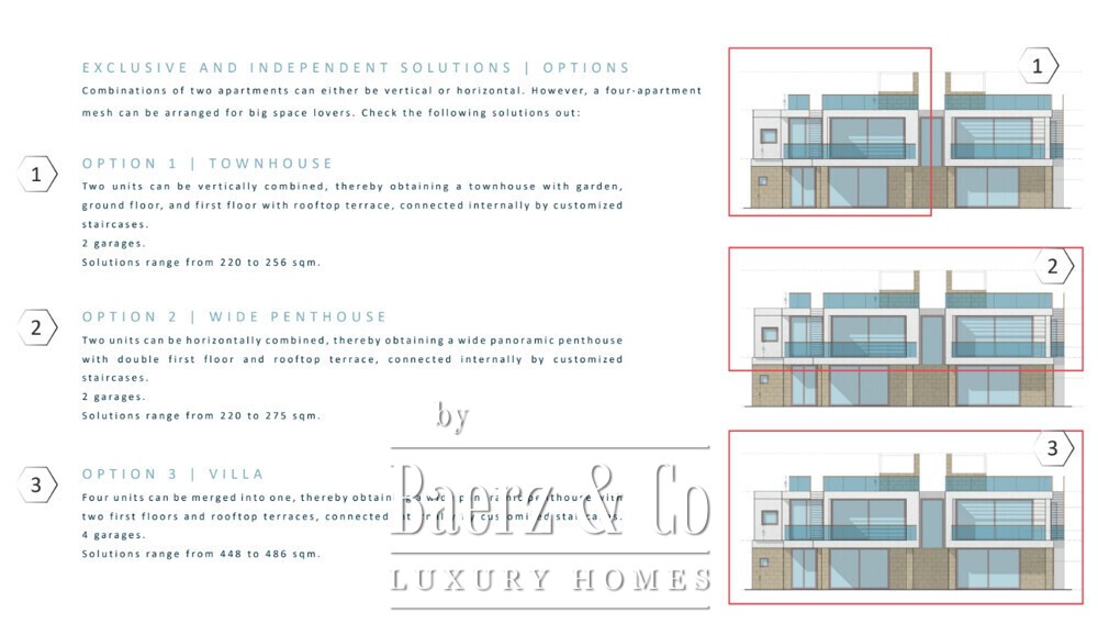 The architecture is refined, with interiors ranging from 104 to 200 m², generous terraces overlooking the sea, private gardens, and bespoke finishes. Every element speaks to a standard of elegance and exclusivity that is felt throughout the apartment.