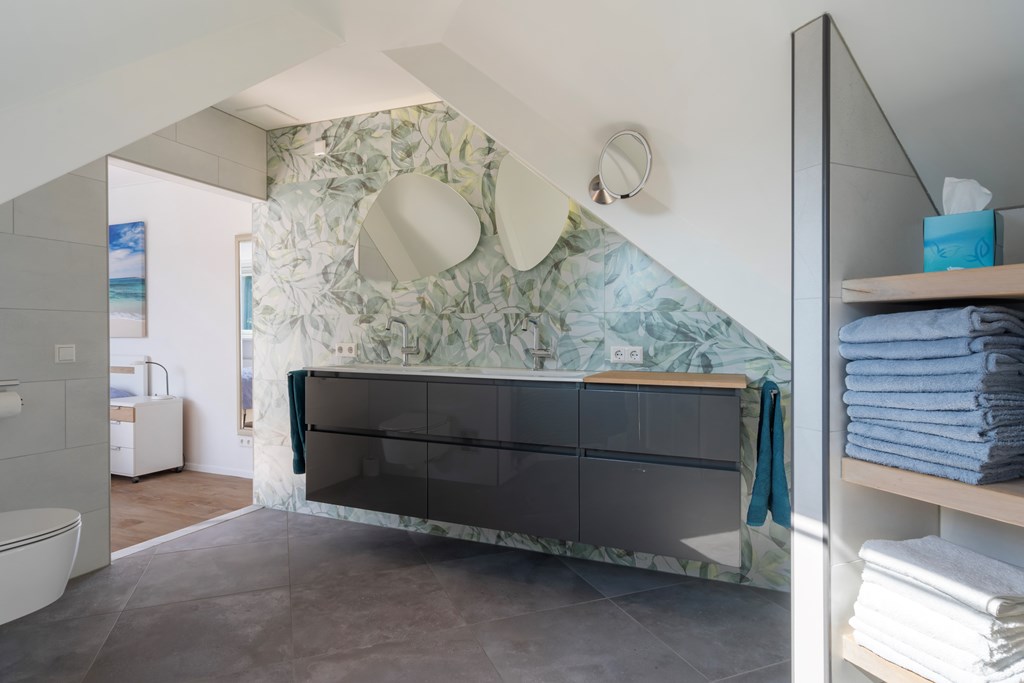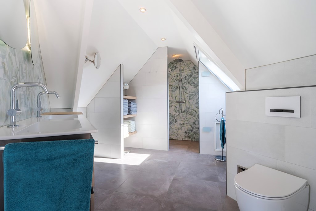 On the ground floor, the hall includes a separate WC with small washbasin. On the first floor there are two bathrooms. The en-suite bathroom to the primary bedroom was fully renewed in 2020 and finished to a luxury standard with a walk-in shower, Sunshower, designer radiator, double washbasin, and toilet; the tiled floor has underfloor heating for extra comfort. The second bathroom, finished with white marble tiles, includes a shower, washbasin, toilet, and designer radiator.