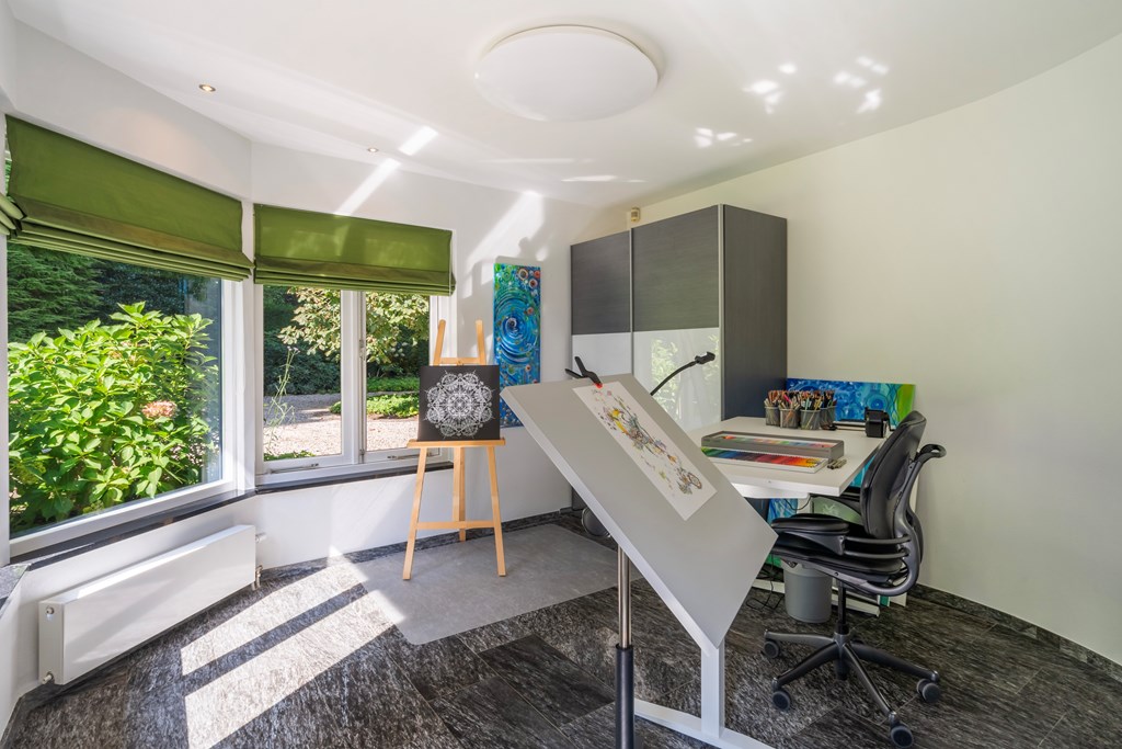 You enter a spacious, bright hallway giving access to the living room, a study, WC, meter cupboard (21 circuits + fiber), and the staircase. The study is ideal—perfectly placed for receiving clients, for example. The generous living room has a distinctive layout, making it easy to create multiple seating areas. Large windows all around provide beautiful garden views and abundant light; a cosy gas fireplace adds warmth. Twin sliding doors open directly onto the sunny rear garden. On the sunny side, external screens provide extra comfort.