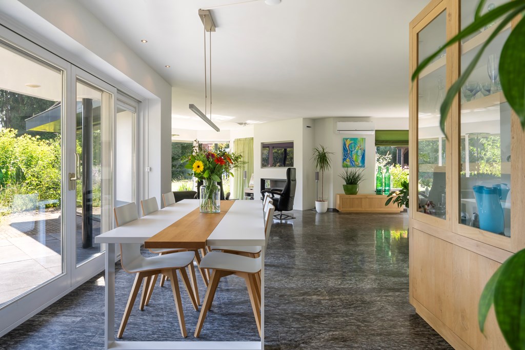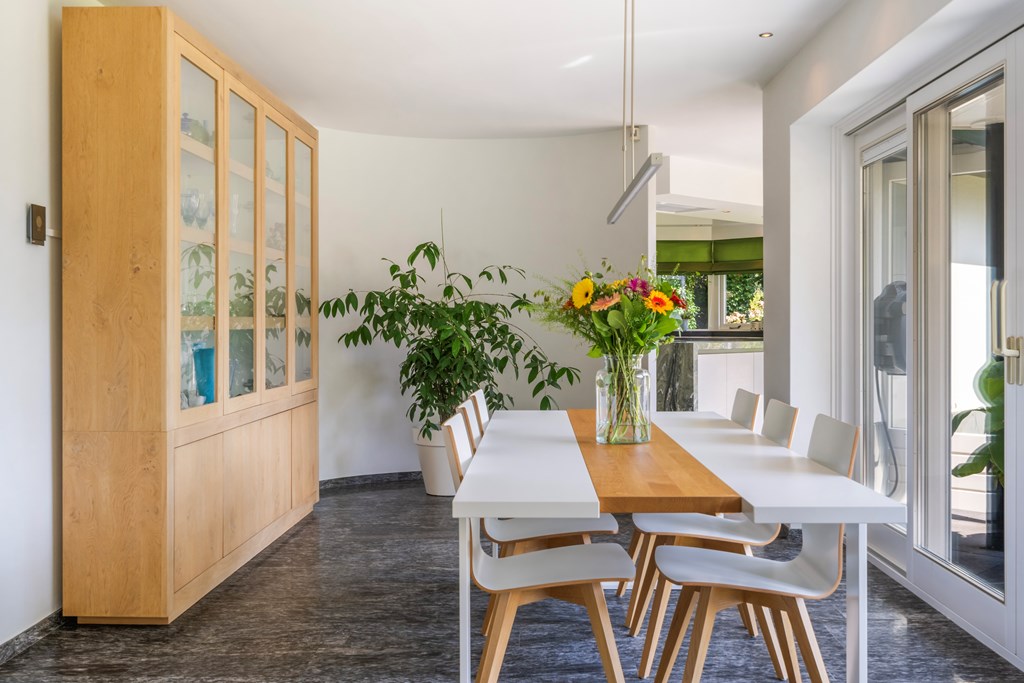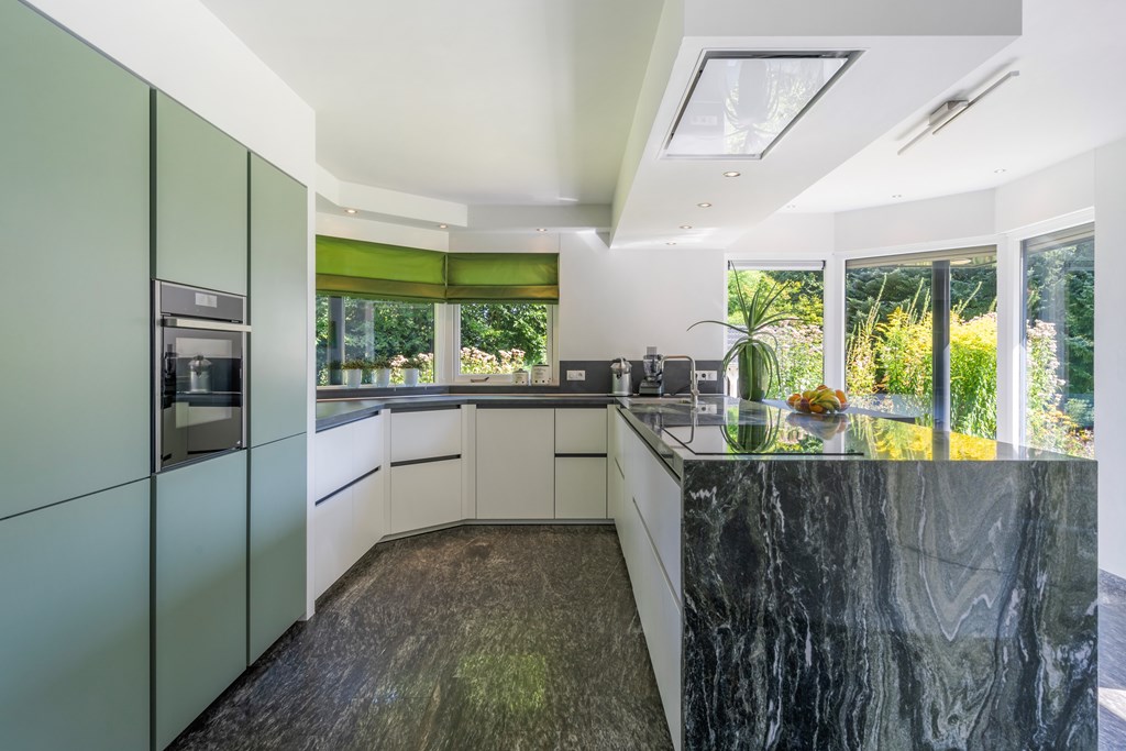 The generous U-shaped kitchen (installed in 2020) is fitted with high-quality appliances. Thanks to its ample size and practical layout, it has everything you need: a large natural-stone worktop, five-burner hob, baking oven, ceiling-mounted extractor unit, dishwasher, tall refrigerator, tall freezer, and extensive cabinet storage. This modern kitchen offers plenty of space for serious cooking. From here you have a lovely view of the side and rear garden and direct access to the terrace.
