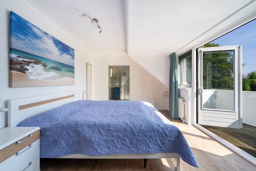 The landing leads to three bedrooms and a bathroom. The primary bedroom is spacious, has air conditioning, and features an en-suite bathroom. Double French doors open to a balcony with wide views over the green garden. A bright walk-in wardrobe adjoins the bedroom. The second and third bedrooms are at the front, each with a large built-in wardrobe, space for a king-size bed and a desk, French door to the front balcony, and air conditioning. Sloping ceilings, high ridgelines, and exposed wooden beams give the entire floor an atmospheric, characterful feel.