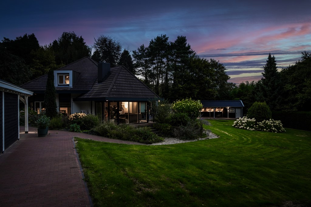 The driveway brings you onto the beautiful plot, bordered by plants and trees. The lush southeast-facing rear garden offers a green, open landscape. With a large lawn, there is ample space for children to play—or simply enjoy the peace, sun, and privacy. A paved terrace at the house provides a wonderful view over the garden. There is also a second, covered terrace where you can relax in the shade on warm days—this forms part of the new (2022) barn-style shelter with storage for garden tools, chairs, etc.