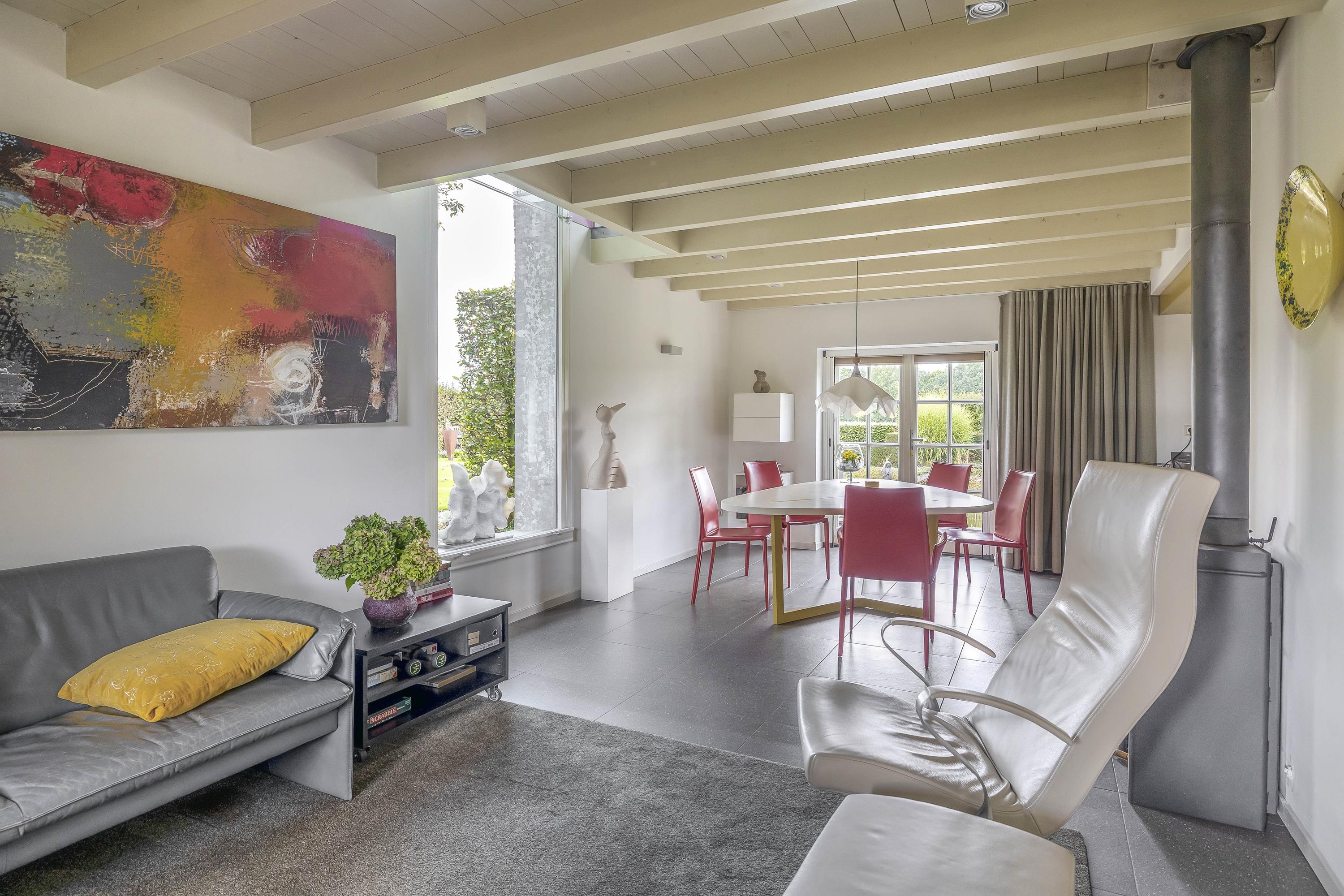 Double doors from the kitchen lead to the living room, which has a smooth, polished concrete floor with underfloor heating. The living room has stucco walls and a beautiful wooden beamed ceiling with attractive old oak beams. A large window at the front and double French doors at the rear offer a beautiful view of the garden. Here too, a wood-burning stove has been installed for extra warmth and cosiness.