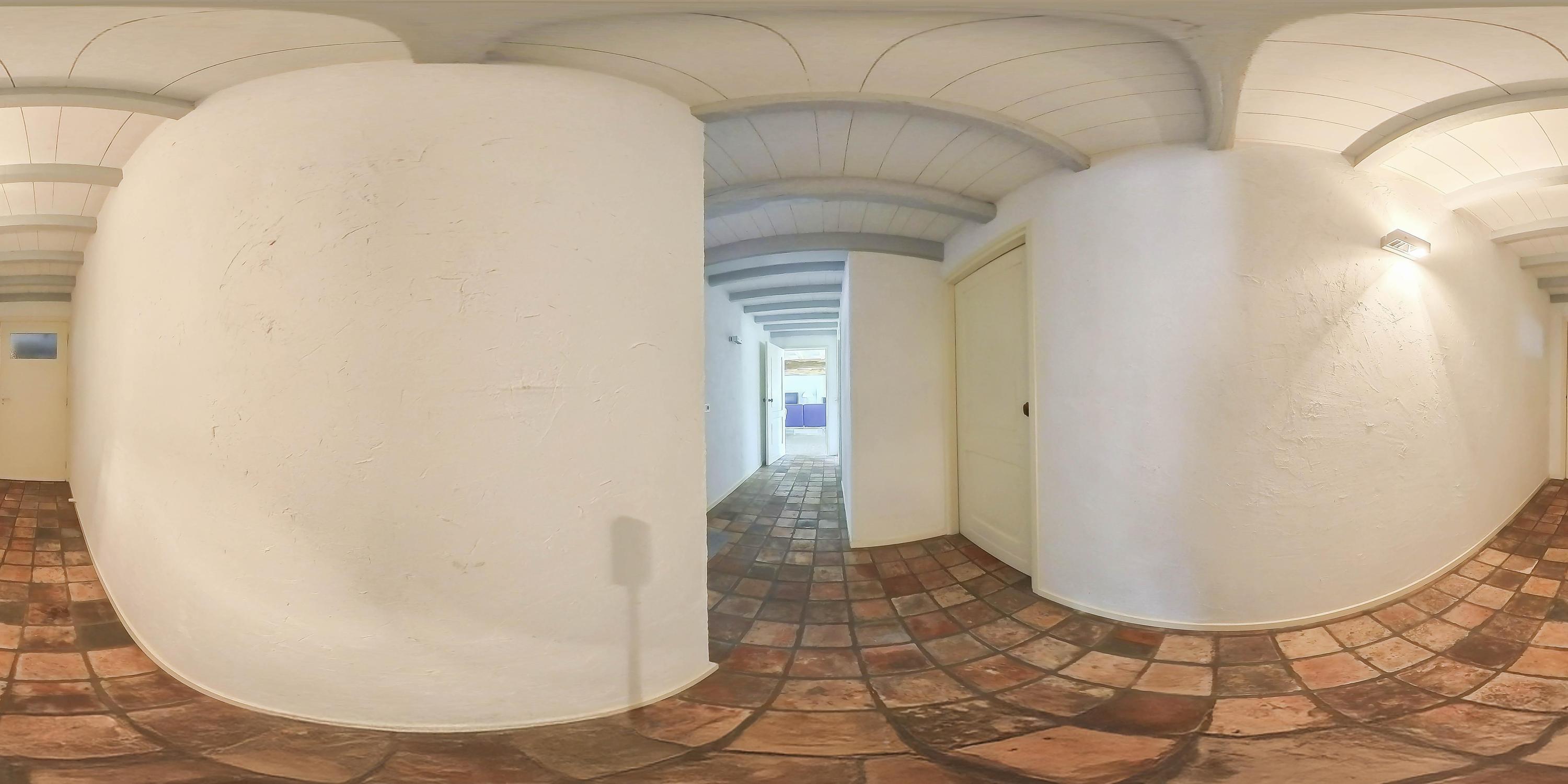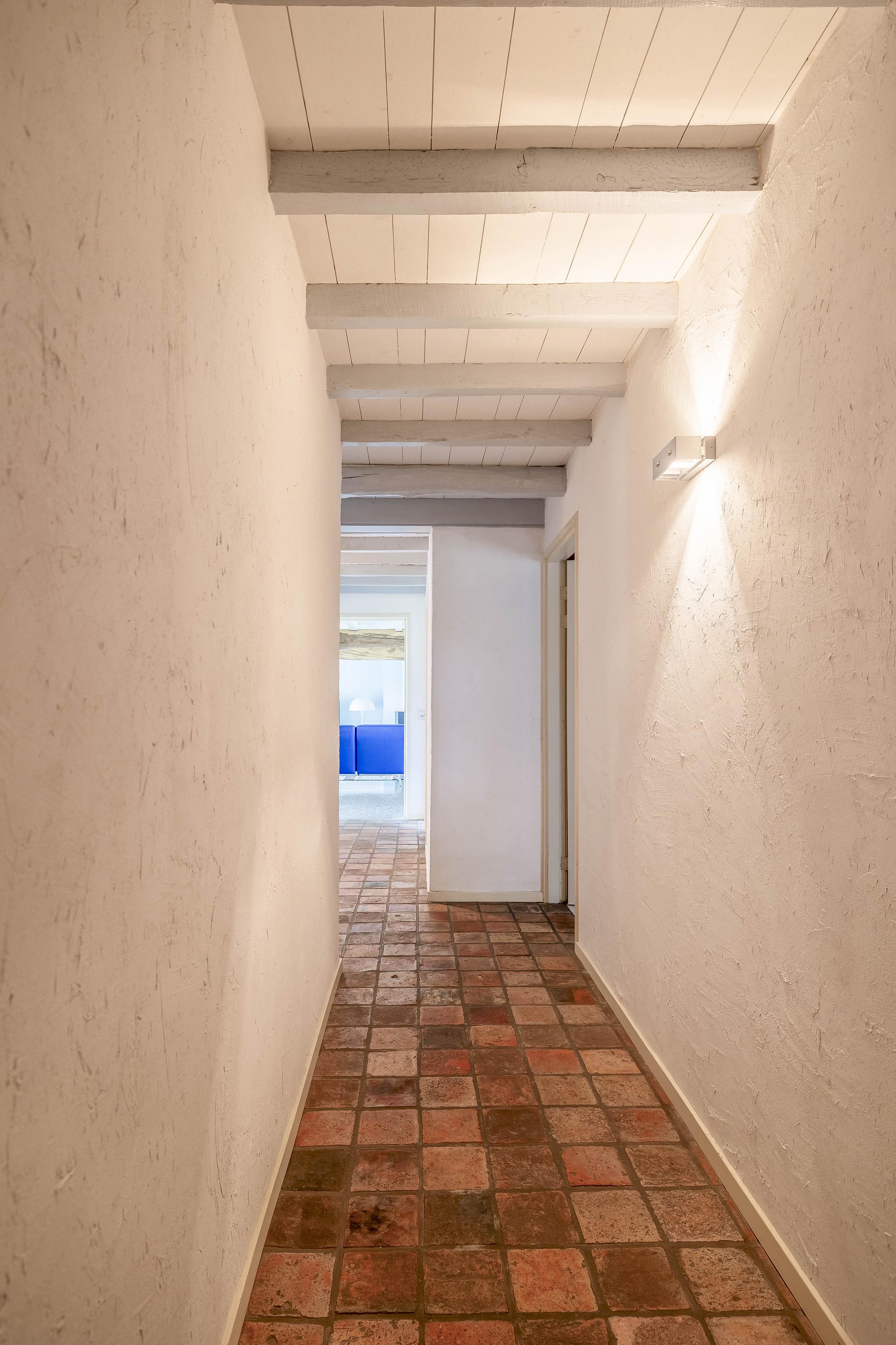 From the living room, you walk to the right side of the house, where a hallway (with automatic lighting) leads you to two bedrooms, the first bathroom, and the garage. This hallway has an old tiled floor, stucco walls, and an old beamed ceiling.