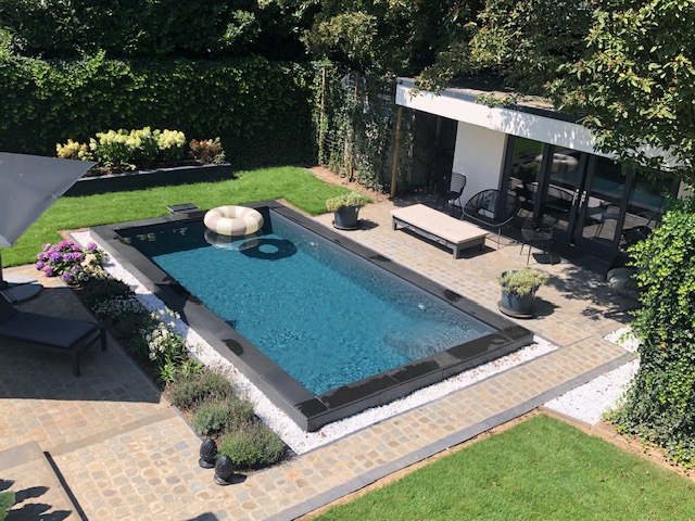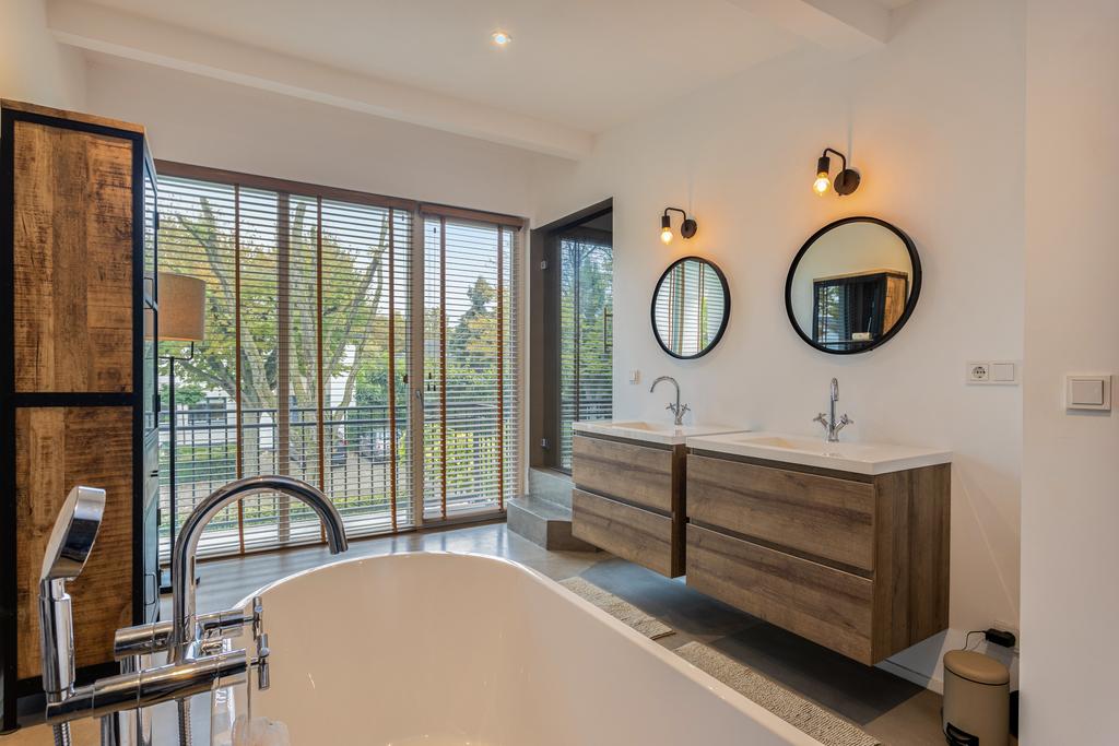 The side and rear gardens are accessible via four large sliding doors. All rooms are finished with either a modern concrete-look floor or a classic wooden herringbone floor. The kitchen is designed around a central island and is fully equipped with all necessary built-in appliances.
