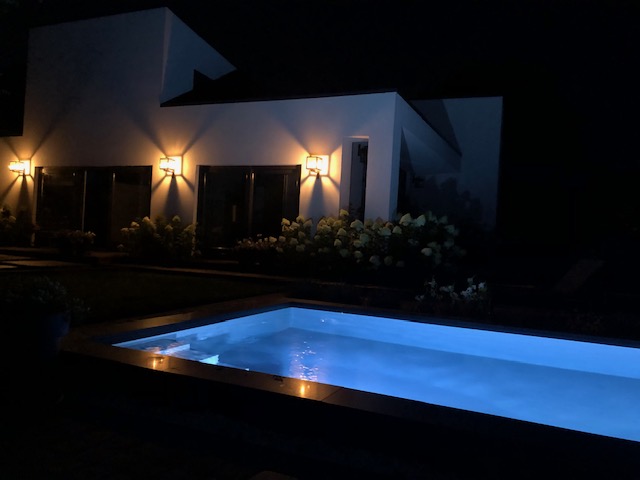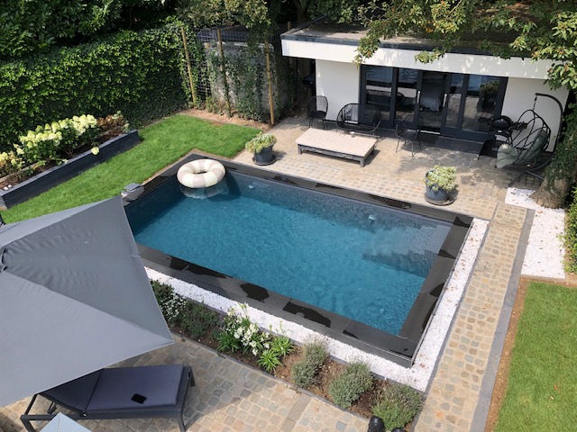 The fully enclosed, beautifully landscaped west-facing rear garden features a stunning swimming pool, a lush lawn, various borders, and multiple terraces. The street itself is characterized by mature trees, offering a rustic and atmospheric setting.