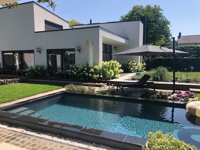 In addition to the detached garage at the back right of the garden, a dedicated guest house is located at the back left—ideal for guests, teenagers, or a home office. This space (approx. 20 m²) consists of a living/work area, a shower room, a toilet, a kitchenette, and its own covered terrace.