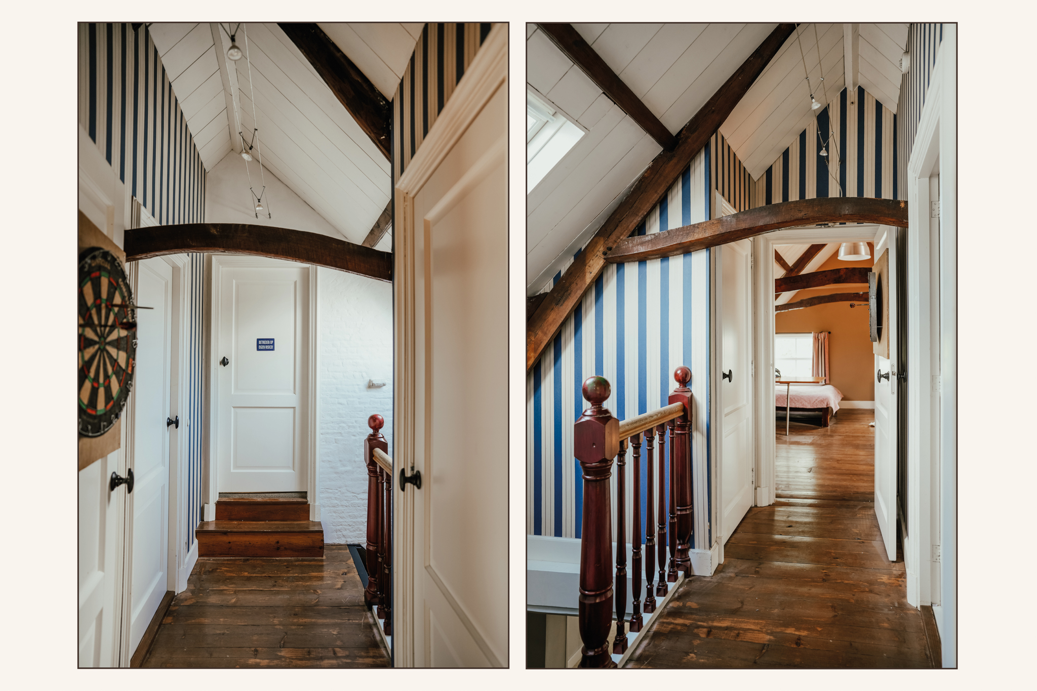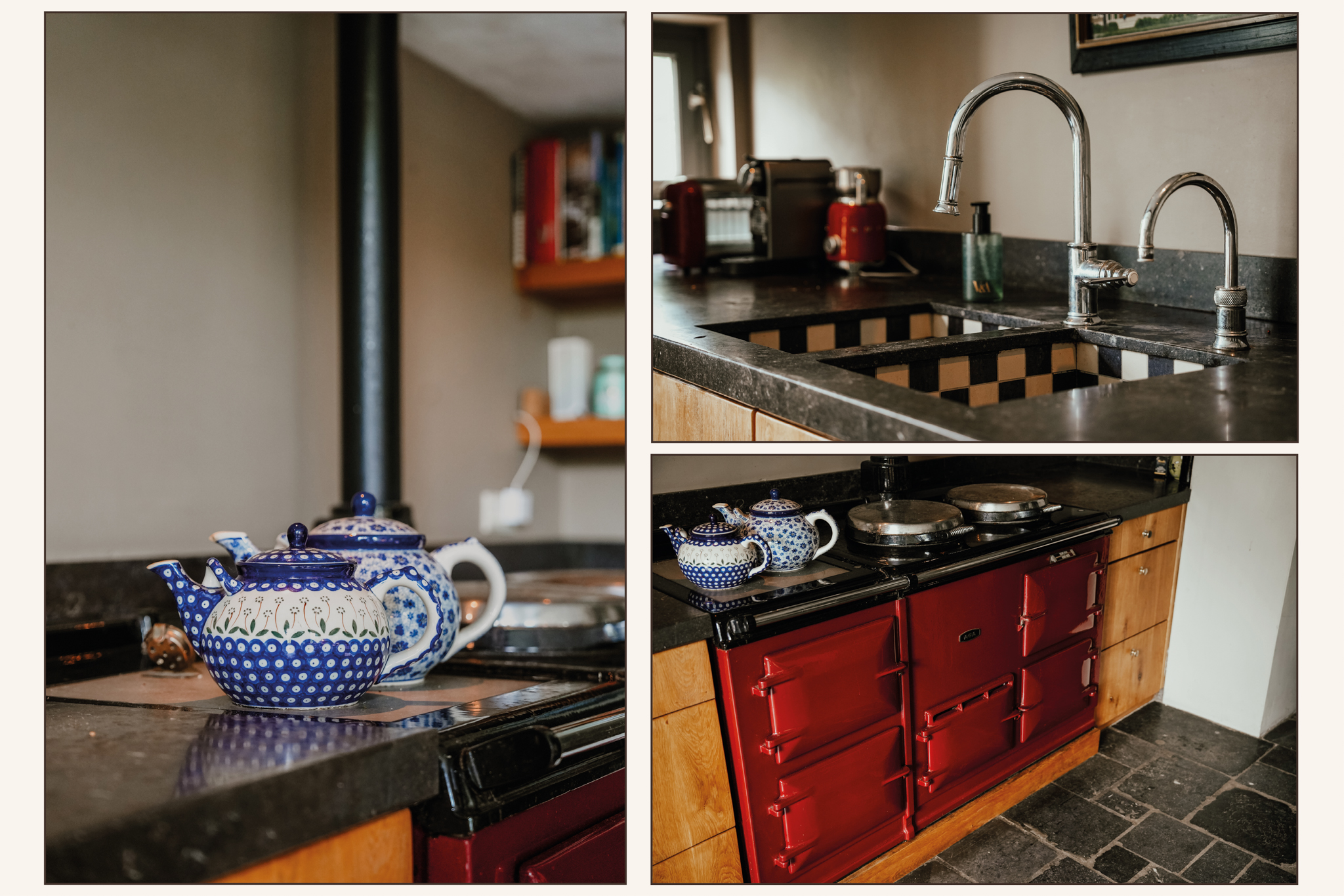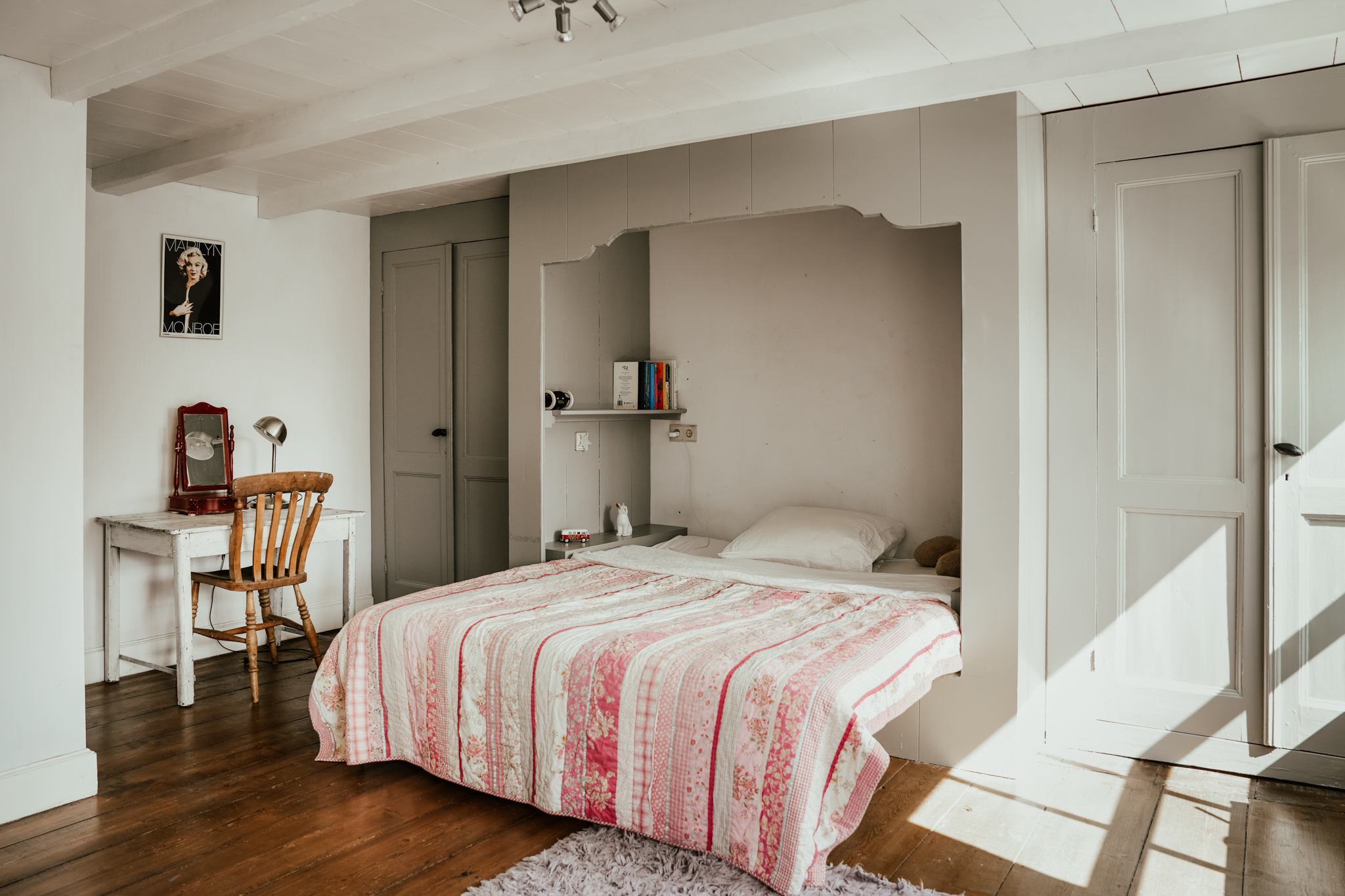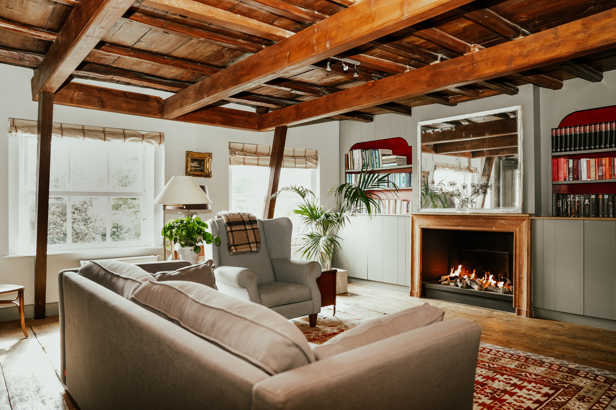 The main house offers a rhythm of gracious spaces: a light-filled living room with open fireplace, a garden-facing dining room, a bespoke oak kitchen anchored by an AGA and stone fireplace, and a study overlooking the village’s historic avenues. Each room reveals thoughtful preservation—tall sash windows, Versailles parquet, and original beams—supported by quiet technological advances including underfloor heating, vacuum-insulated glass, and new solar installations. A fully independent guesthouse, with its own living space and bathroom, provides comfort for visitors or family.