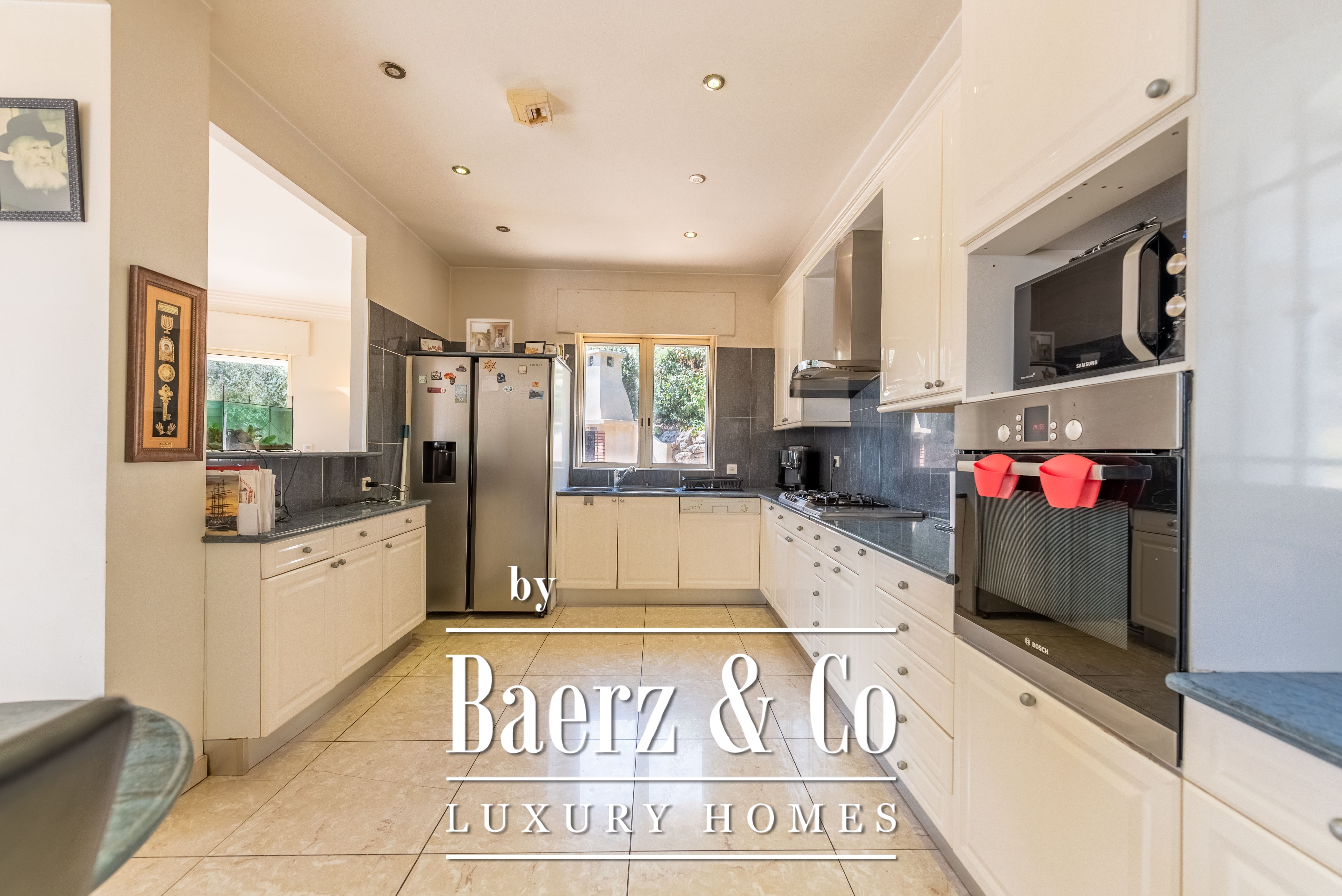 The 1,511 m² landscaped plot surrounds the home with mature gardens, multiple terraces, and an infinity pool. On the lower level, find a games room, double garage, and utility spaces. Features such as aluminum frames, central electric shutters, alarm, video surveillance, and electric gate enhance peace of mind.