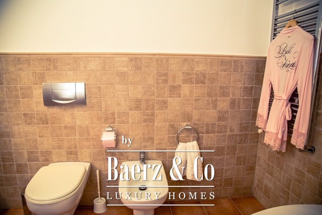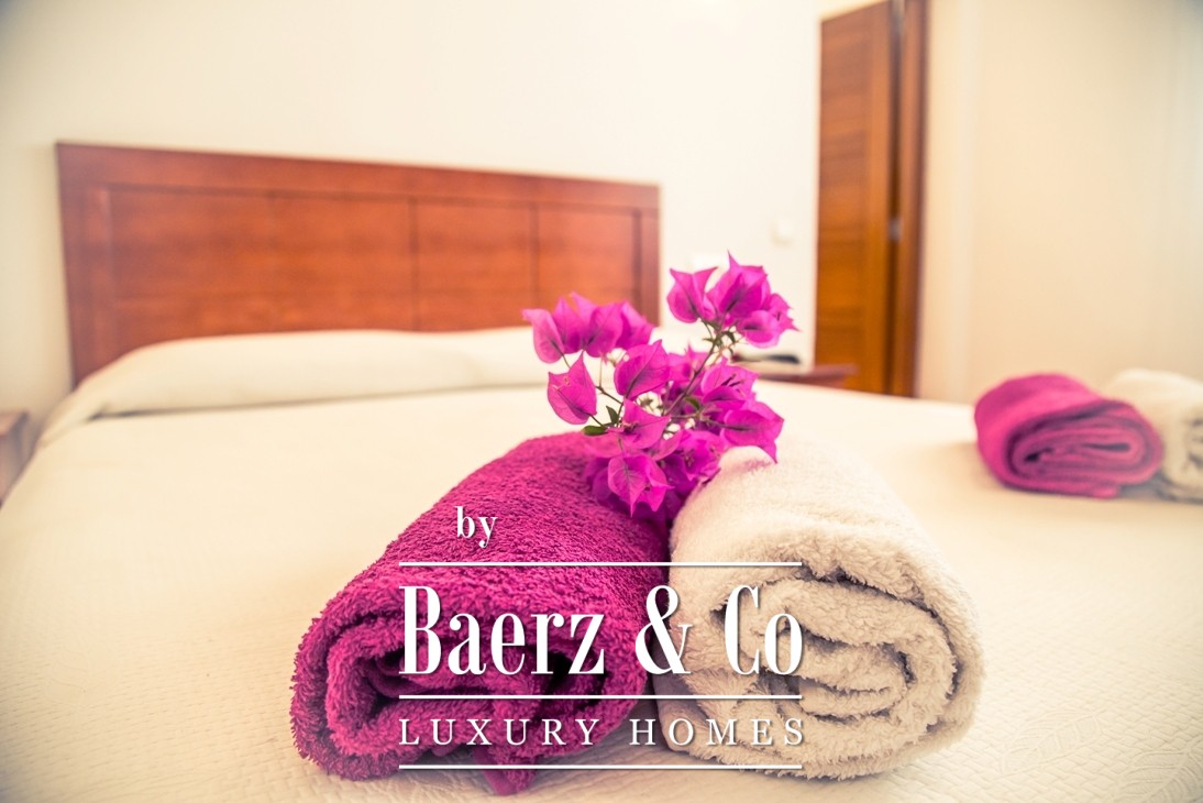 Spanning 216 m², the residence presents three spacious bedrooms with fitted wardrobes and two bathrooms, including one with a jacuzzi. The interior rhythm is set by a generous living area, where a fireplace introduces warmth, complemented by air conditioning and central heating for year-round comfort. All rooms are designed for practical elegance, and the property is delivered furnished for immediate ease.