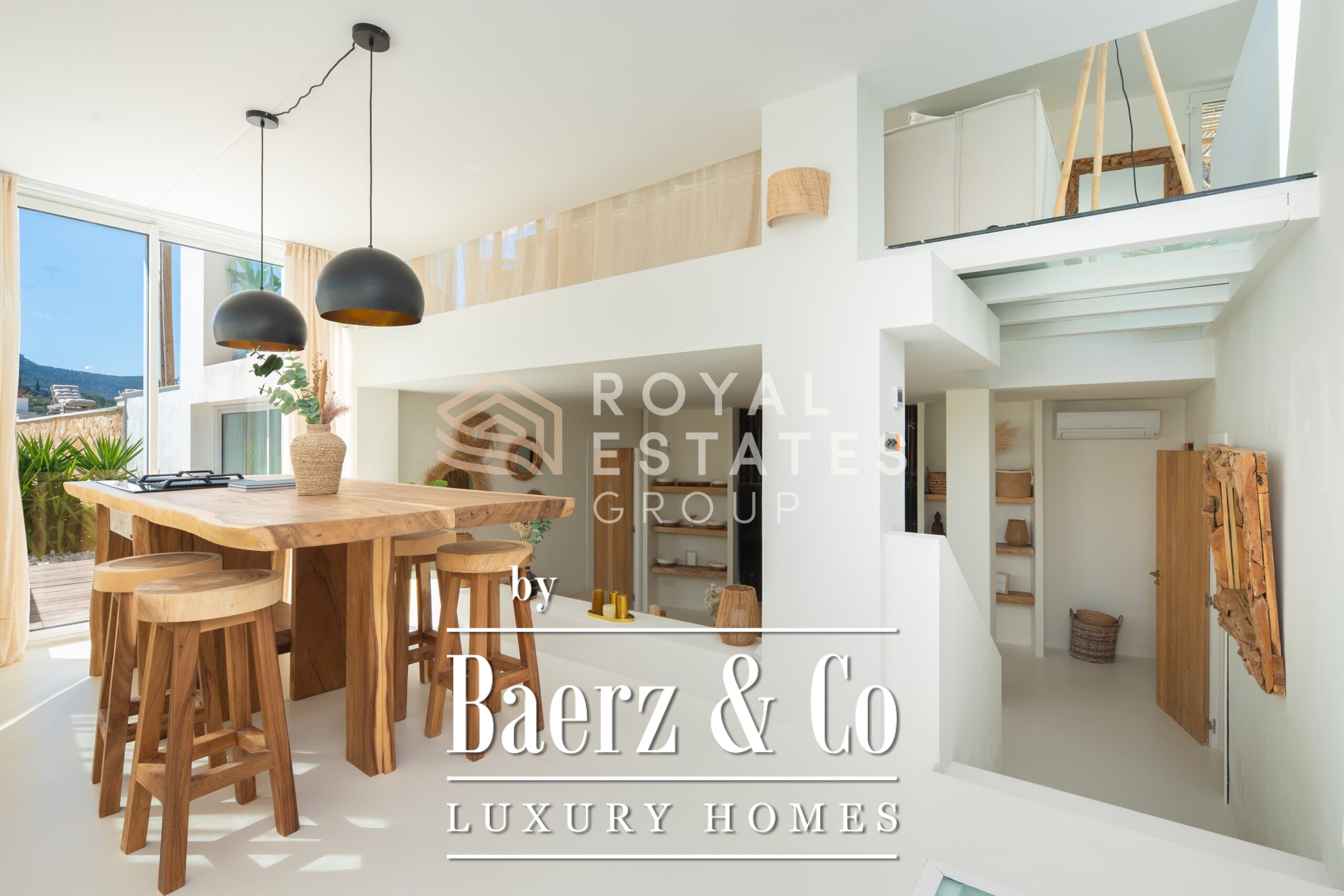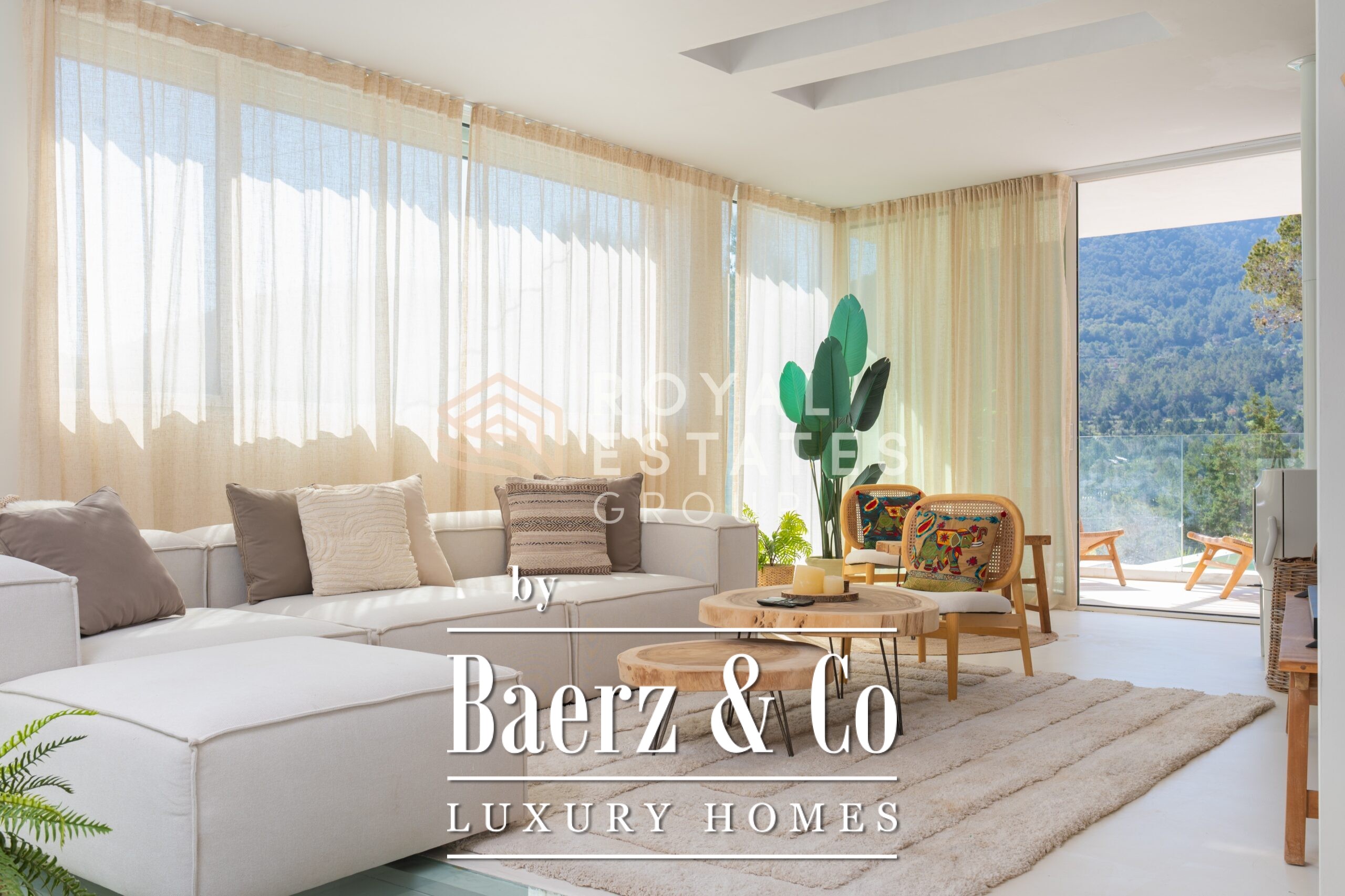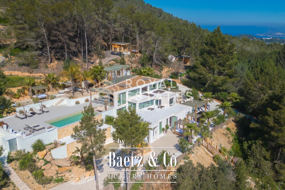 Villa San Jose with panoramic views sits quietly amid the green hills of western Ibiza, offering a rare sense of tranquillity and space. With a generous plot of 19,600 m² and a living area of 330 m², the villa ensures total privacy, surrounded by Mediterranean nature and rolling hills. Well-placed vantage points across the grounds showcase sweeping views over the landscape, with subtle glimpses of the distant sea.