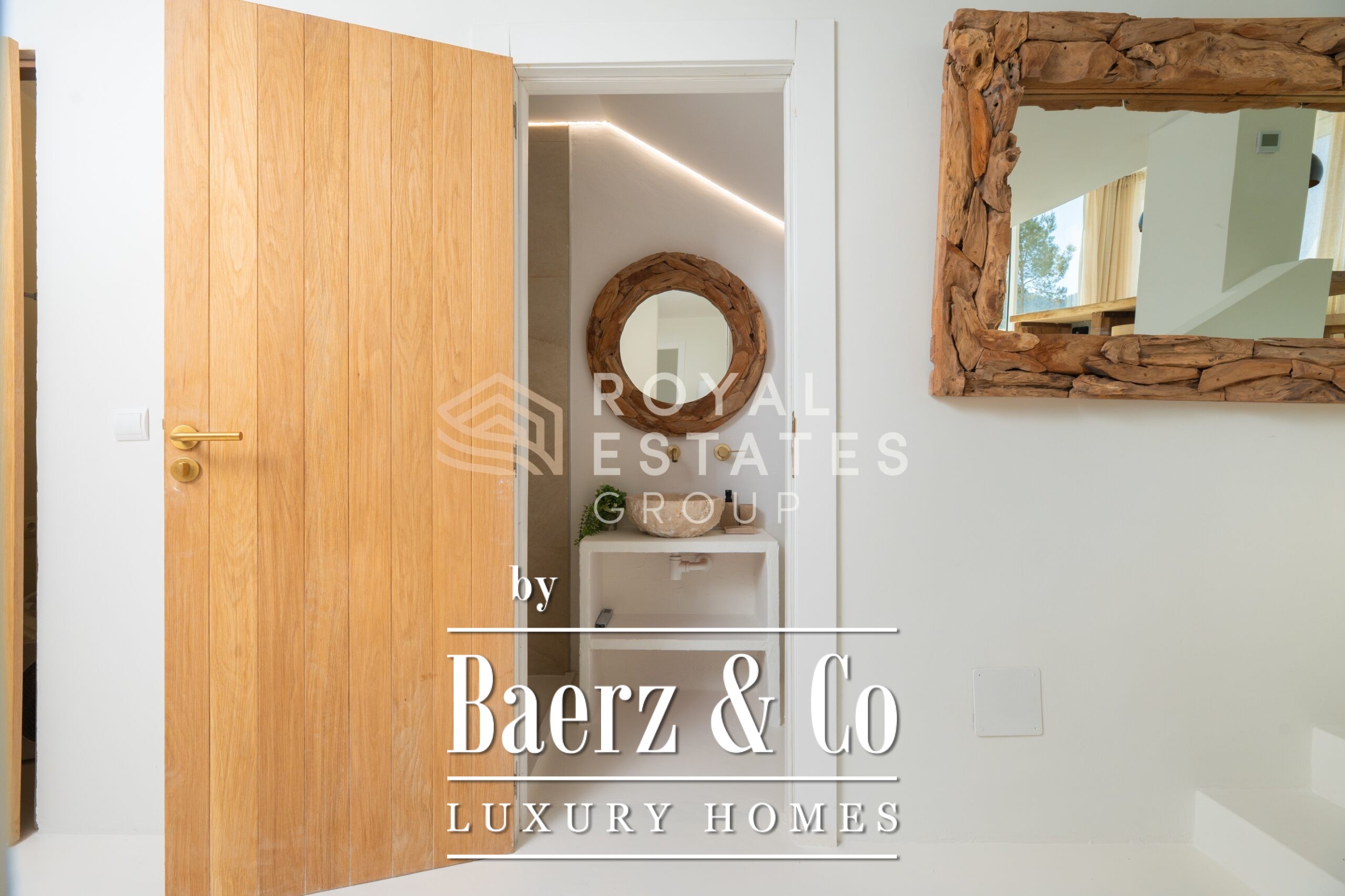 The main villa encompasses four bedrooms and three bathrooms, creating a purposeful balance between family living and guest accommodation. Expansive windows fill the interiors with light, fostering a seamless connection to the outdoors. Underfloor heating and air conditioning support comfort throughout the year. Refined amenities such as an indoor gym, sauna, jacuzzi, and a 20 m² wine cellar further define the experience, while technical features include solar panels, a 32 kW battery system, and a water tank from a shared natural source.