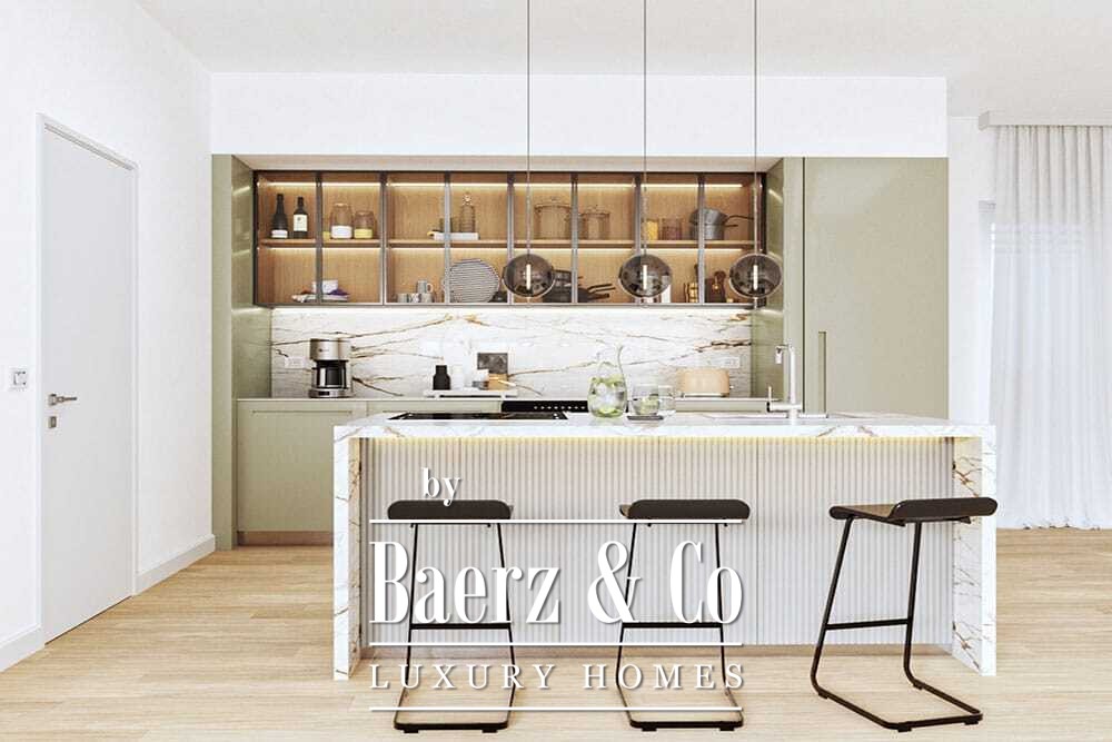 This building stands across four terraces and comprises just seven luxury apartments, including layouts of two bedrooms and two bathrooms within a living area of 123 m². The open living spaces are accentuated by balconies and a private garden, allowing natural light and sea air to shape the daily rhythm. Communal amenities feature manicured gardens and an elegant swimming pool set for relaxation or sociable gatherings, while elevator access and optional covered parking add discretion and ease.