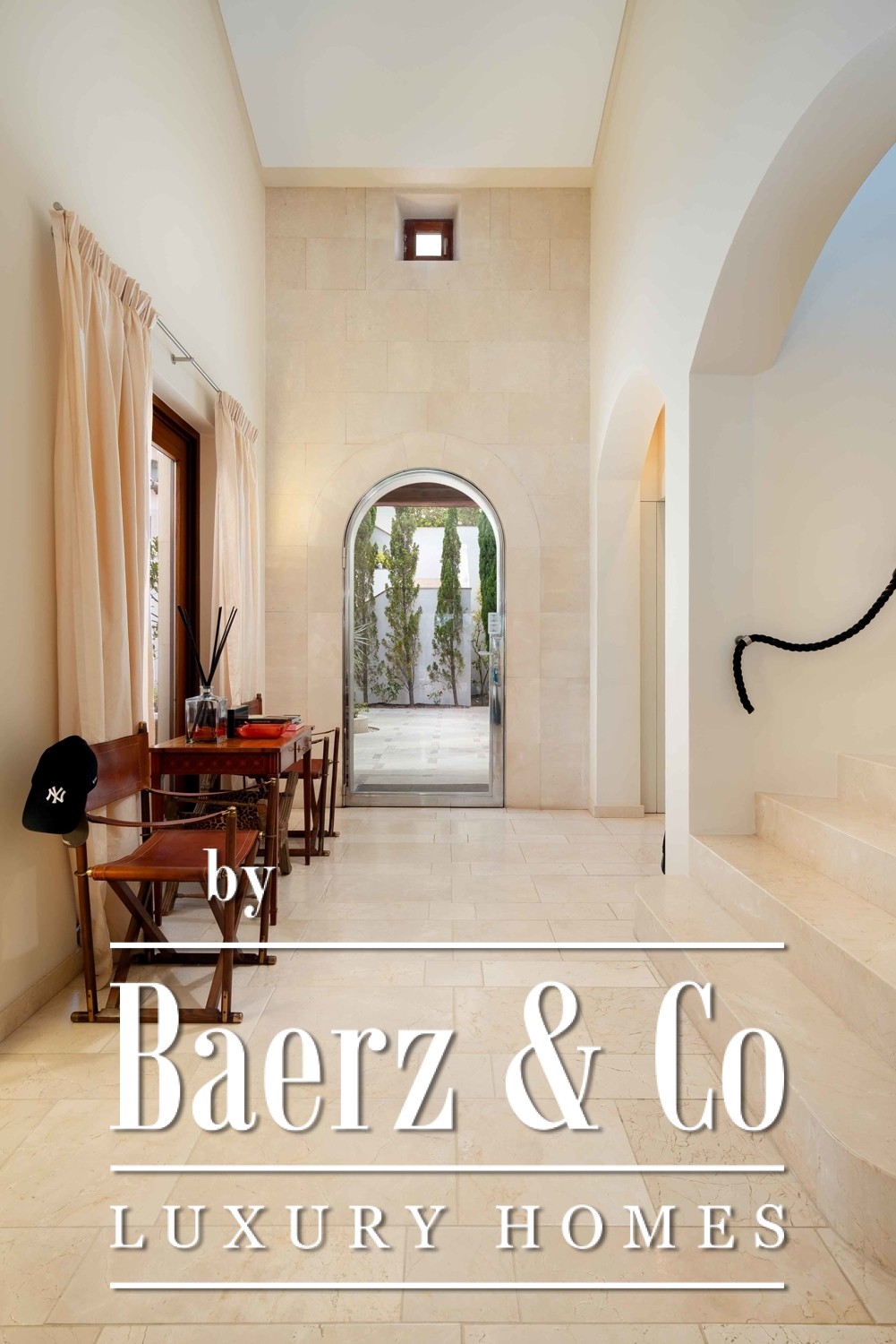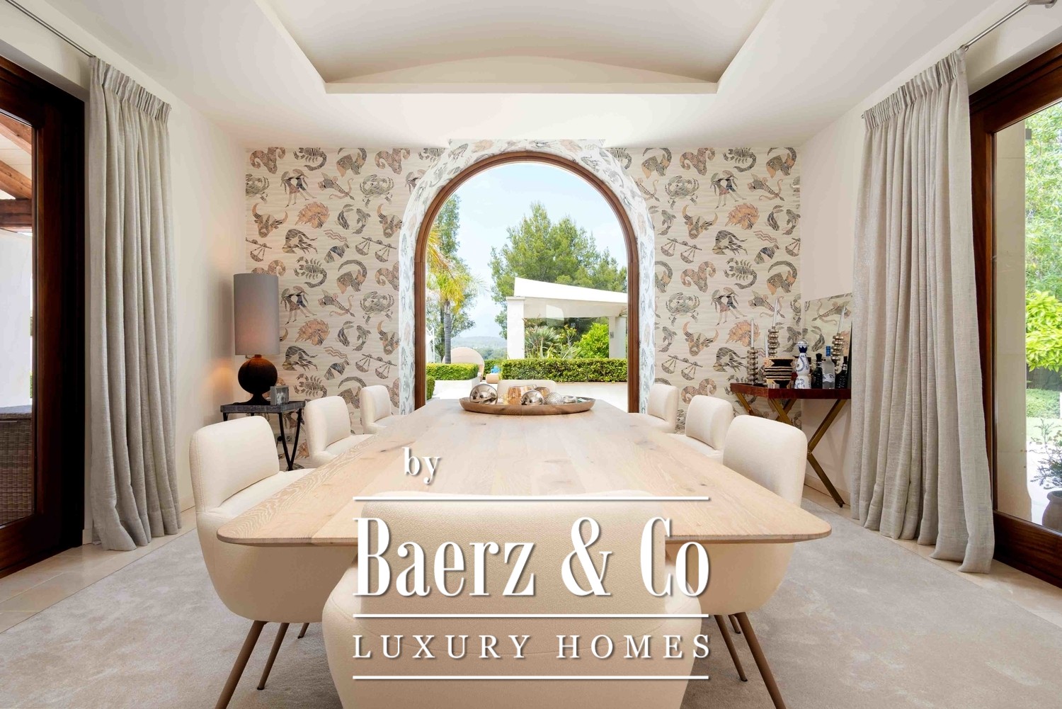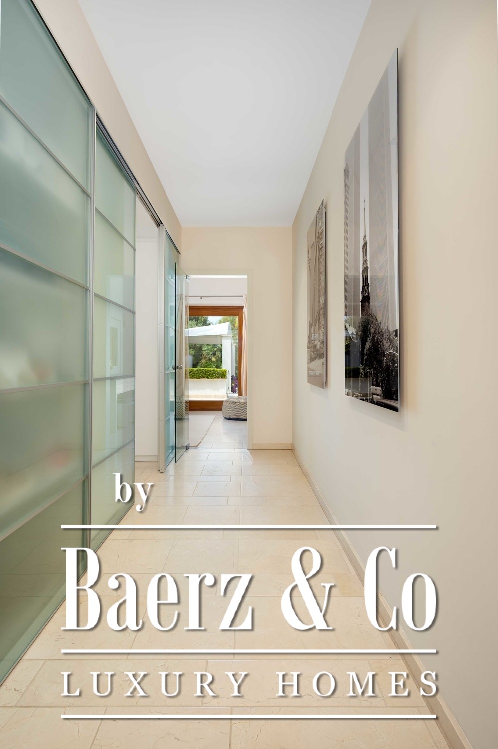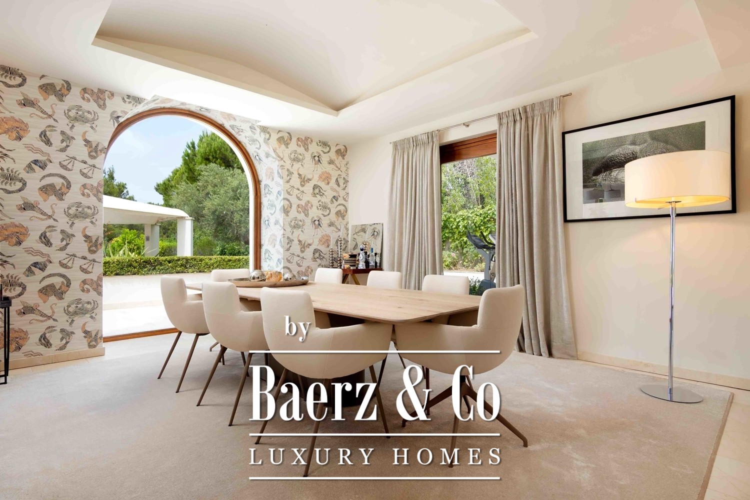 This luxury villa Santa Ponça is a statement of refined living within an exclusive gated community in Mallorca. Upon arrival, a private driveway unfolds through lush Mediterranean gardens, accommodating seven vehicles and an integrated electric charging station. The entrance signals both serenity and understated grandeur, inviting you into 851 m² of carefully composed interiors that allow light and space to define the experience.