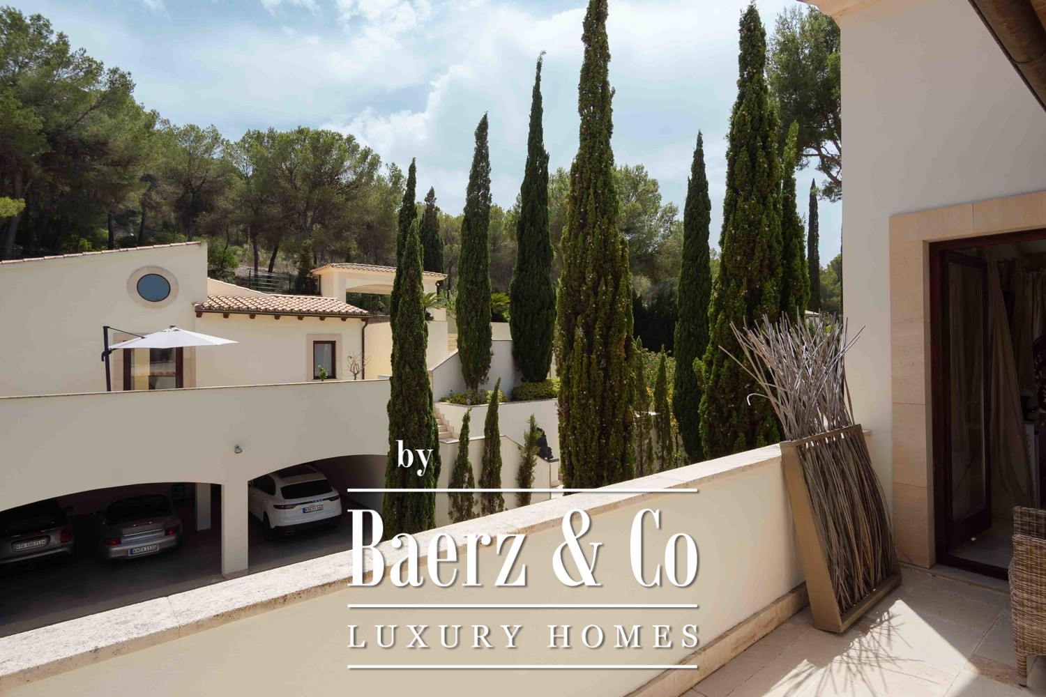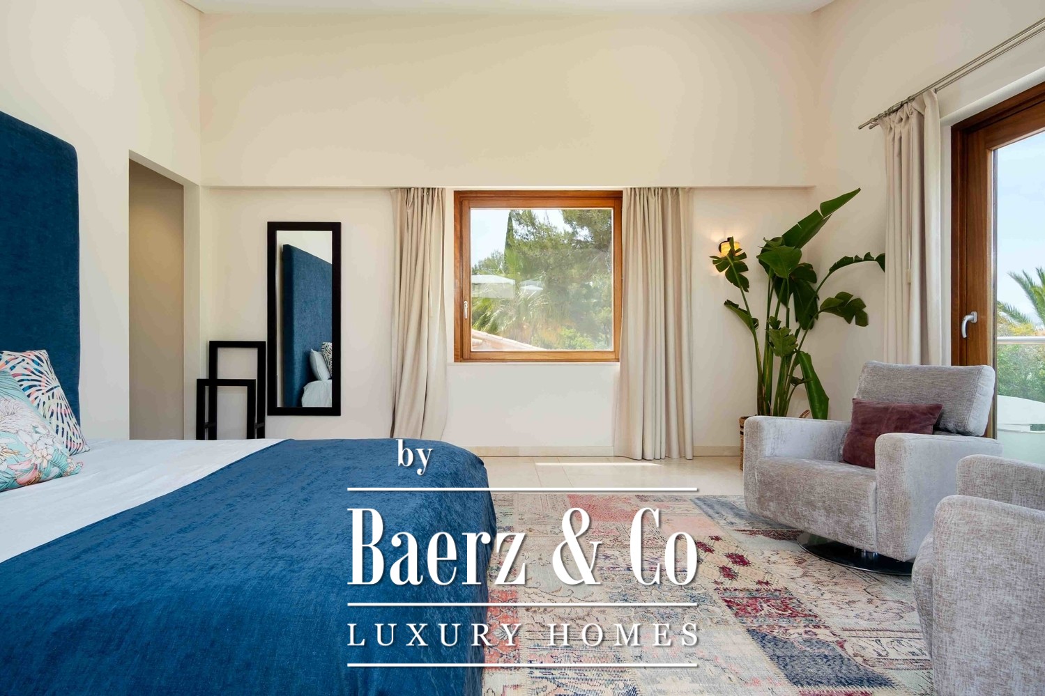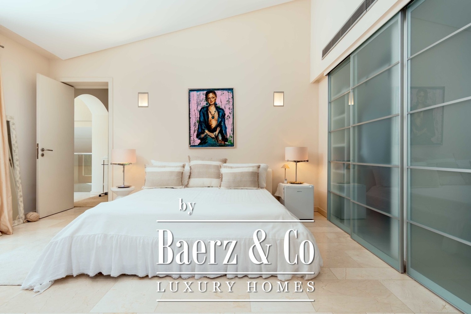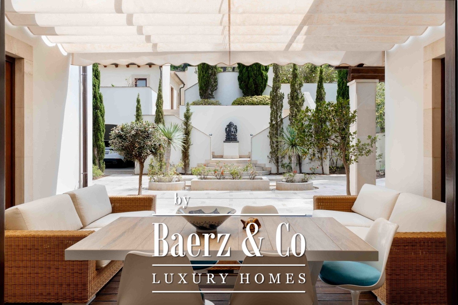 This luxury villa Santa Ponça is a statement of refined living within an exclusive gated community in Mallorca. Upon arrival, a private driveway unfolds through lush Mediterranean gardens, accommodating seven vehicles and an integrated electric charging station. The entrance signals both serenity and understated grandeur, inviting you into 851 m² of carefully composed interiors that allow light and space to define the experience.